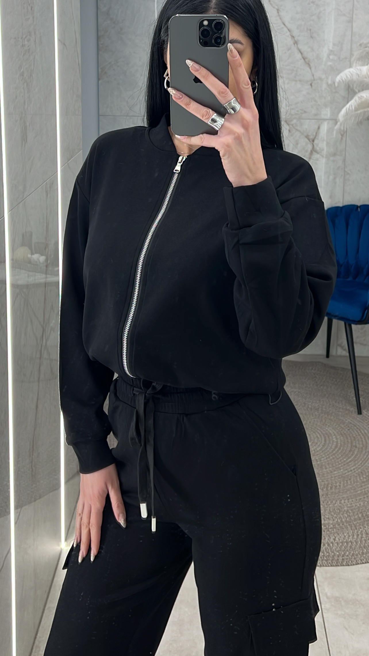 Σετ φόρμας Μao με ζακέτα που έχει λάστιχο στο τελείωμα της μέσης και παντελόνι με πλαϊνές και κανονικές τσέπες λάστιχο στη μέση και κορδόνι