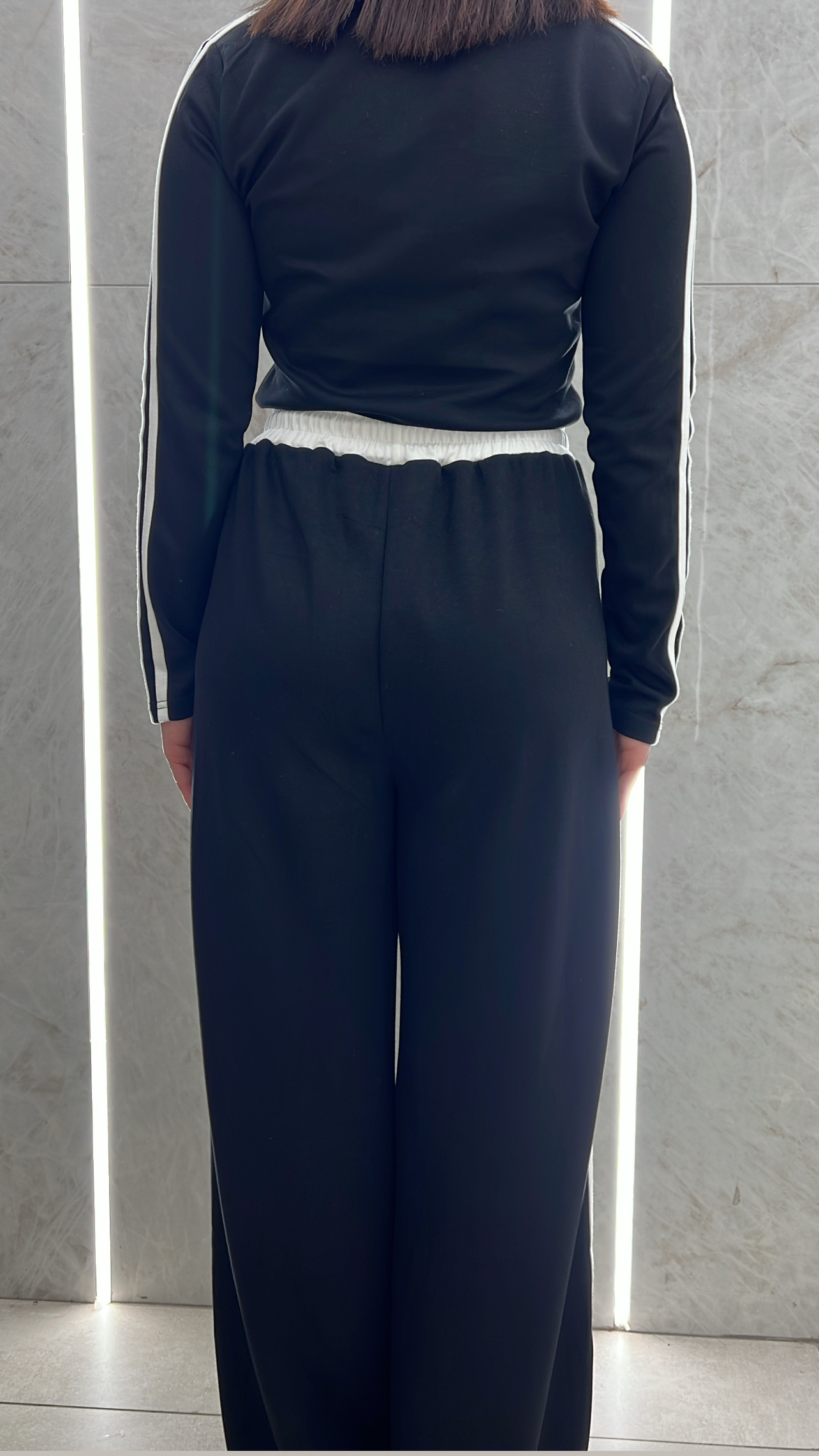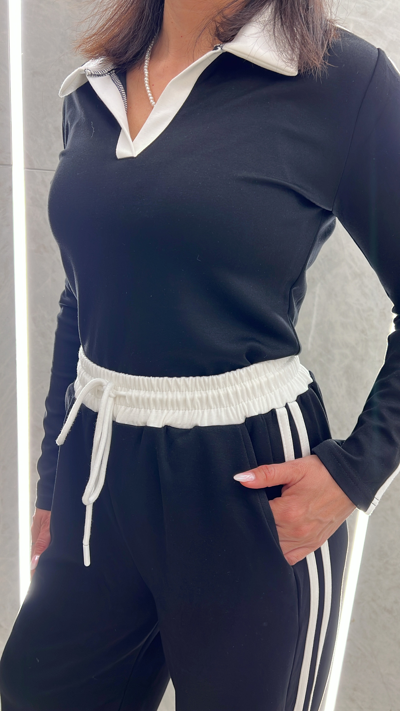 Σετ φόρμας με ριγα στο πλαι ,μπλουζα με γιακα και παντελόνι με κορδόνι ,λαστιχο και τσέπες στην μέση .