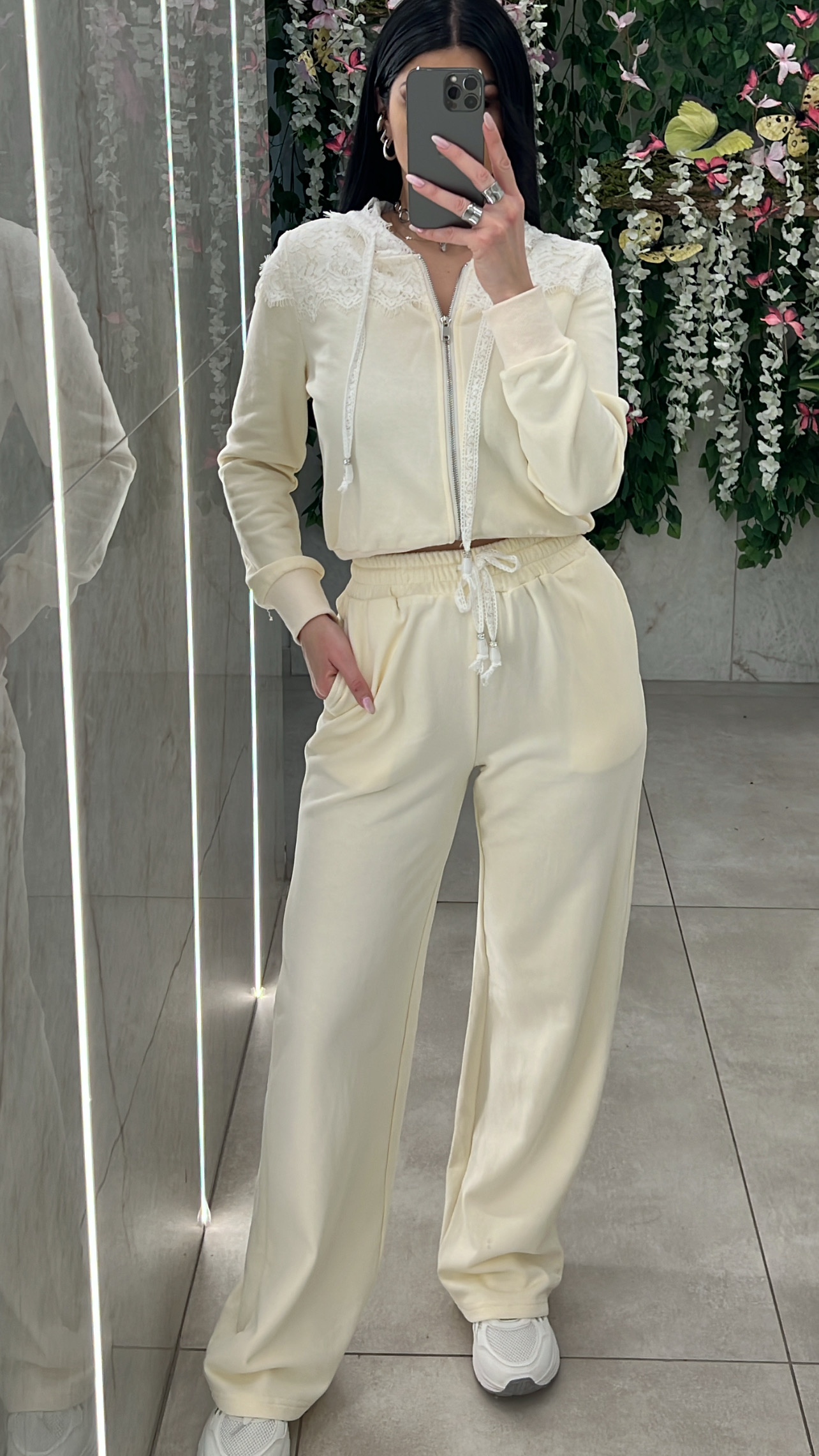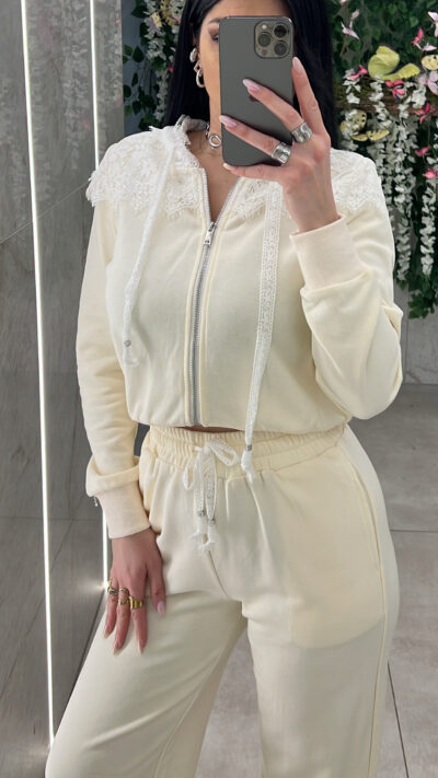 Σετ φόρμας , ζακέτα με κορδονια και κουκουλα απο δαντελα και παντελόνι με λάστιχο ,τσέπες και κορδονι δαντελα .