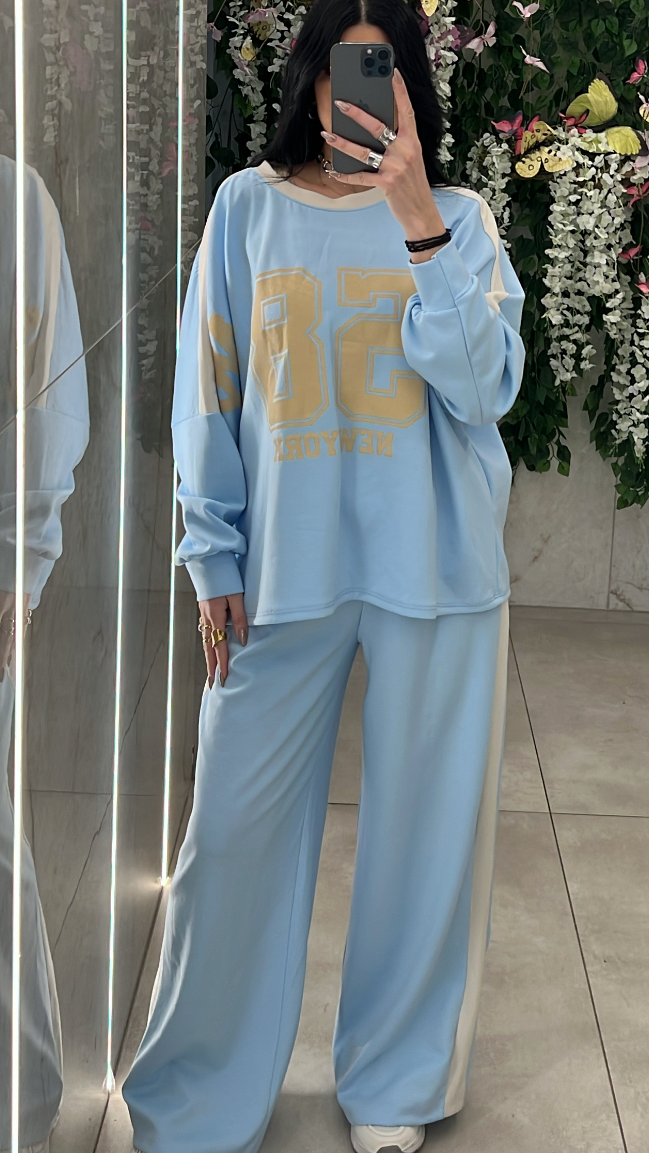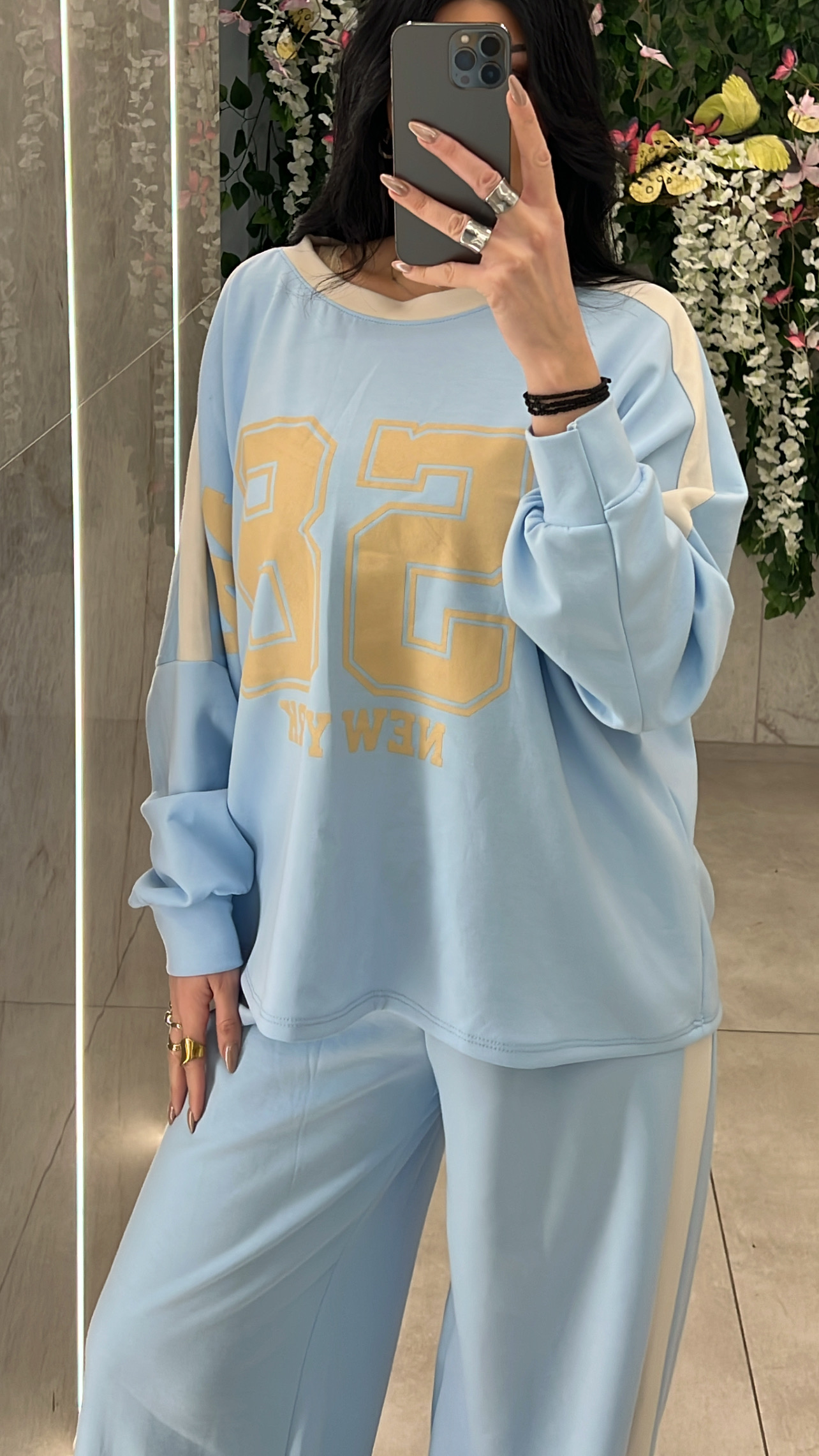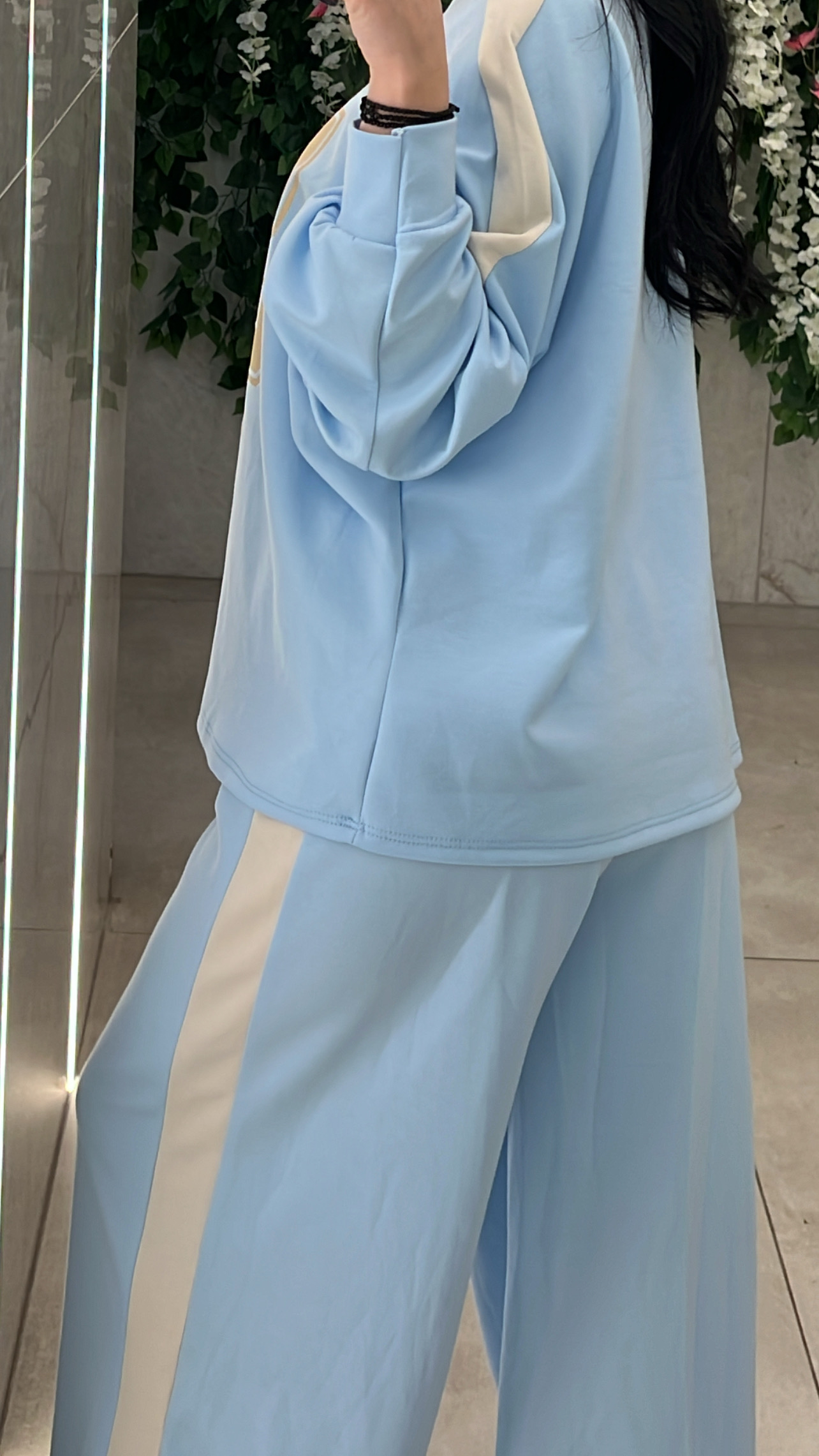 Σετ φορμας με σταμπα και ριγα στο πλάι , oversized μπλουζα και παντελονι με λάστιχο στην μέση .