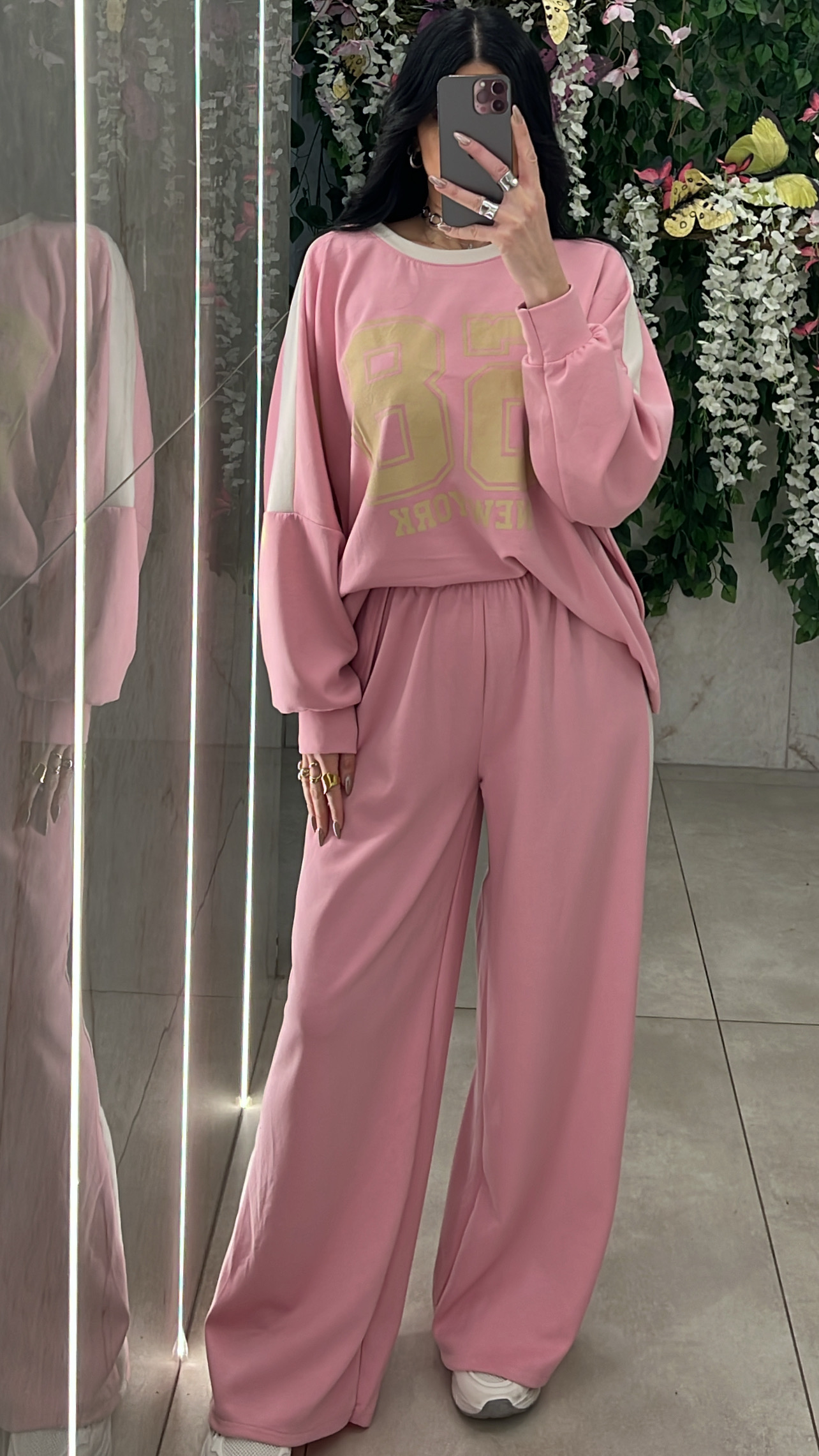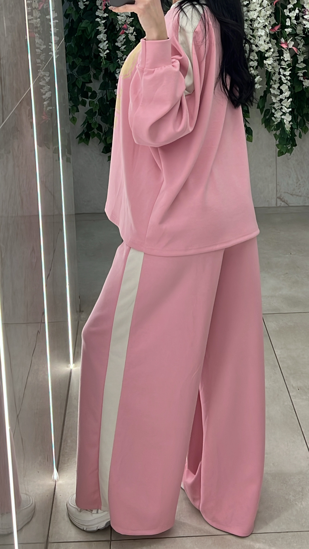 Σετ φορμας με σταμπα και ριγα στο πλάι , oversized μπλουζα και παντελονι με λάστιχο στην μέση .