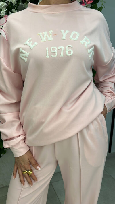Σετ φόρμας, μπλούζα με λογότυπο New York και σούρα στα μανίκια και φόρμα με λάστιχο στην μέση και τσέπες .