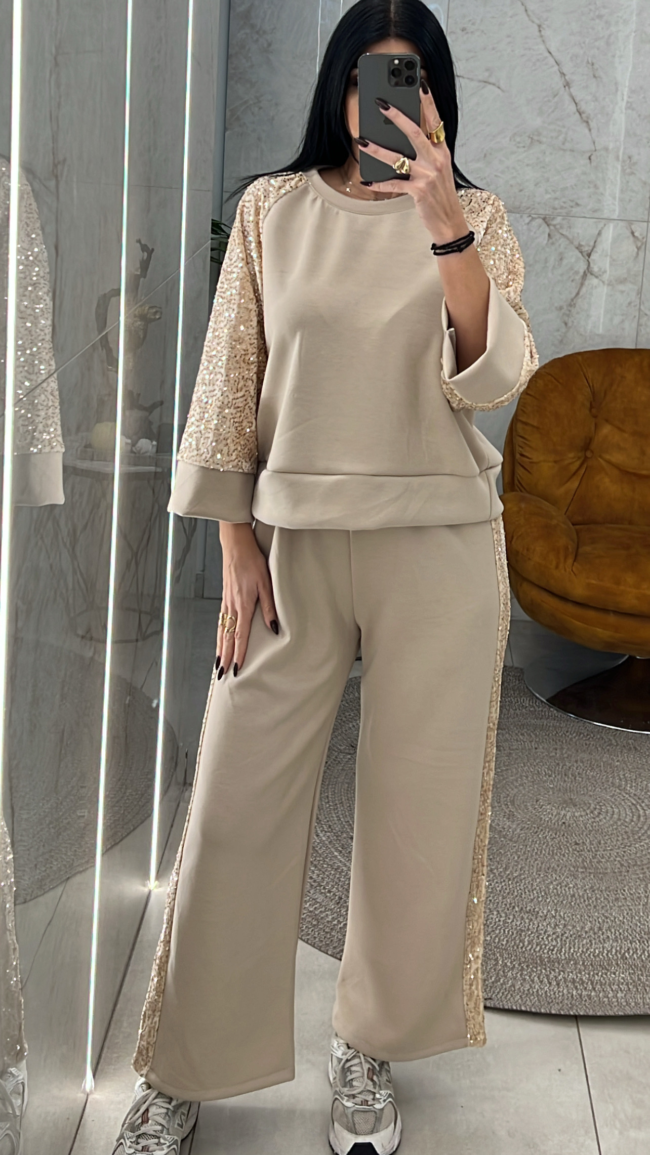 1. Σετ φόρμας  με παγιέτα σε όλο το μανίκι και στο πλάι του παντελονιού . Η μπλούζα έχει μανίκι με ελαφριά καμπάνα και το παντελόνι έχει λάστιχο στη μέση και είναι σε ίσια γραμμή και στο τελείωμα