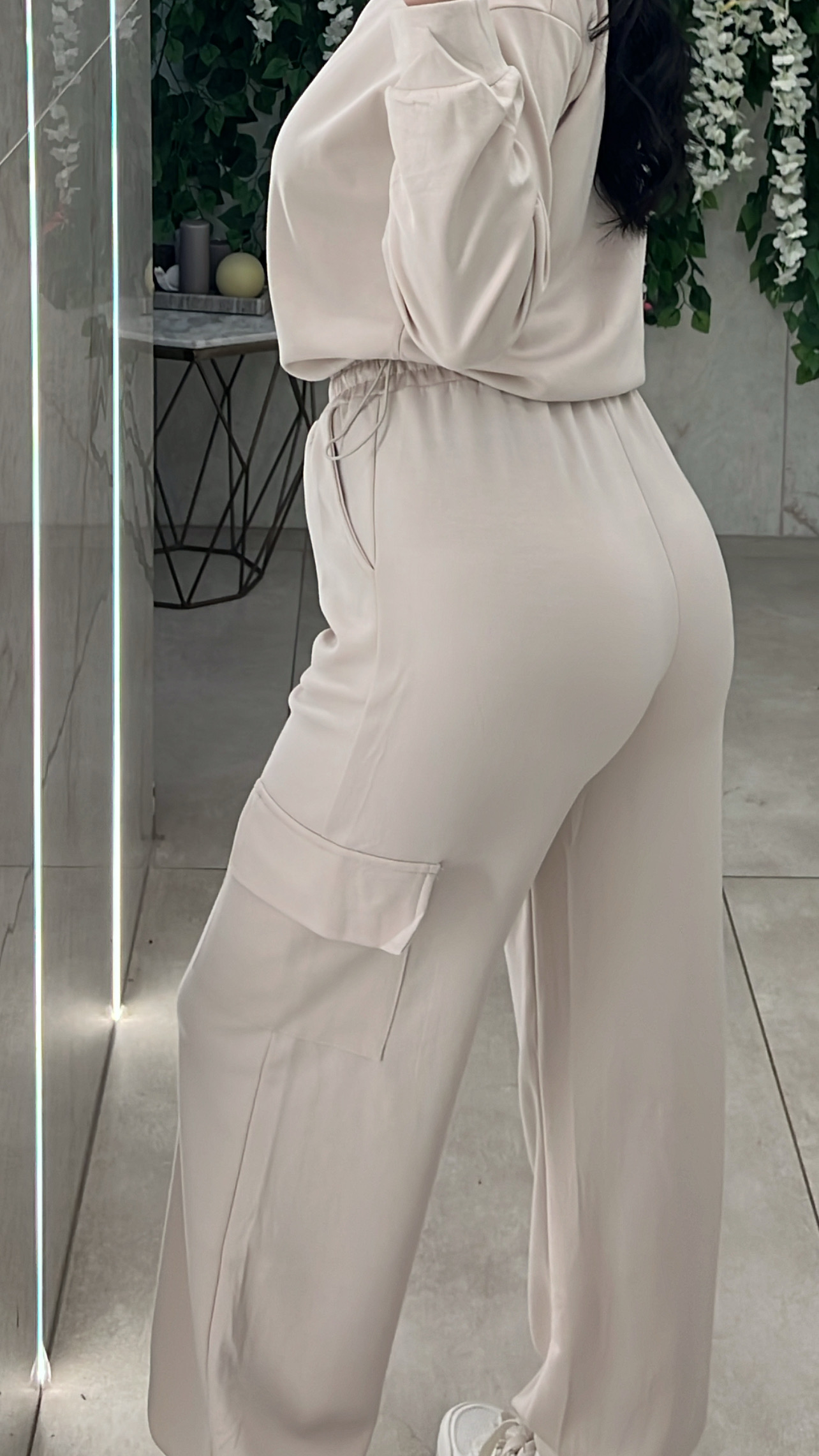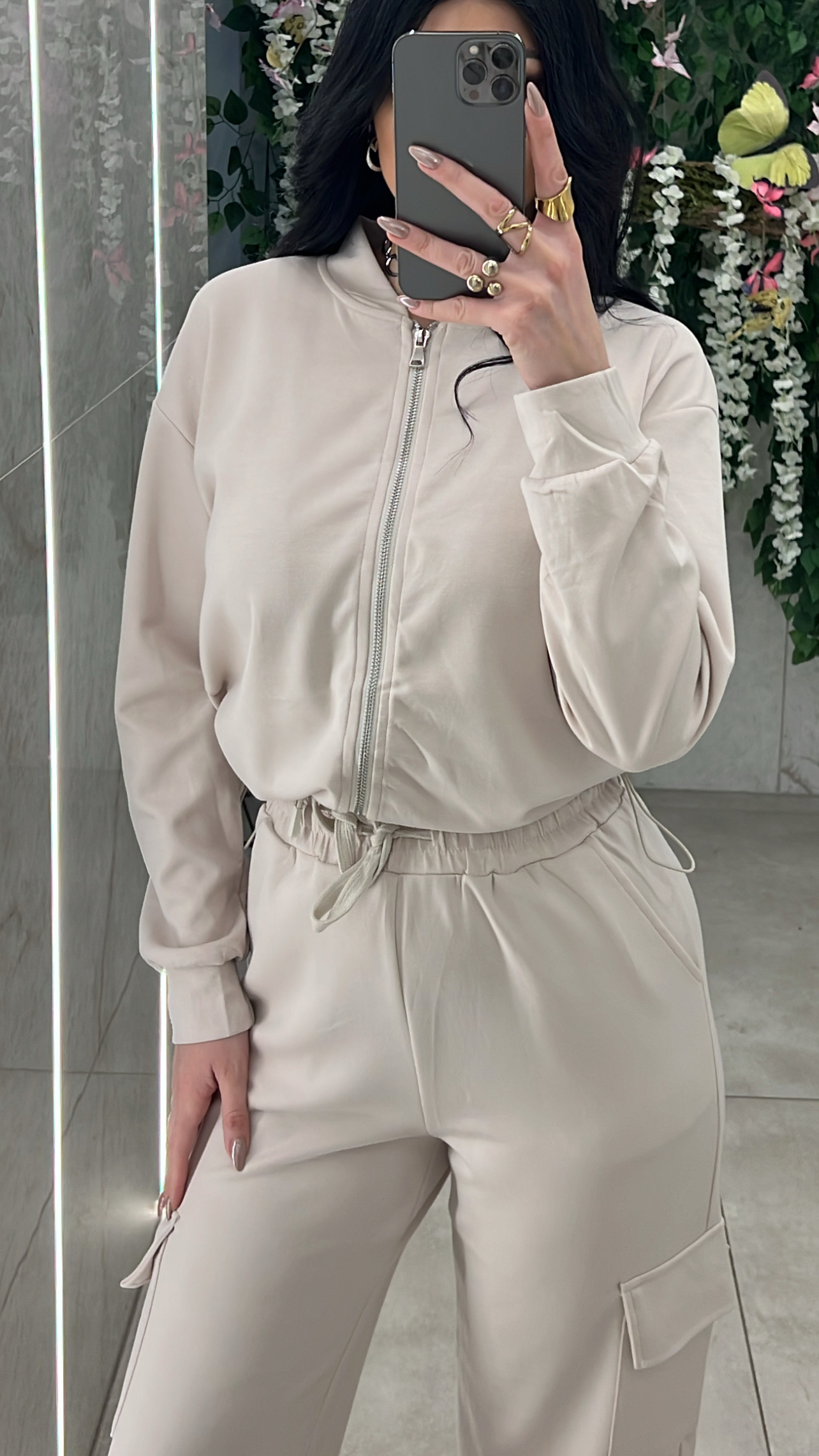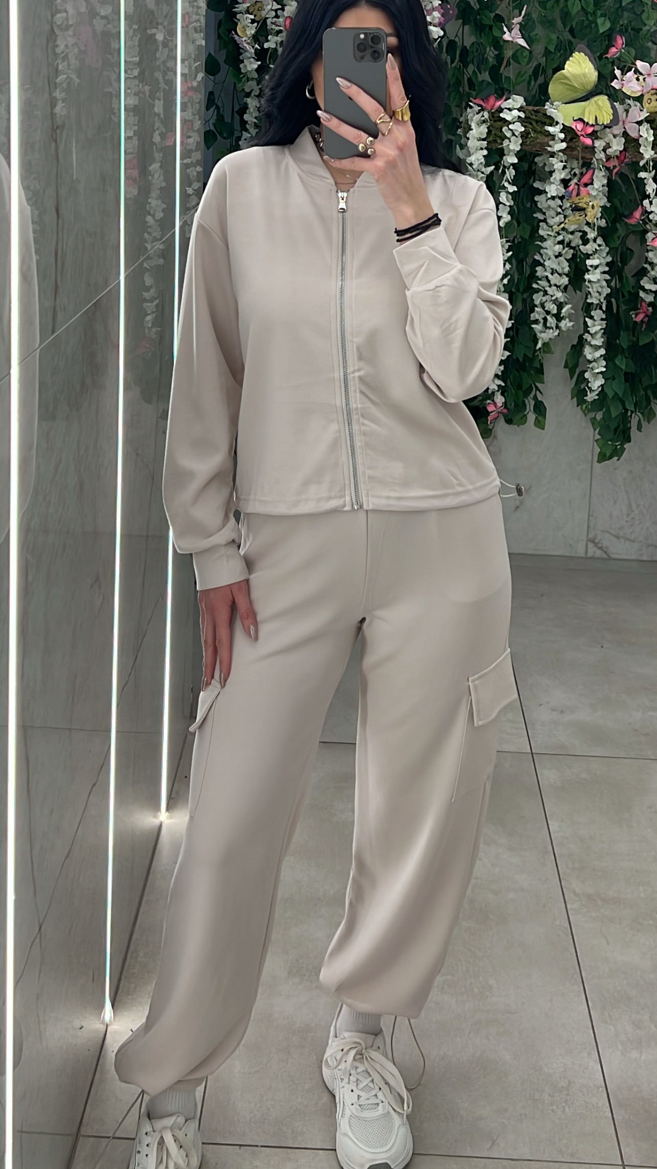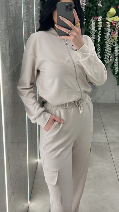 Σετ φόρμας ,ζακέτα με λαιμόκοψη ,χωρις κουκουλα ,με λάστιχο στο τελειωμα και φόρμα καργκο με κορδόνι ,τσέπες και λάστιχο στην μέση και στο τελειωμα .