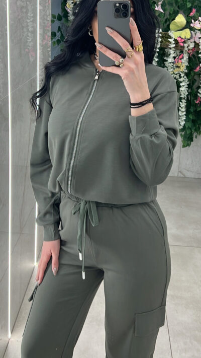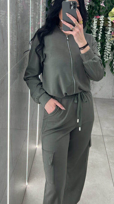 Σετ φόρμας ,ζακέτα με λαιμόκοψη ,χωρις κουκουλα ,με λάστιχο στο τελειωμα και φόρμα καργκο με κορδόνι ,τσέπες και λάστιχο στην μέση και στο τελειωμα .