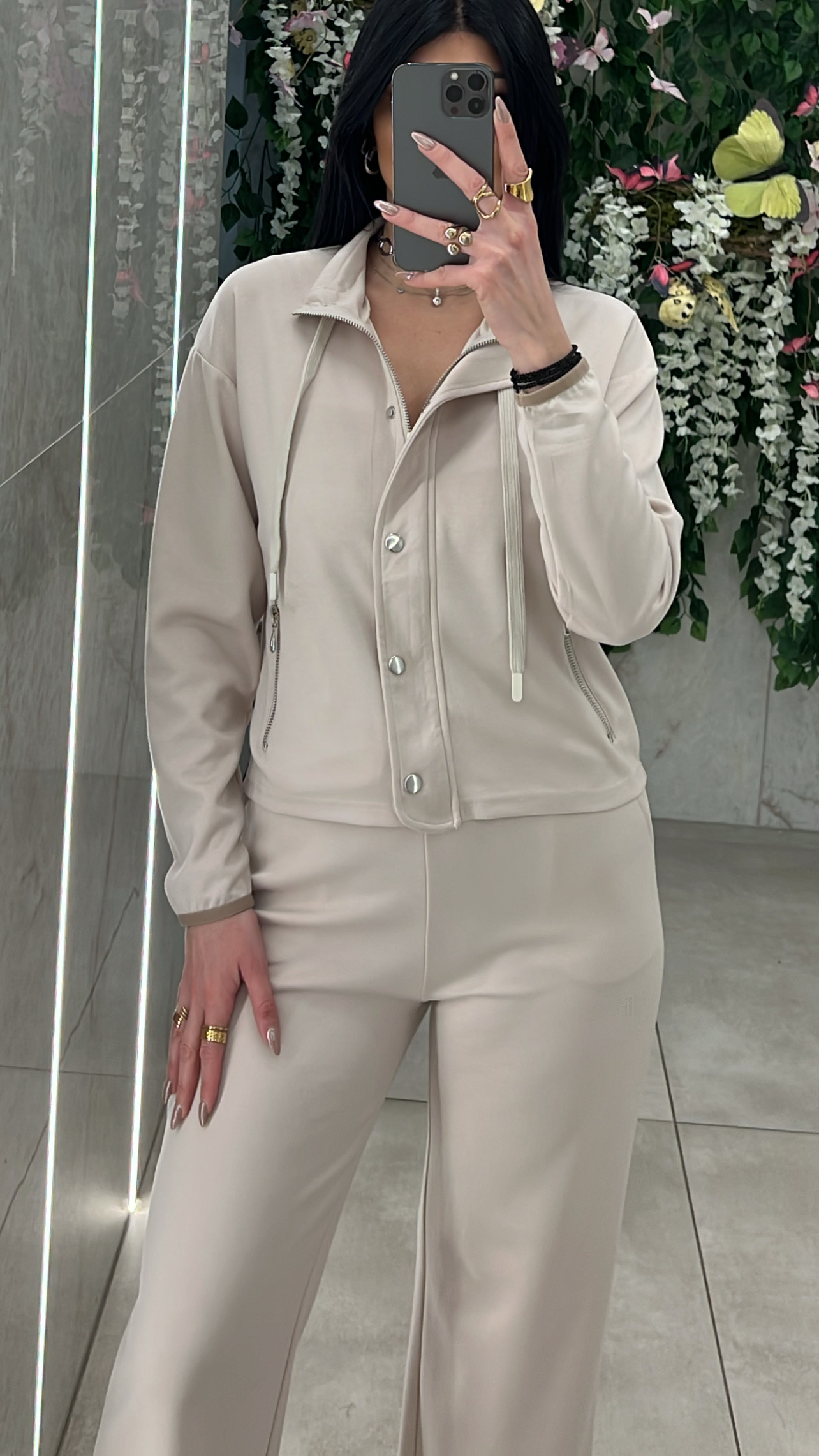 Σετ φορμας ,ζακετα διαθέτει κορδονι ,τσέπες ,κλεινει μ φερμουαρ και κουμπια και παντελονα με λάστιχο ,κορδονι και τσεπες στην  μεση .