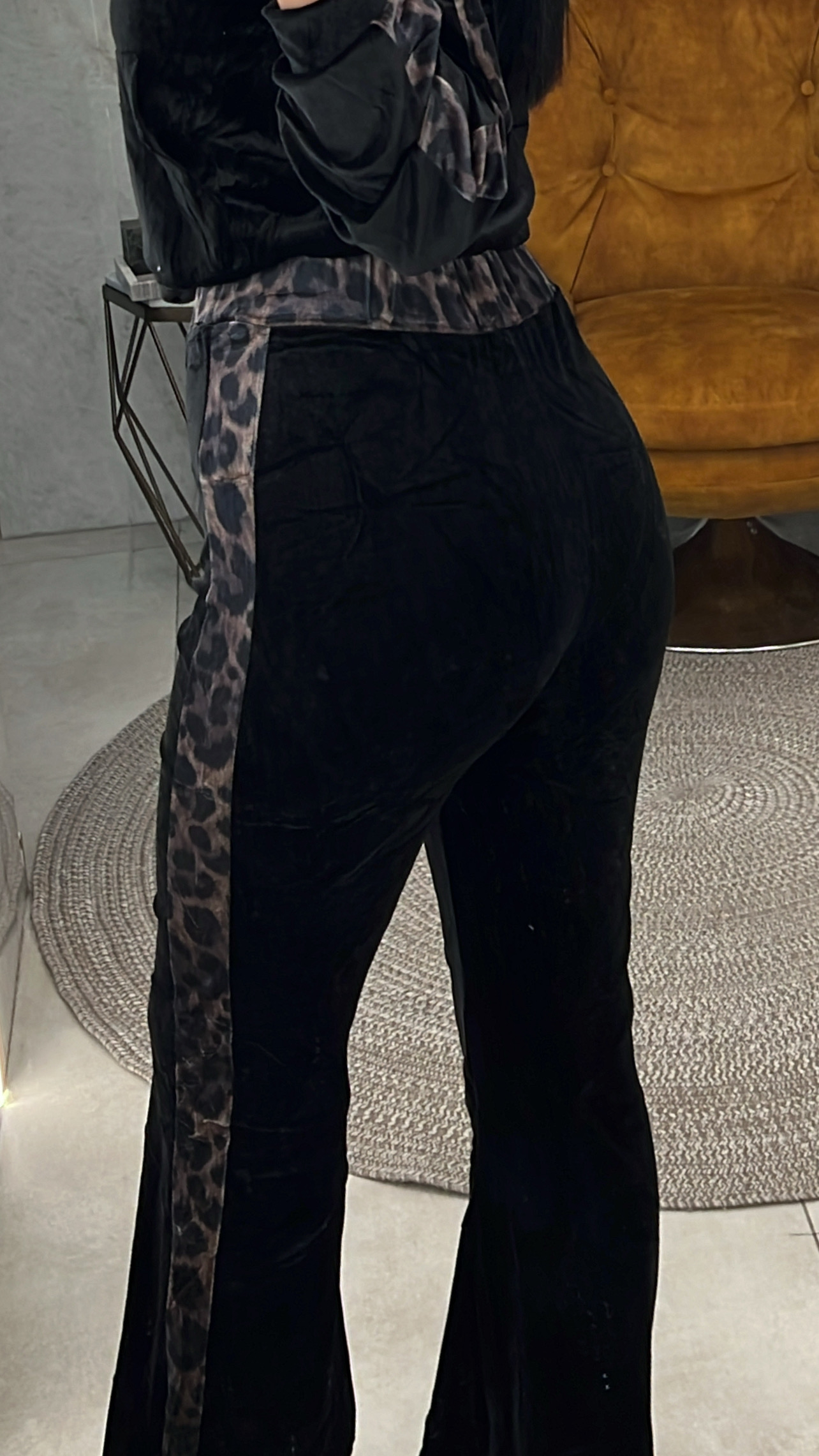 Φόρμα βελουτέ με ζακέτα και παντελόνι. Έχει λεοπάρ ρίγα στο πλάι και το παντελόνι διαθέτει λάστιχο στη μέση. Η ζακέτα διαθέτει τσέπες.
