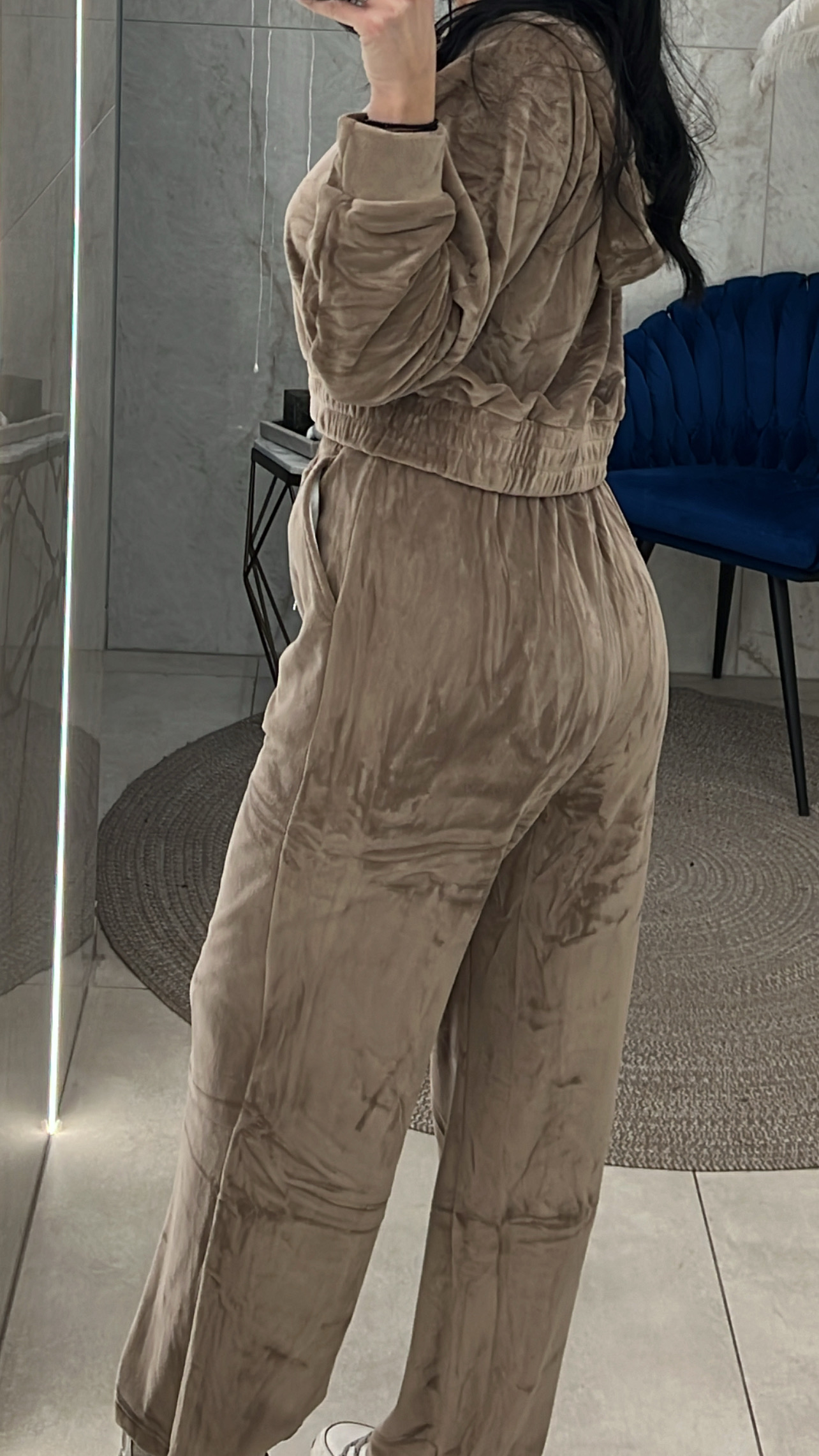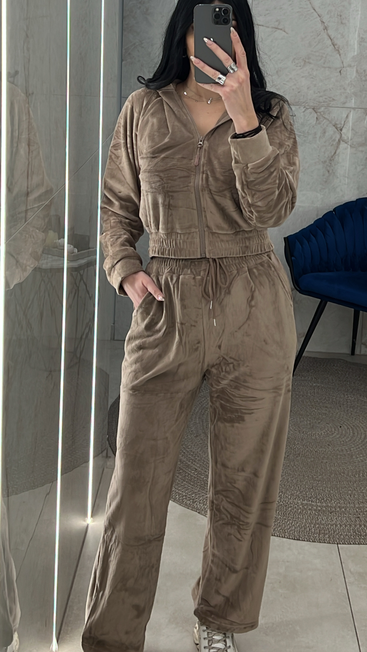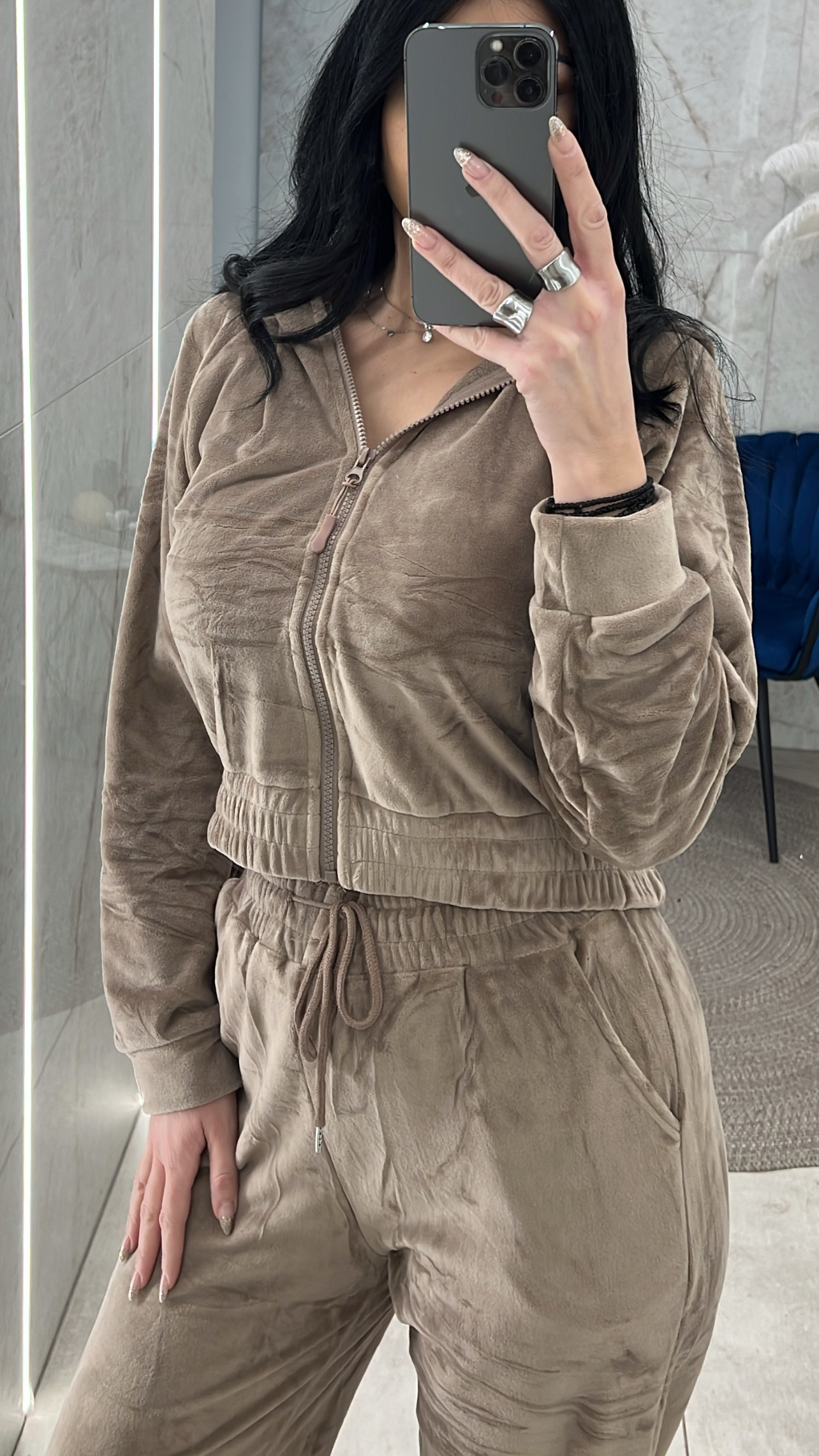Σετ φόρμας βελουτέ με επένδυση με ζακέτα που έχει κουκούλα και παντελόνι με λάστιχο στη μέση και κορδόνι
