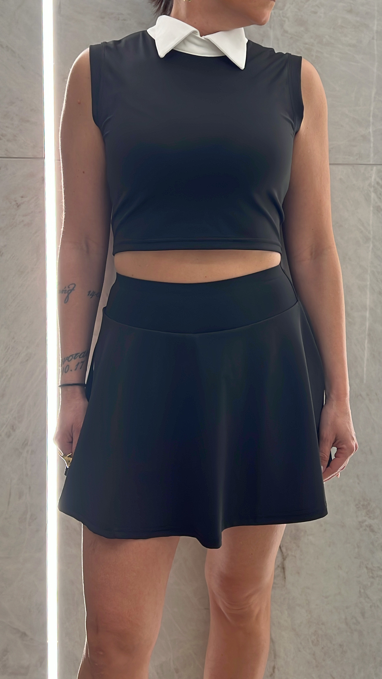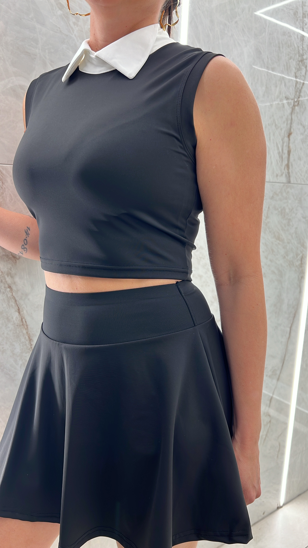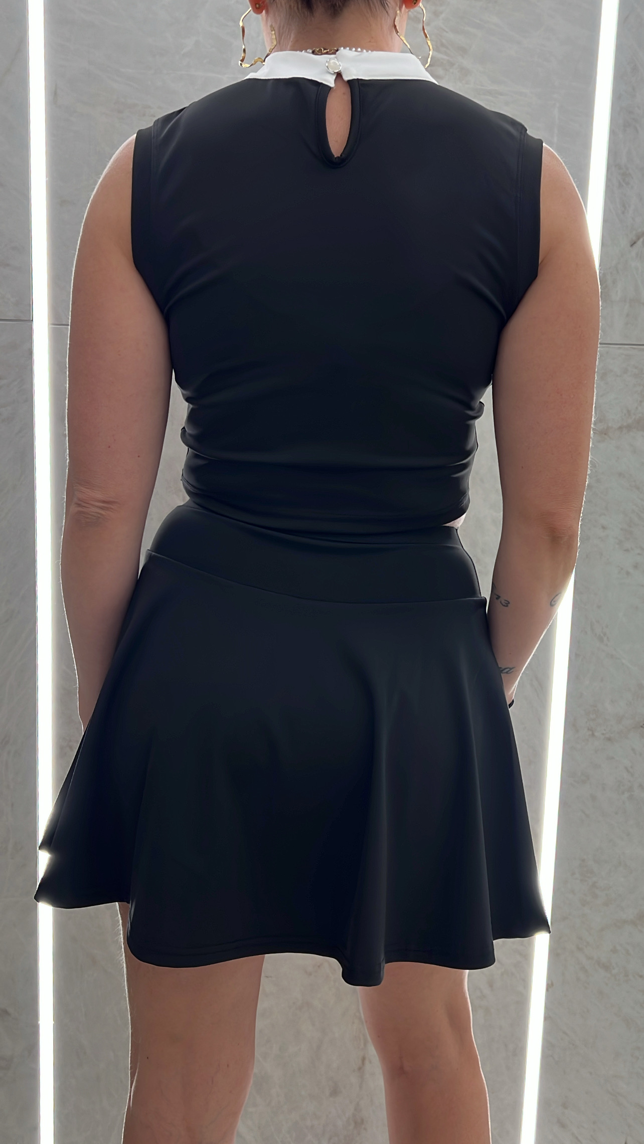 Σετ αποτελειται απο αμάνικο τοπ με γιακά ,κλεινει με κουμπι πισω απο τον λαιμο και φουστα με ενσωματομενο κολαν .