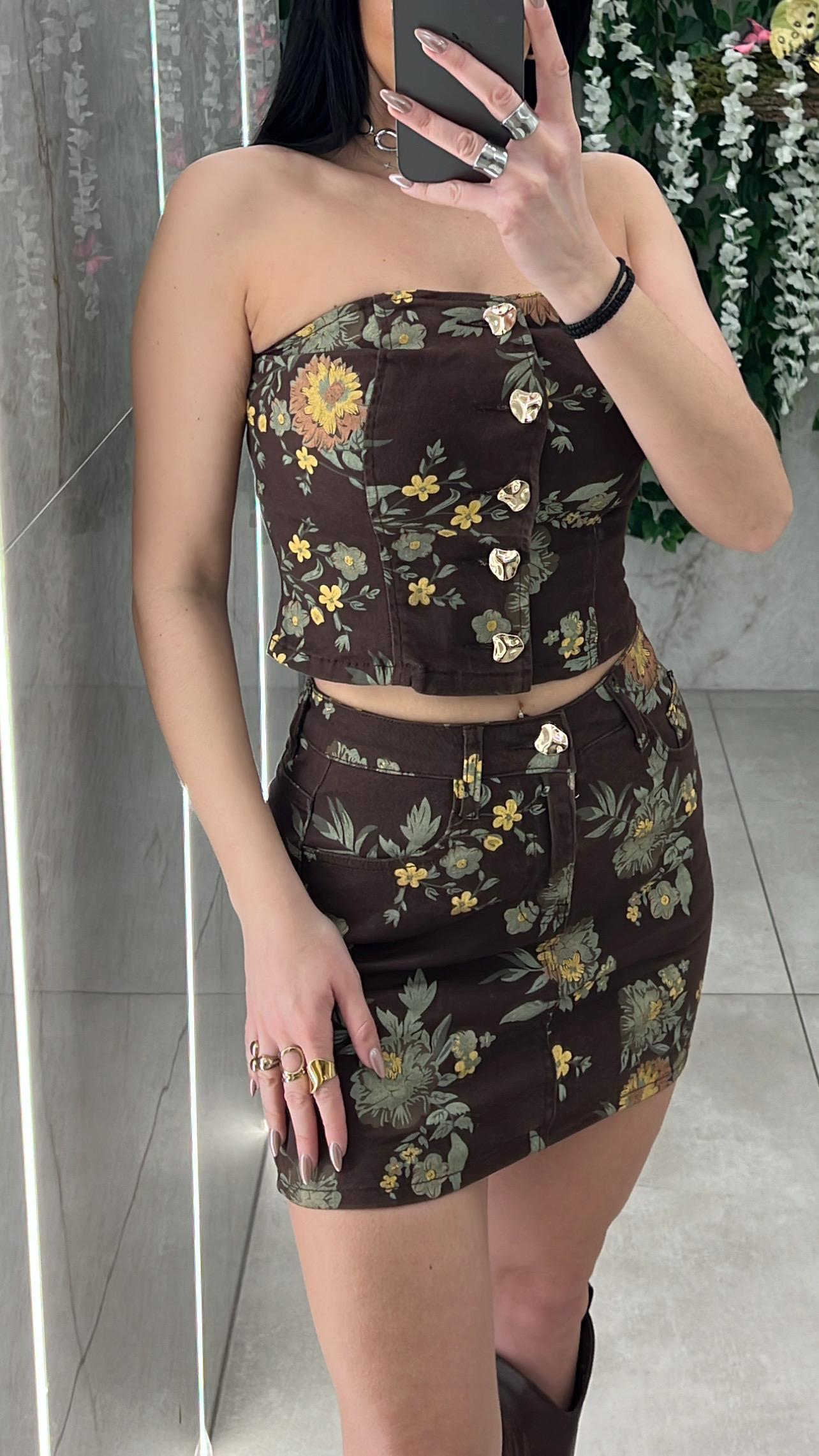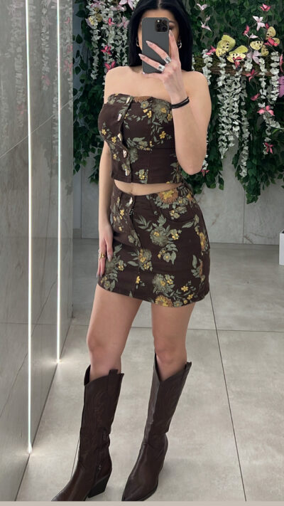 Σετ φουστα -τοπ φλοραλ  , τοπ στράπλες με κουμπια μπροστά και φουστα με τσέπες ,κλεινει με κουμπι .