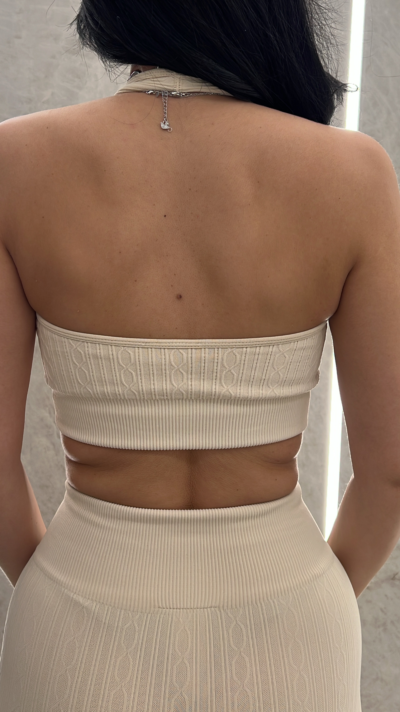 Σετ γυμναστικής αποτελούμενο απο 3 τεμάχια . Ζακέτα κοντή με κουκούλα και λεπτομέρεια στο τελείωμα των μανικιών , κολάν με λάστιχο στην μέση που κάνει καμπάνα στο τελείωμα και μπουστάκι ξώπλατο με κάπς στο στήθος .