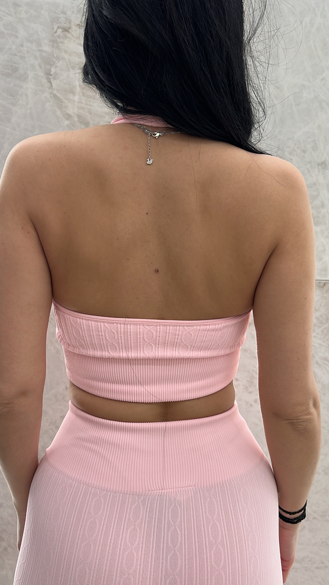 Σετ γυμναστικής αποτελούμενο απο 3 τεμάχια . Ζακέτα κοντή με κουκούλα και λεπτομέρεια στο τελείωμα των μανικιών , κολάν με λάστιχο στην μέση που κάνει καμπάνα στο τελείωμα και μπουστάκι ξώπλατο με κάπς στο στήθος .