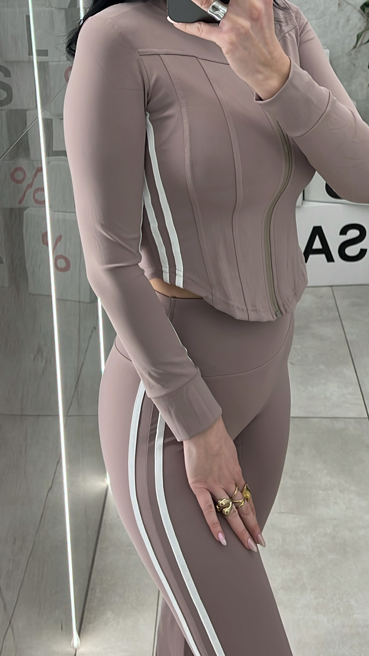 Σετ γυμναστικης με λευκές ρίγες στο πλάι, ψηλόμεσο κολάν καμπάνα και ζακετα .