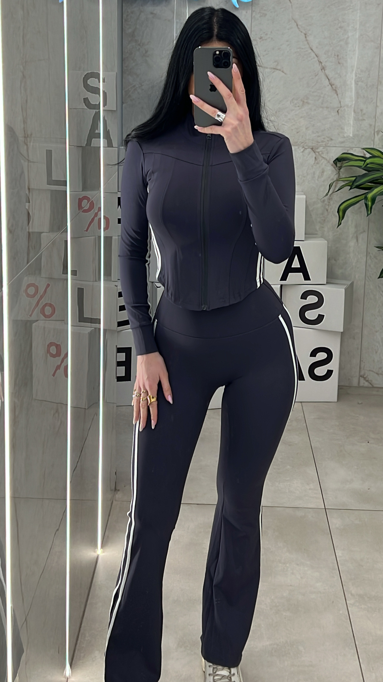 Σετ γυμναστικης με λευκές ρίγες στο πλάι, ψηλόμεσο κολάν καμπάνα και ζακετα .