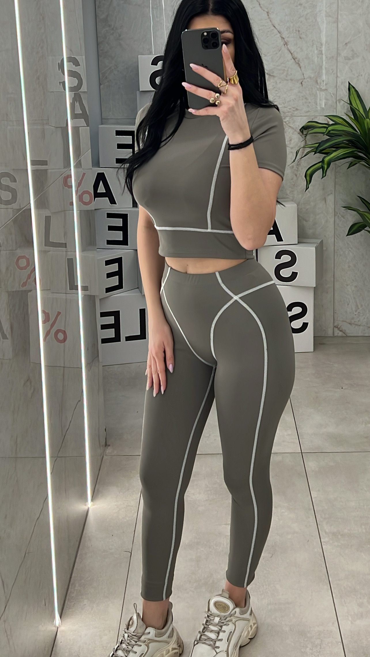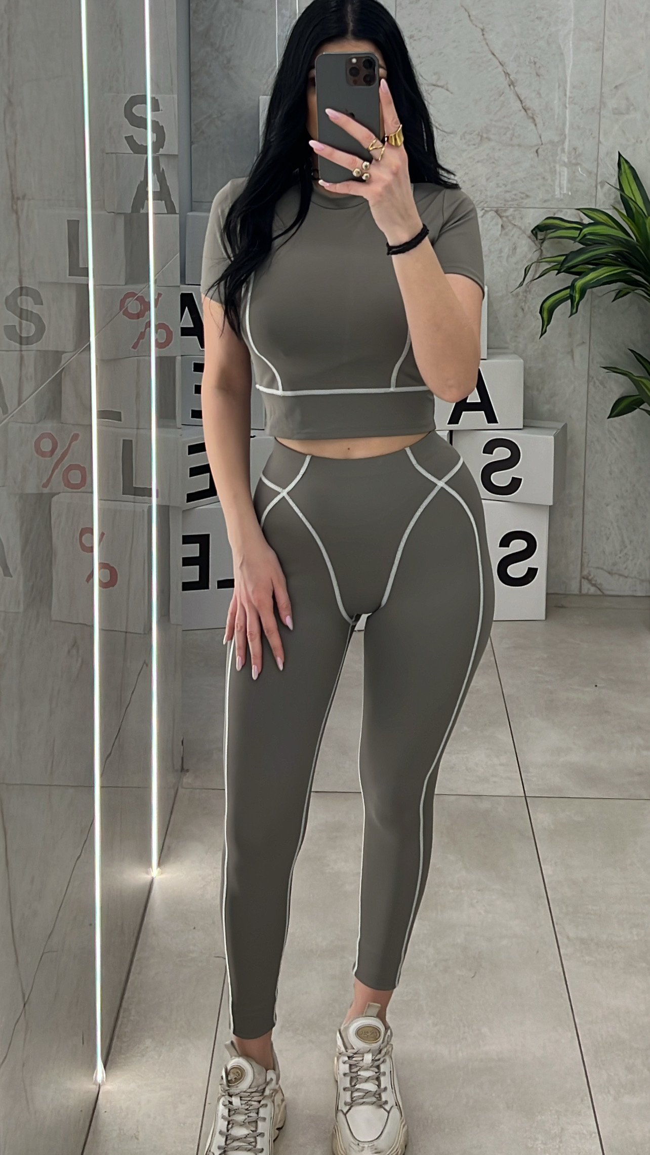 Σετ γυμναστικής με εντονες ραφές ,κολάν ψηλόμεσο και μπλούζα κοντή .