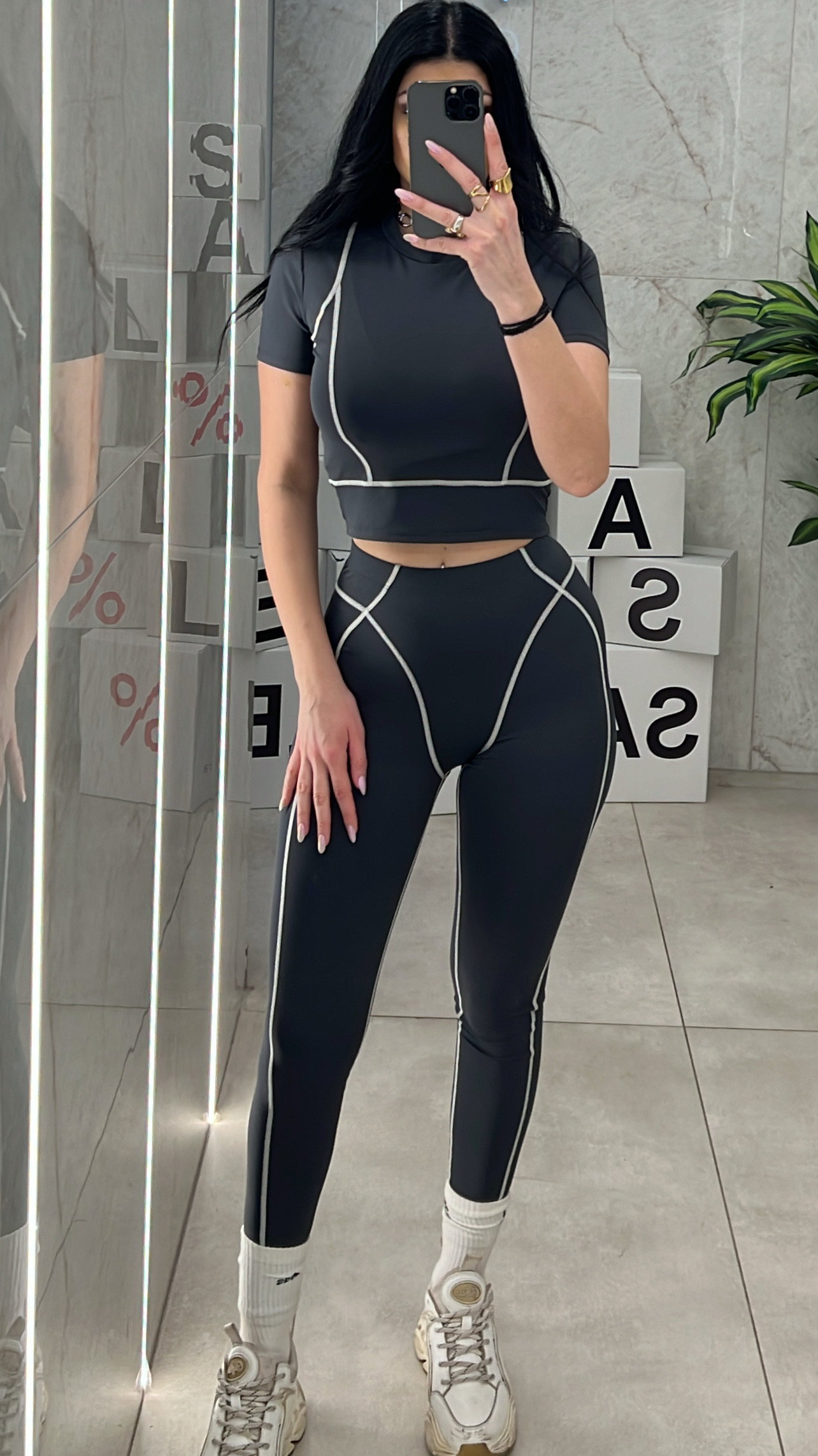 Σετ γυμναστικής με εντονες ραφές ,κολάν ψηλόμεσο και μπλούζα κοντή .