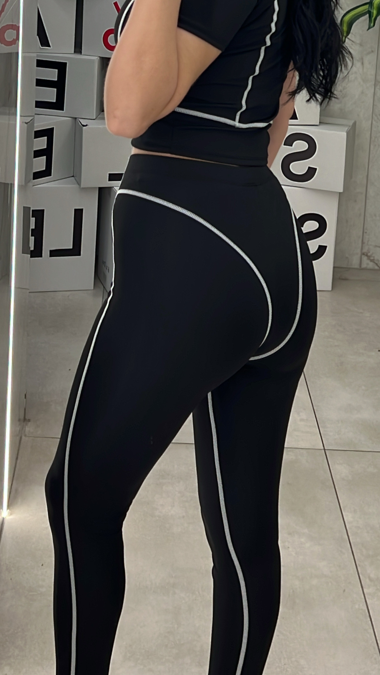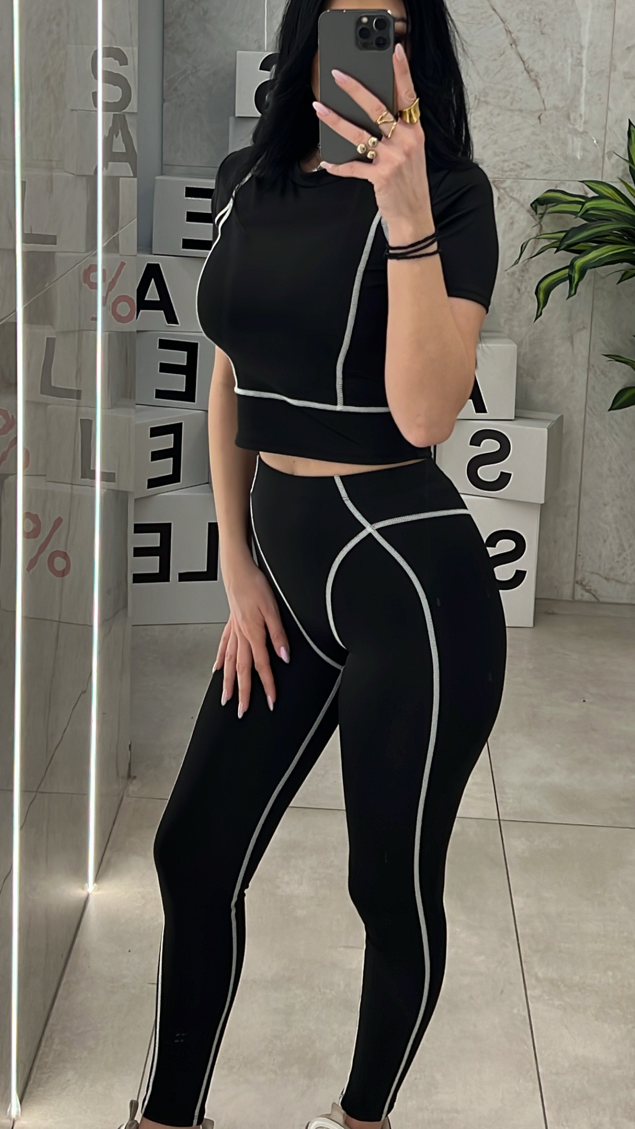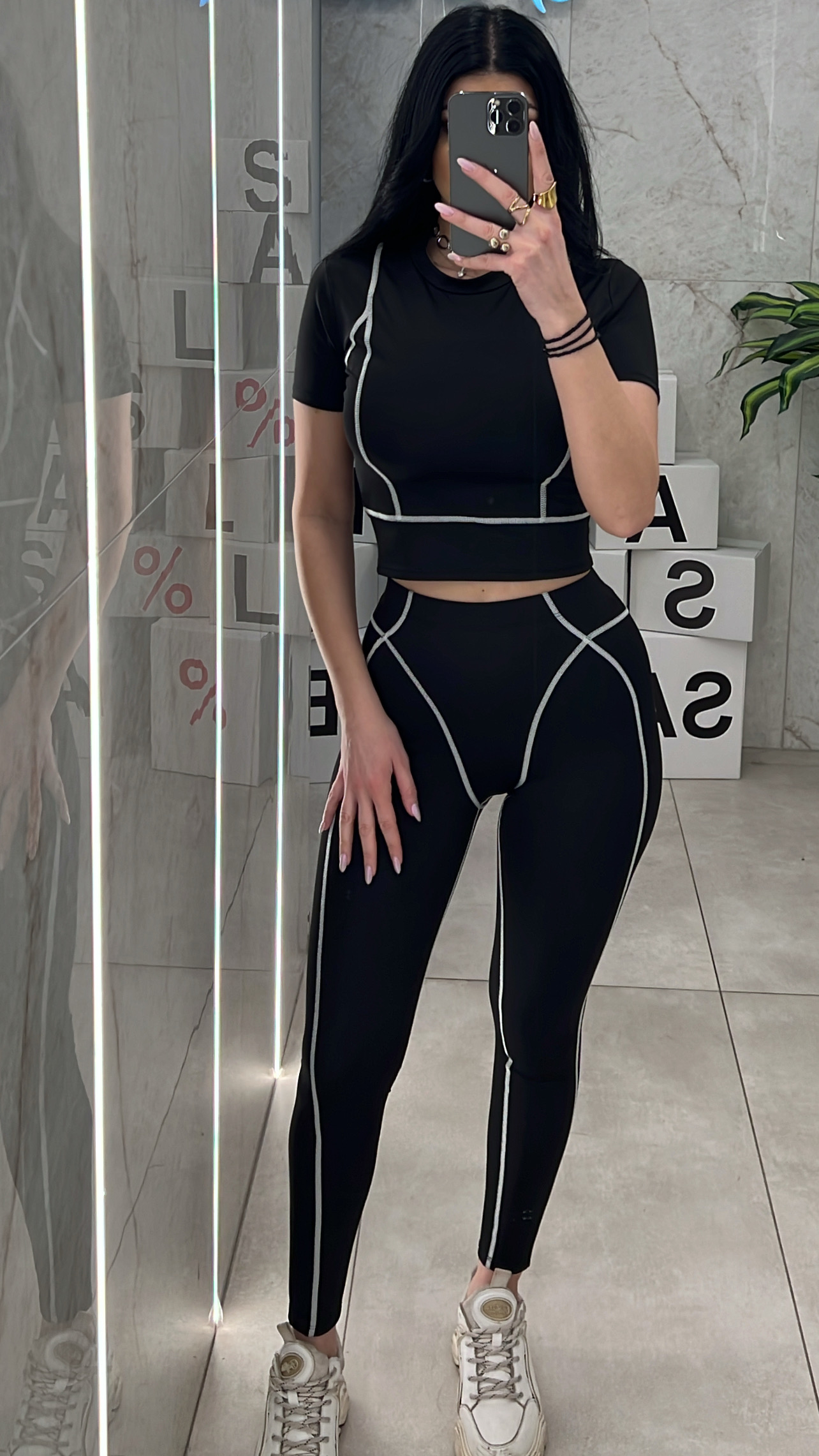 Σετ γυμναστικής με εντονες ραφές ,κολάν ψηλόμεσο και μπλούζα κοντή .