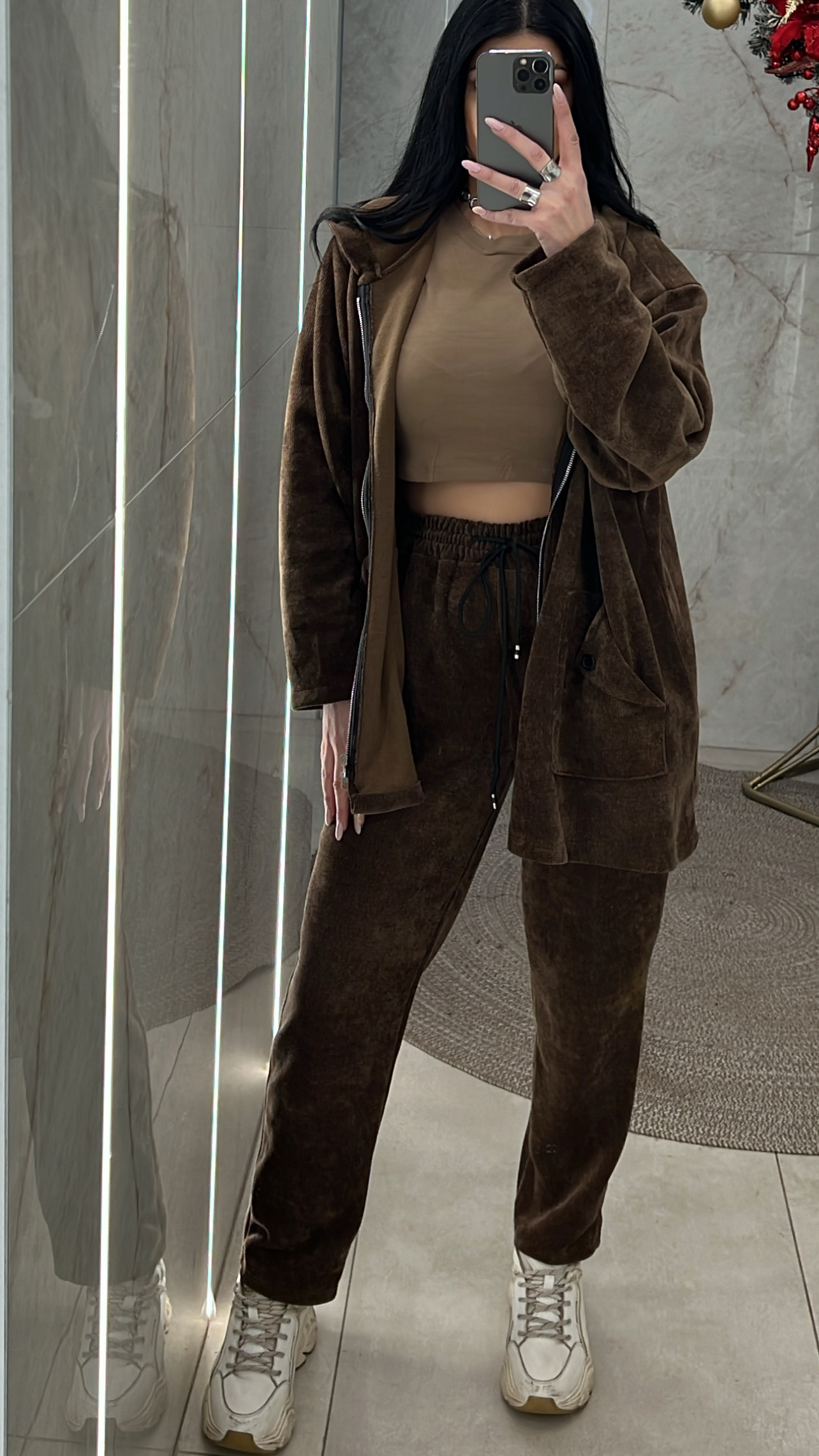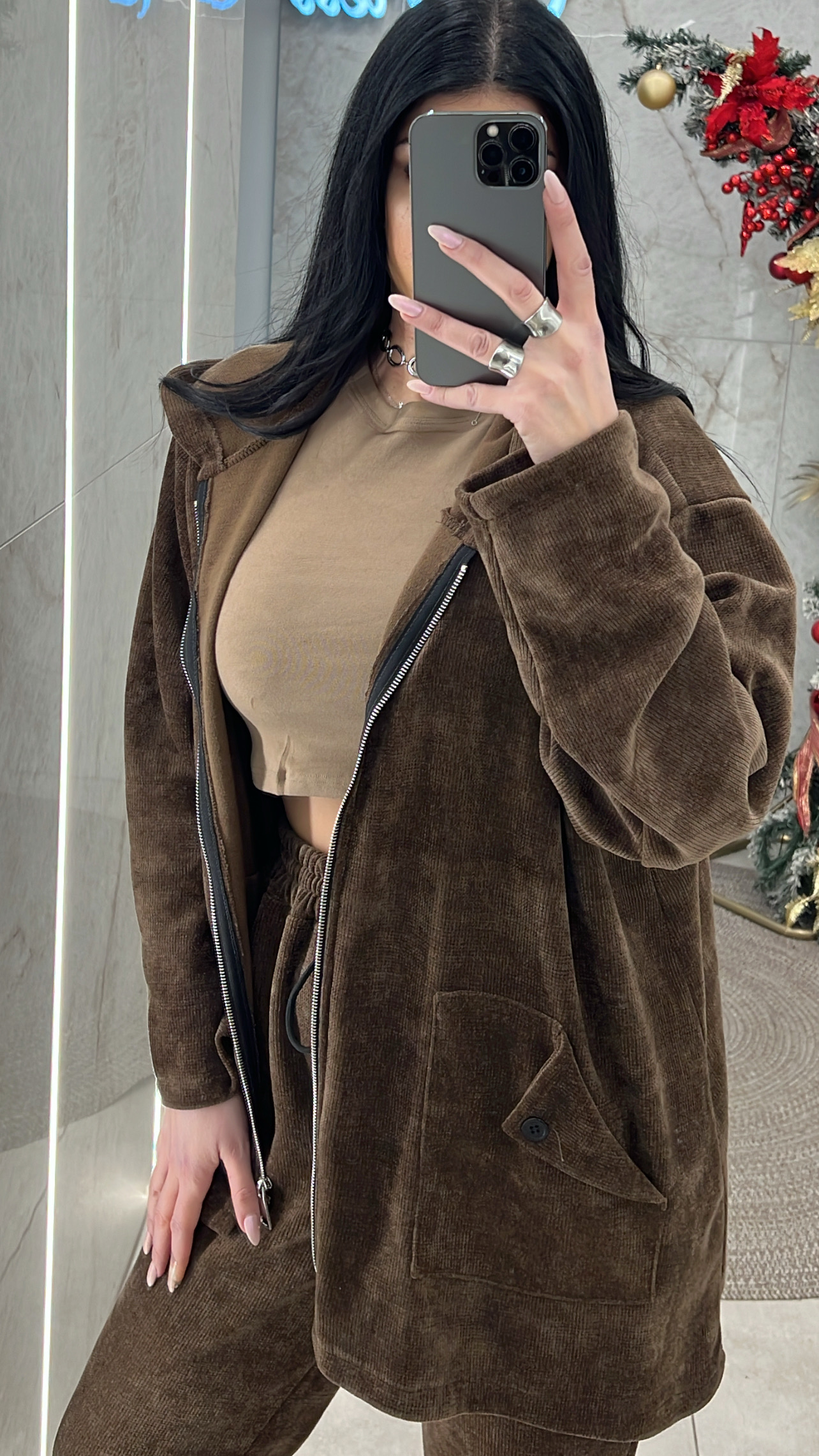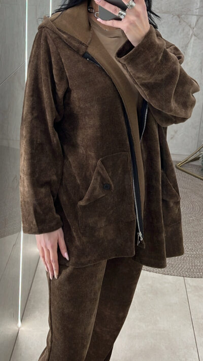 Κοτλέ φόρμα η ζακέτα κλείνει με φερμουάρ έχει κουκούλα και τσέπες το παντελόνι έχει τσέπες λάστιχο στη μέση και κορδόνι