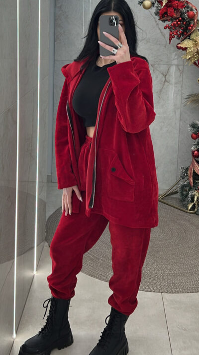 Κοτλέ φόρμα η ζακέτα κλείνει με φερμουάρ έχει κουκούλα και τσέπες το παντελόνι έχει τσέπες λάστιχο στη μέση και κορδόνι
