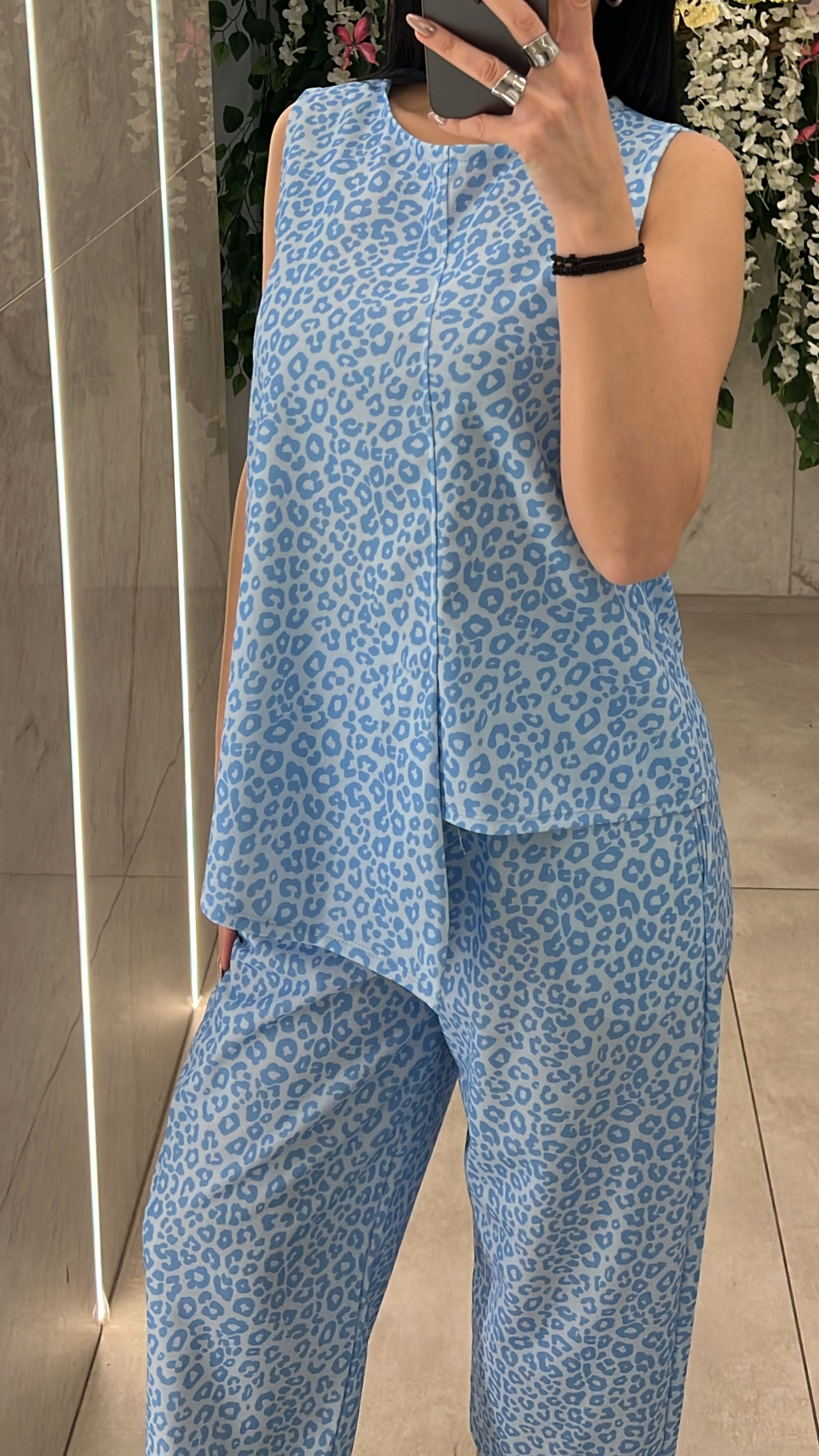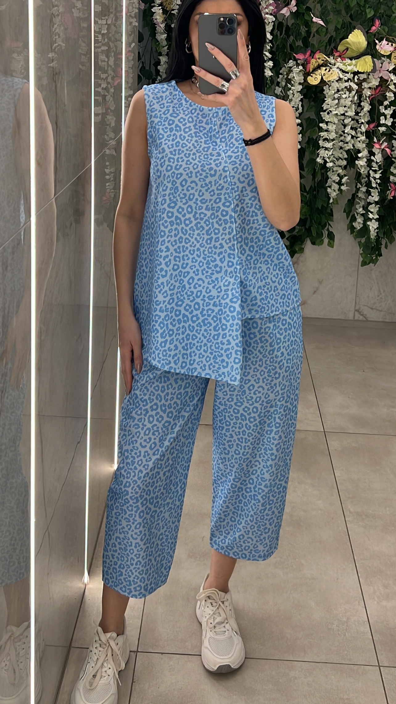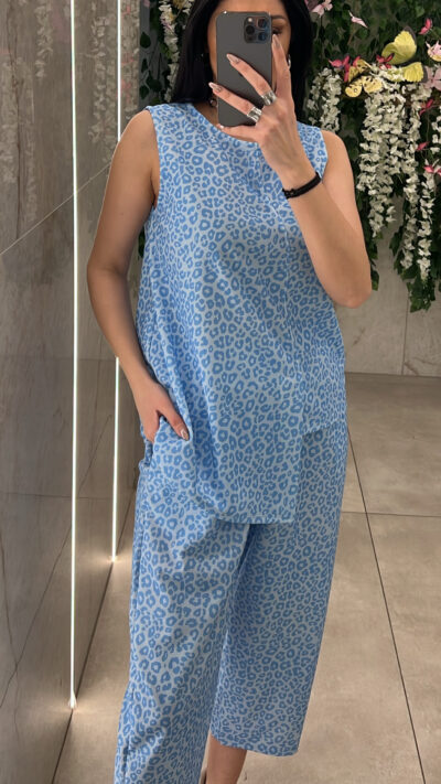 Σετ λεοπαρ ,μπλουζα αμάνικη που ειναι πιο μακρια στην μιση πλευρα μπροστα και παντελόνα με λάστιχο και τσέπες στην μεση .