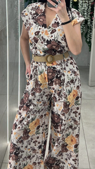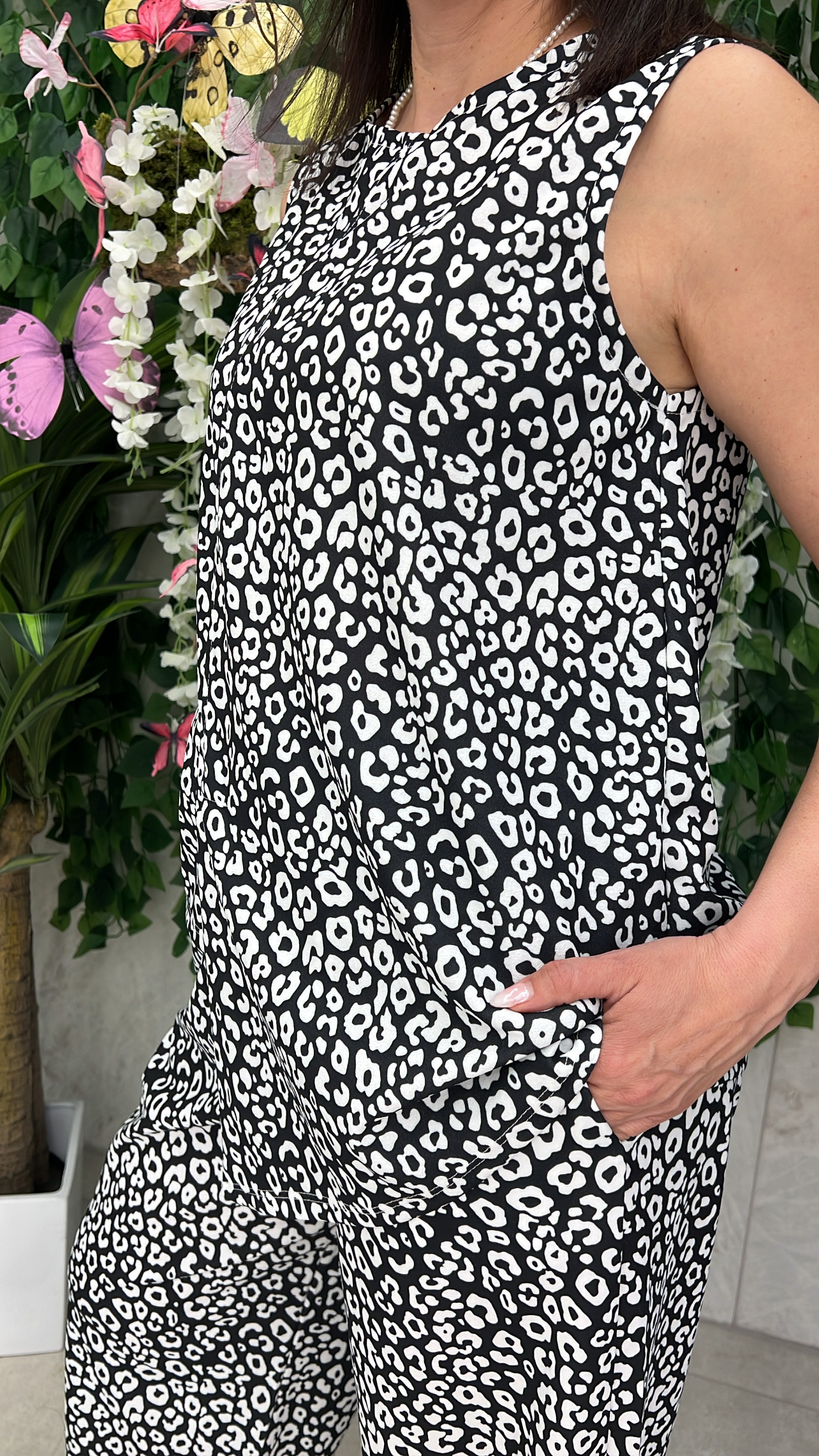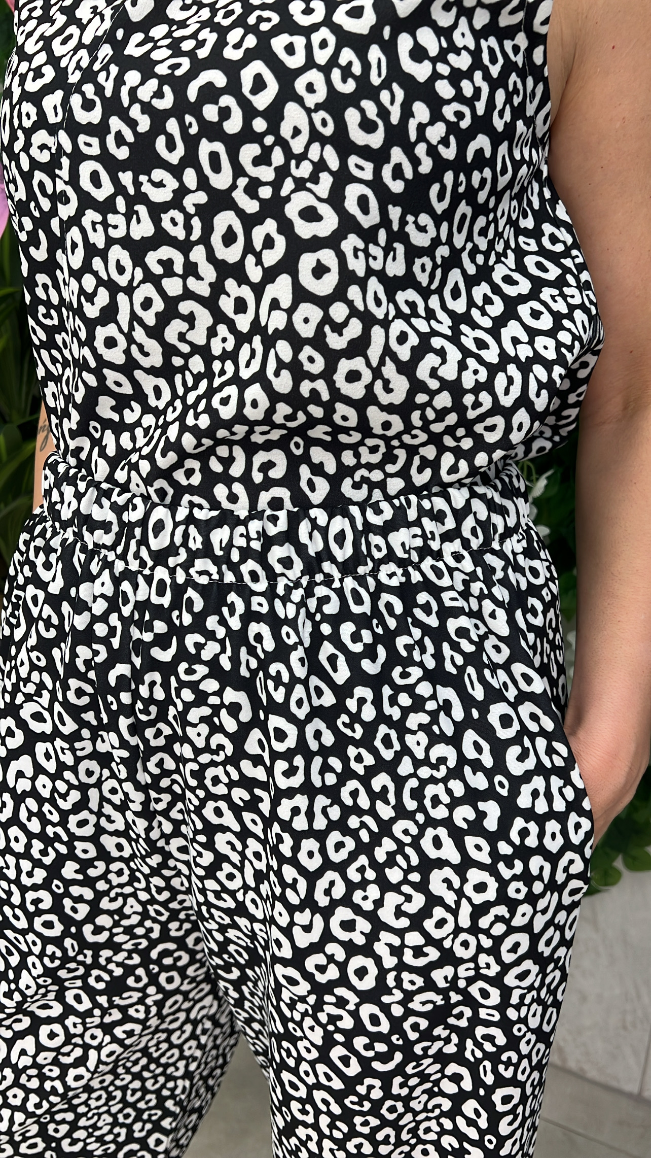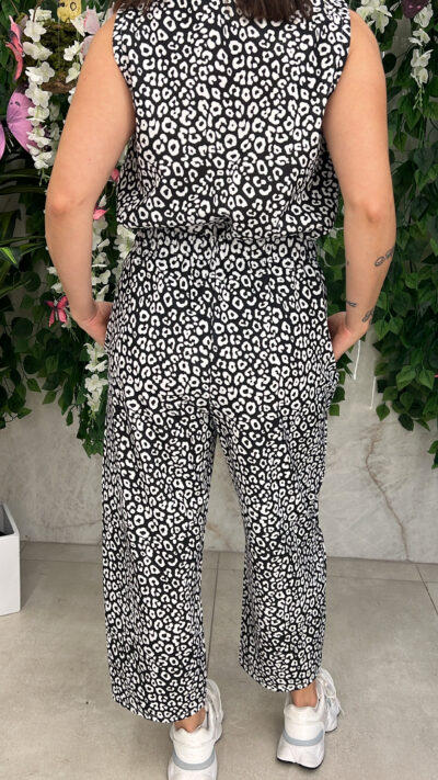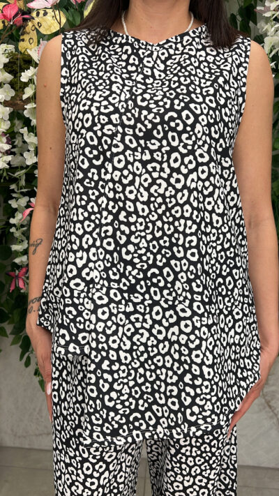 Σετ λεοπαρ ,μπλουζα αμάνικη που ειναι πιο μακρια στην μιση πλευρα μπροστα και παντελόνα με λάστιχο και τσέπες στην μεση .