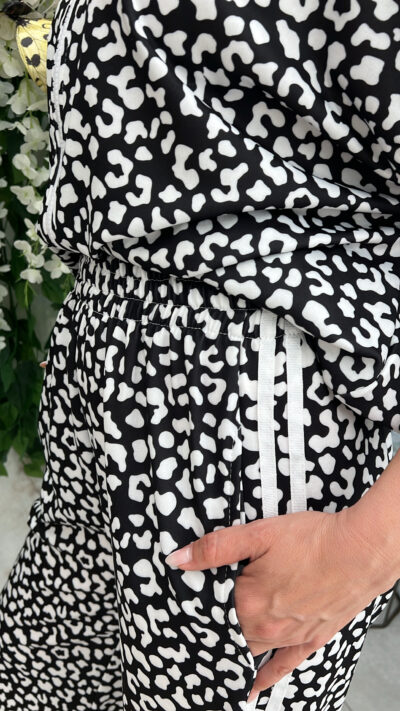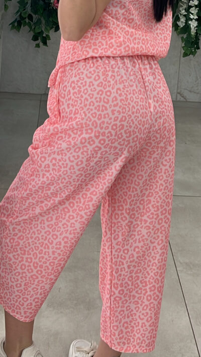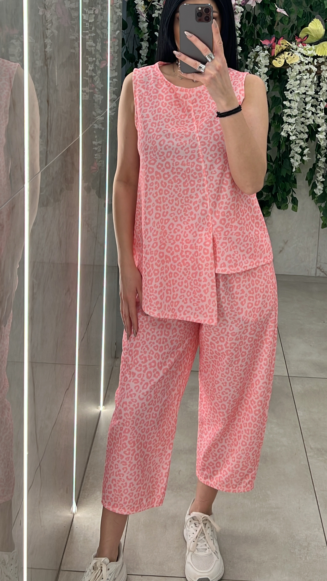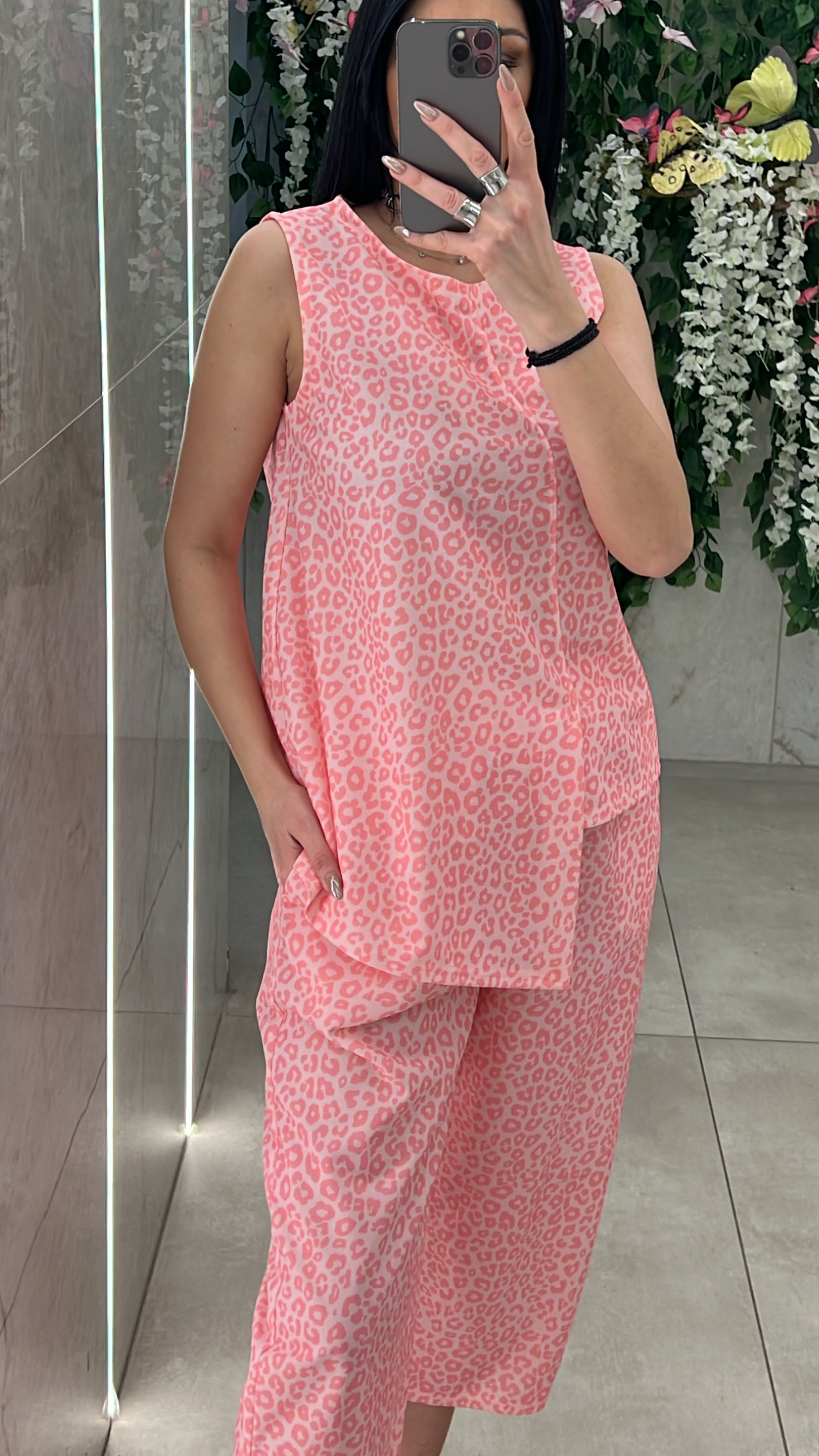 Σετ λεοπαρ ,μπλουζα αμάνικη που ειναι πιο μακρια στην μιση πλευρα μπροστα και παντελόνα με λάστιχο και τσέπες στην μεση .
