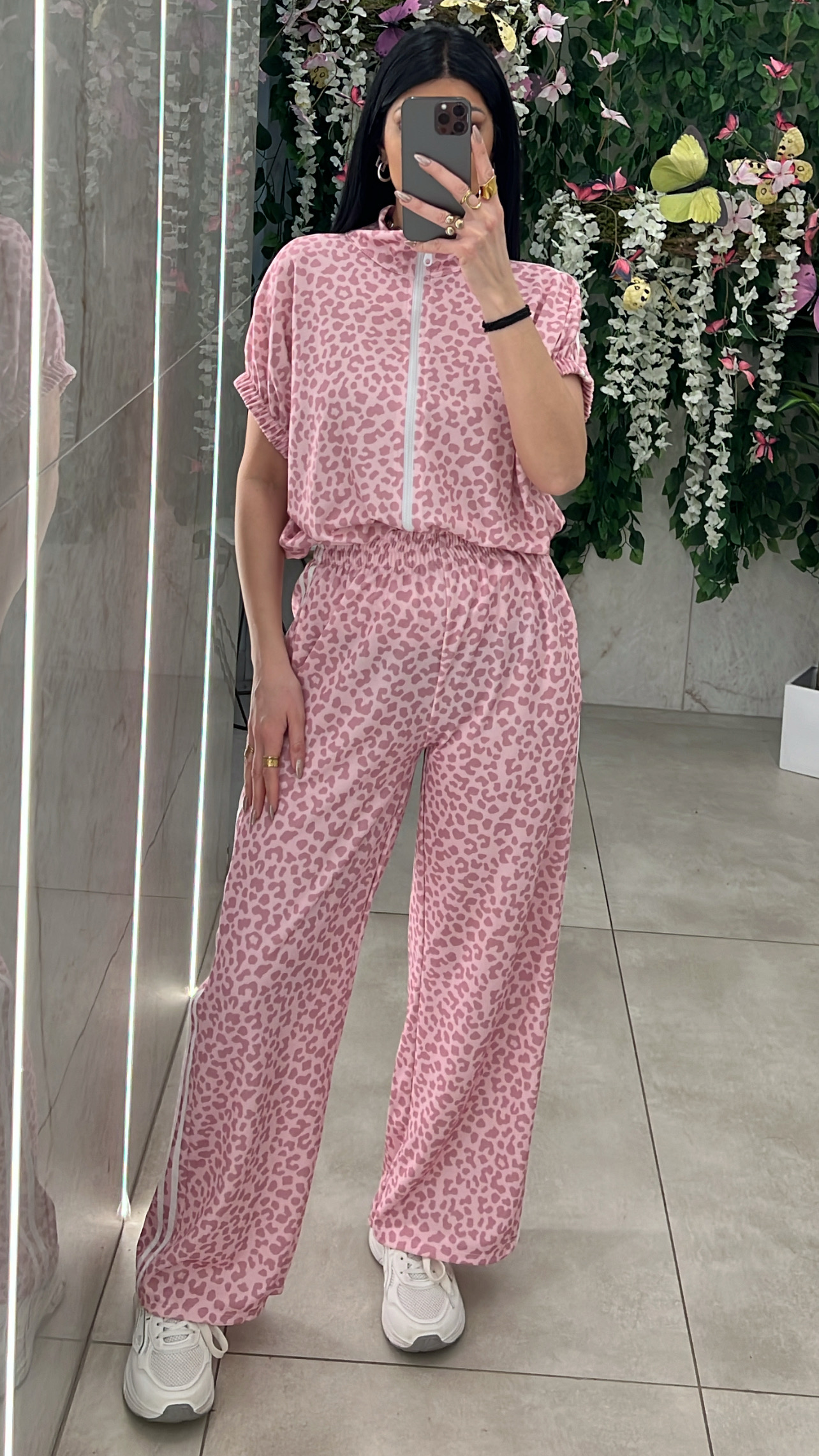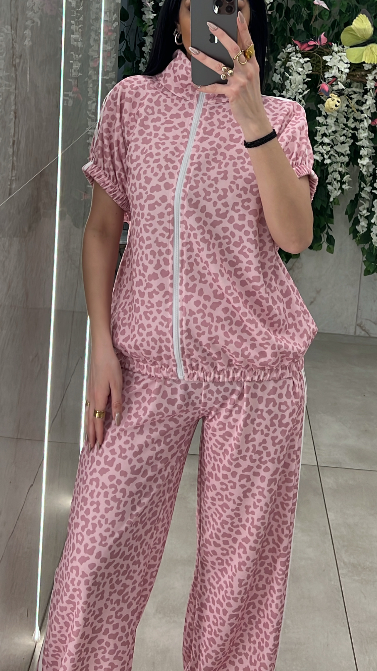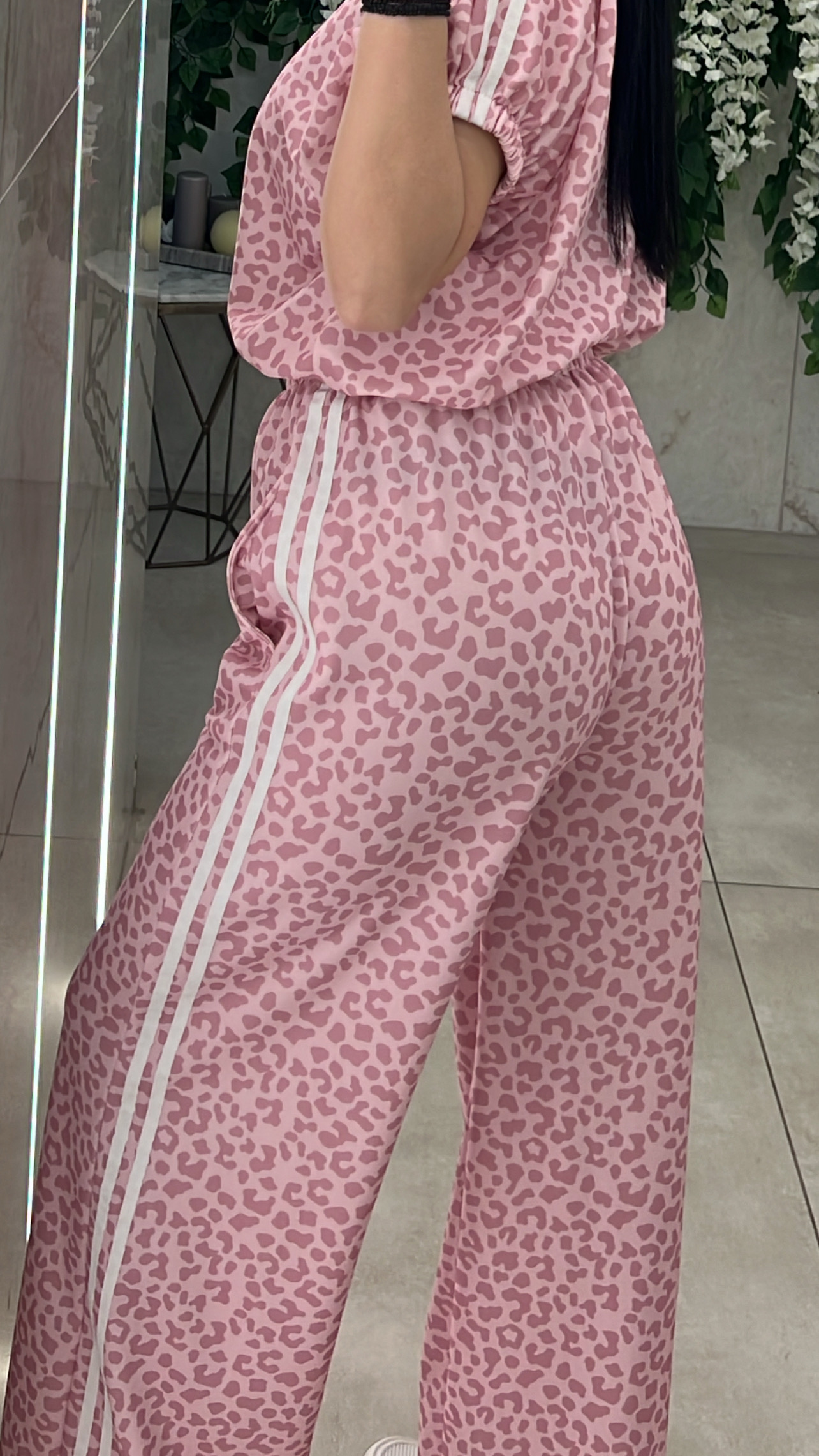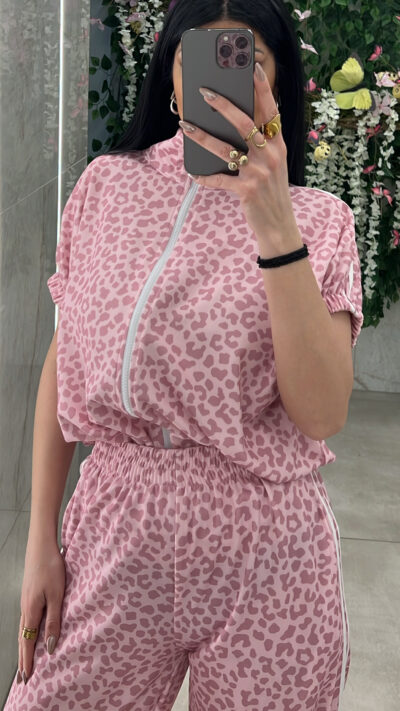 Σετ λεοπαρ ,ζακετα χωρις κουκουλα αμανικη με λάστιχο στο τελειωμα και παντελονα με ριγες στο πλαι ,τσέπες και λάστιχο στην μεση .