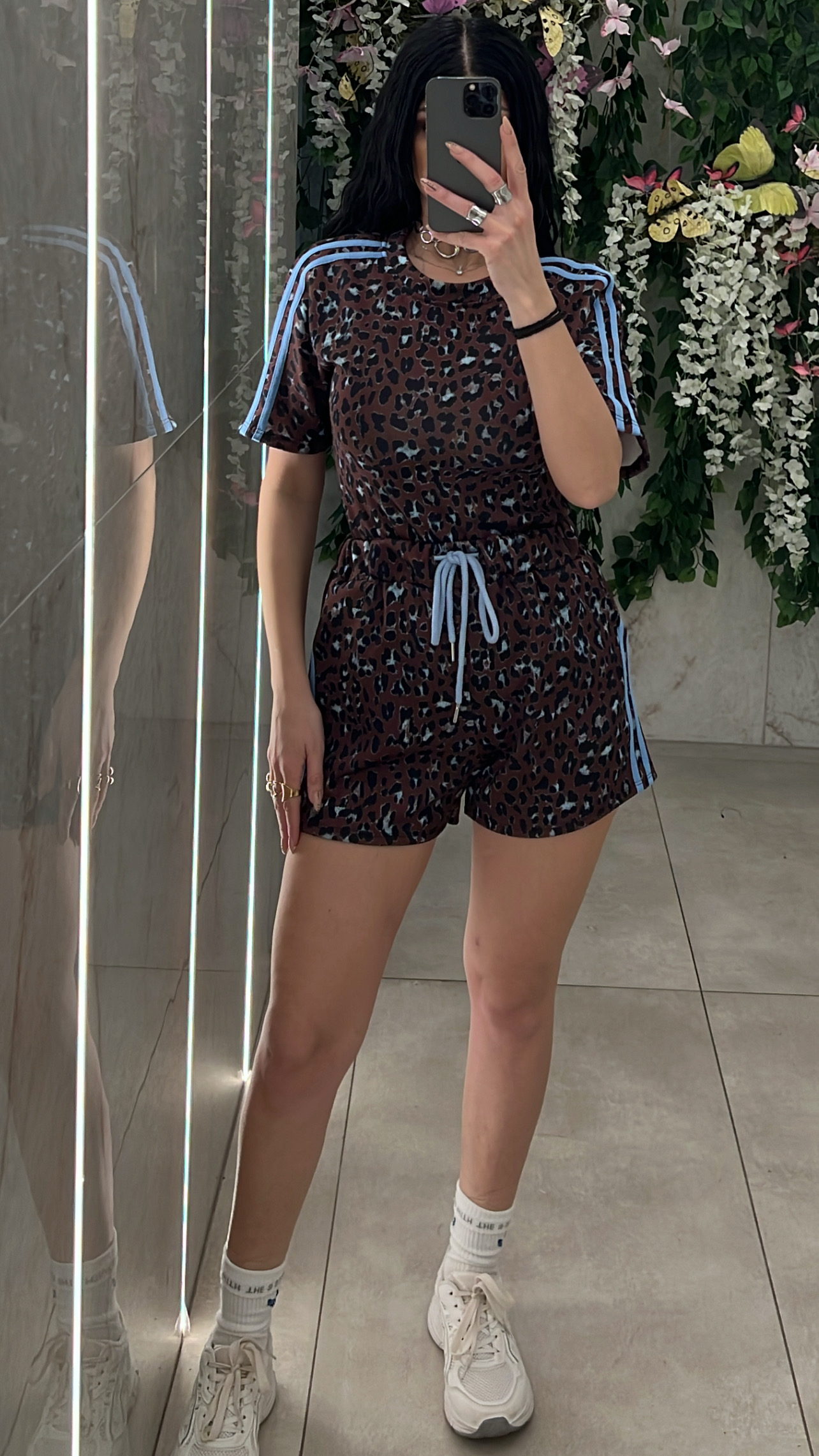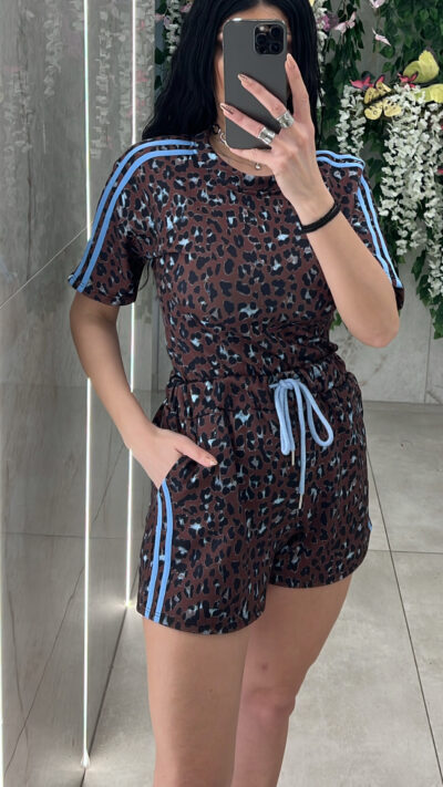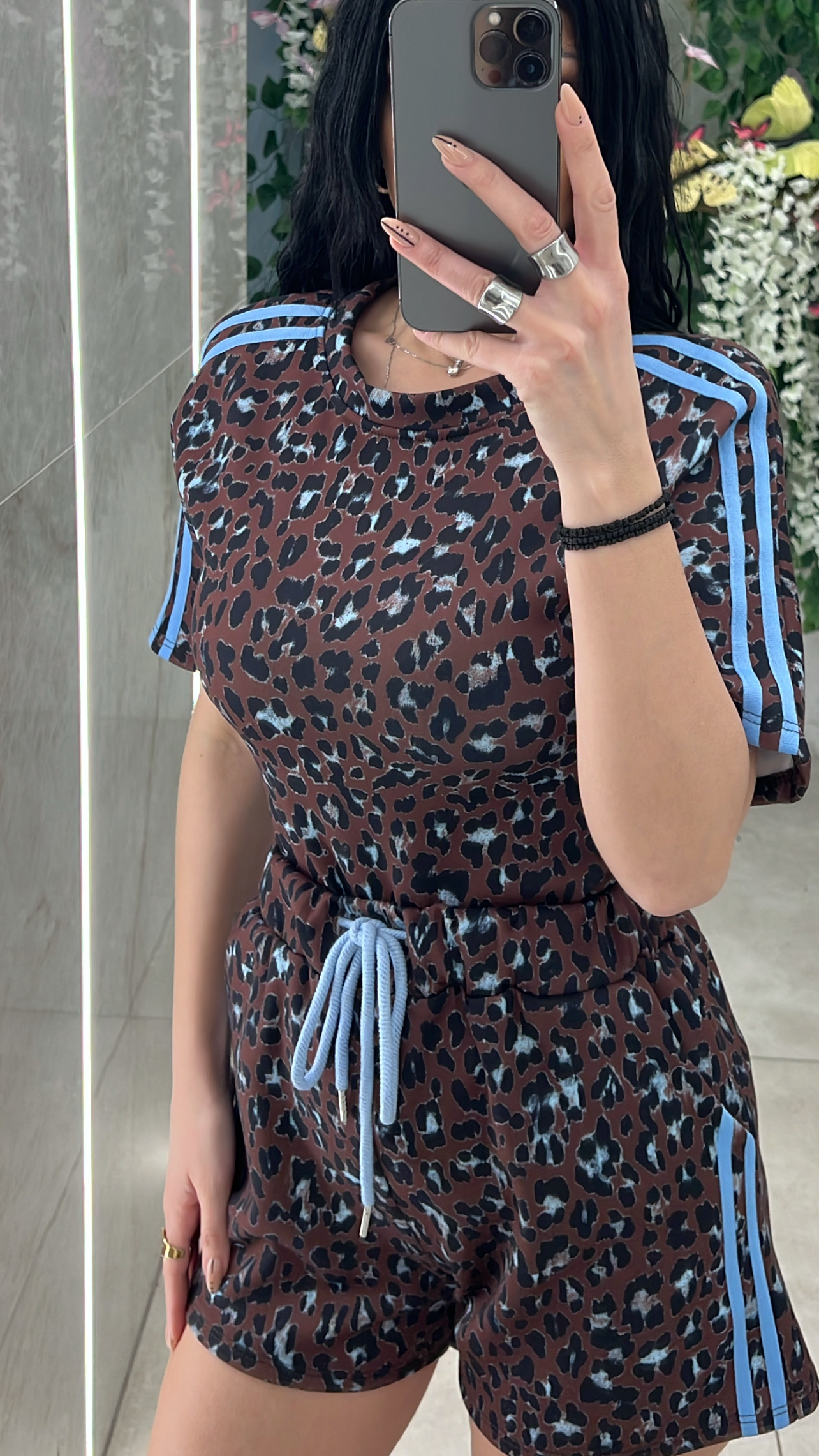 Σετ λεοπαρ με ριγες στο πλαι  ,κοντομανικη μπλουζα και σορστ με λάστιχο ,κορδόνι και τσέπες στην μέση .