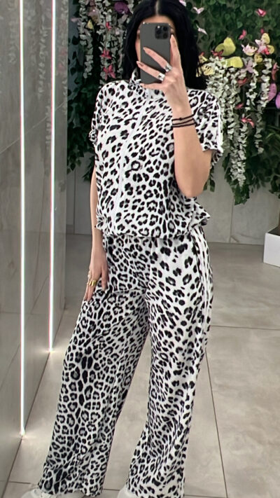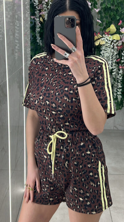 Σετ λεοπαρ με ριγες στο πλαι  ,κοντομανικη μπλουζα και σορστ με λάστιχο ,κορδόνι και τσέπες στην μέση .