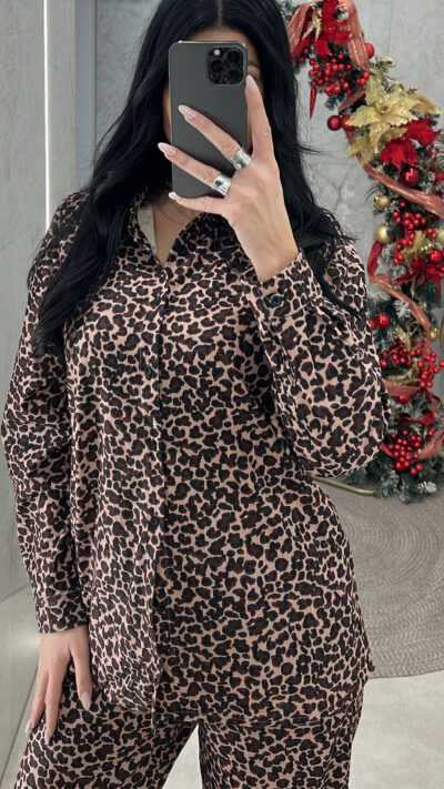 Σετ Λεοπάρ ριπ με πουκάμισο και παντελόνι με λάστιχο στη μέση και διαθέτει τσέπες