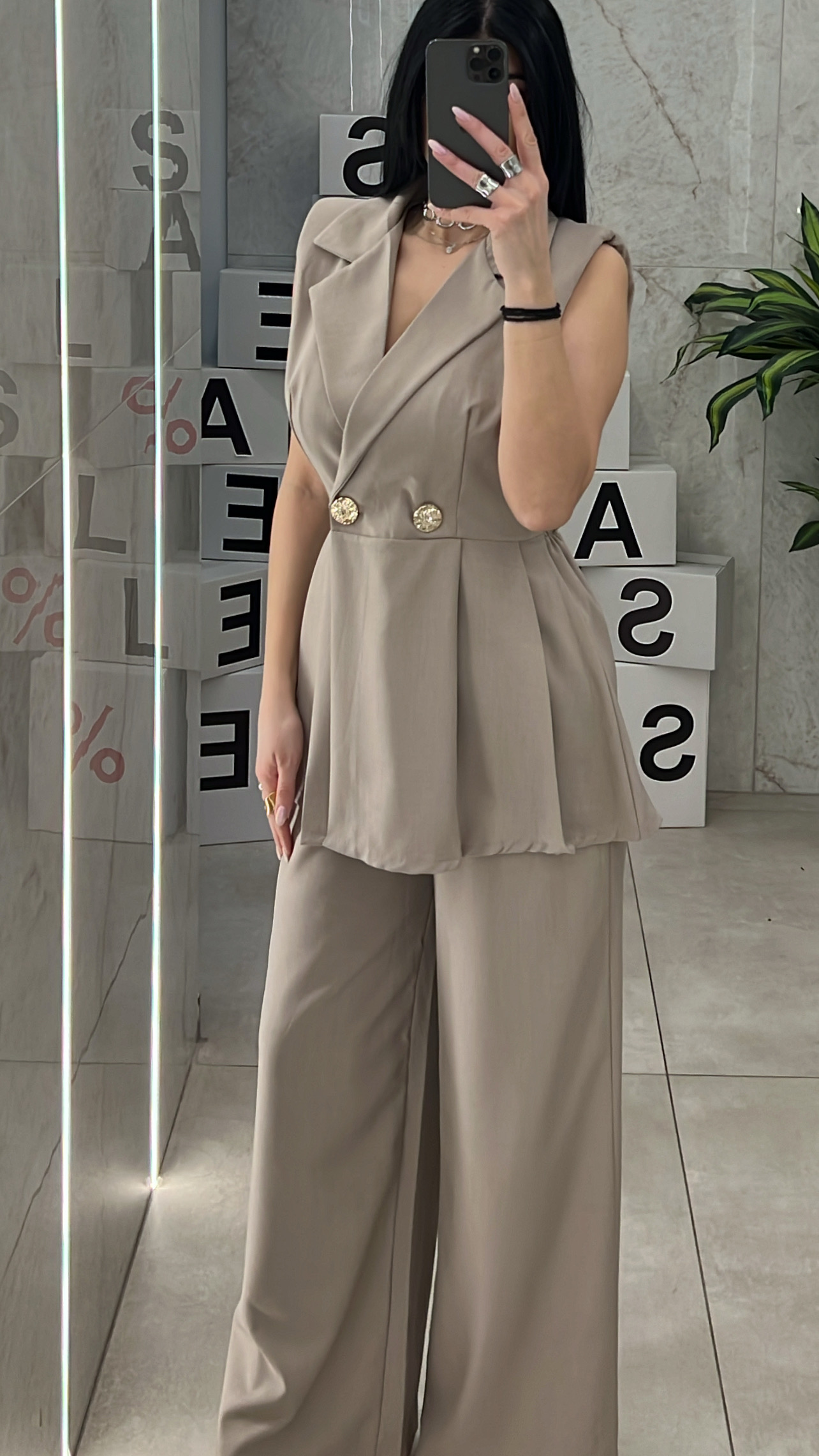 Σετ αποτελειται απο αμάνικο γιλέκο με βάτες ,κλείνει με χρυσα κουμπια  και ανοιγει στο τελείωμα και παντελόνα ψηλόμεση με λάστιχο στην μέση και τσέπες .