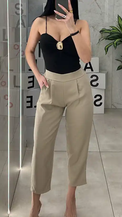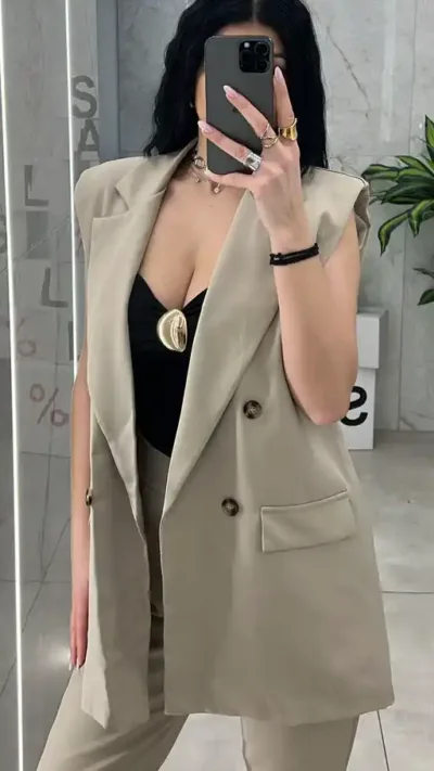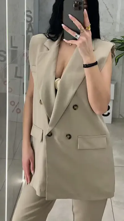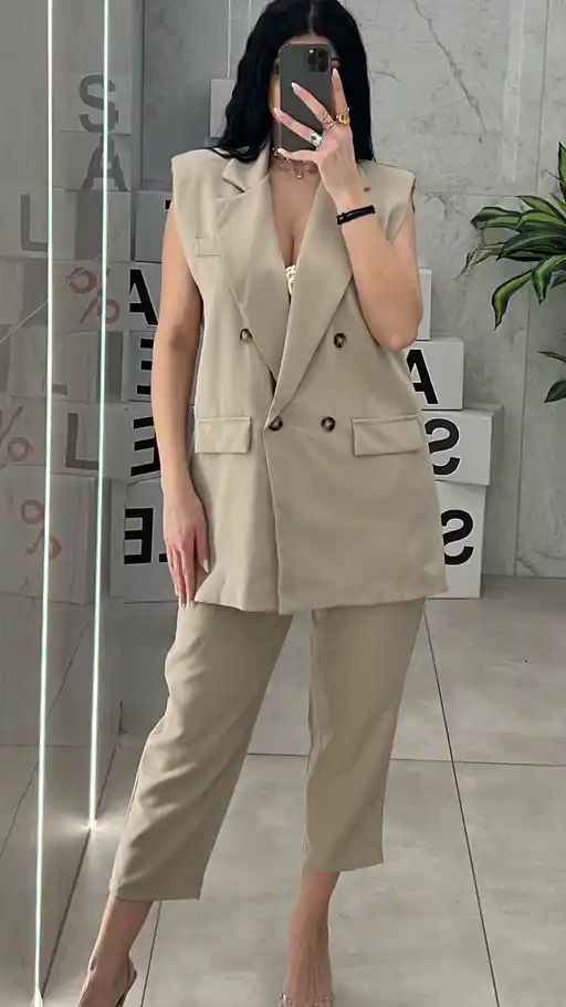Σετ με αμάνικο γιλέκο ,διαθέτει βατες και κλεινει μπροστά με κουμπί και παντελόνι με λάστιχο στην μέση και τσέπες .