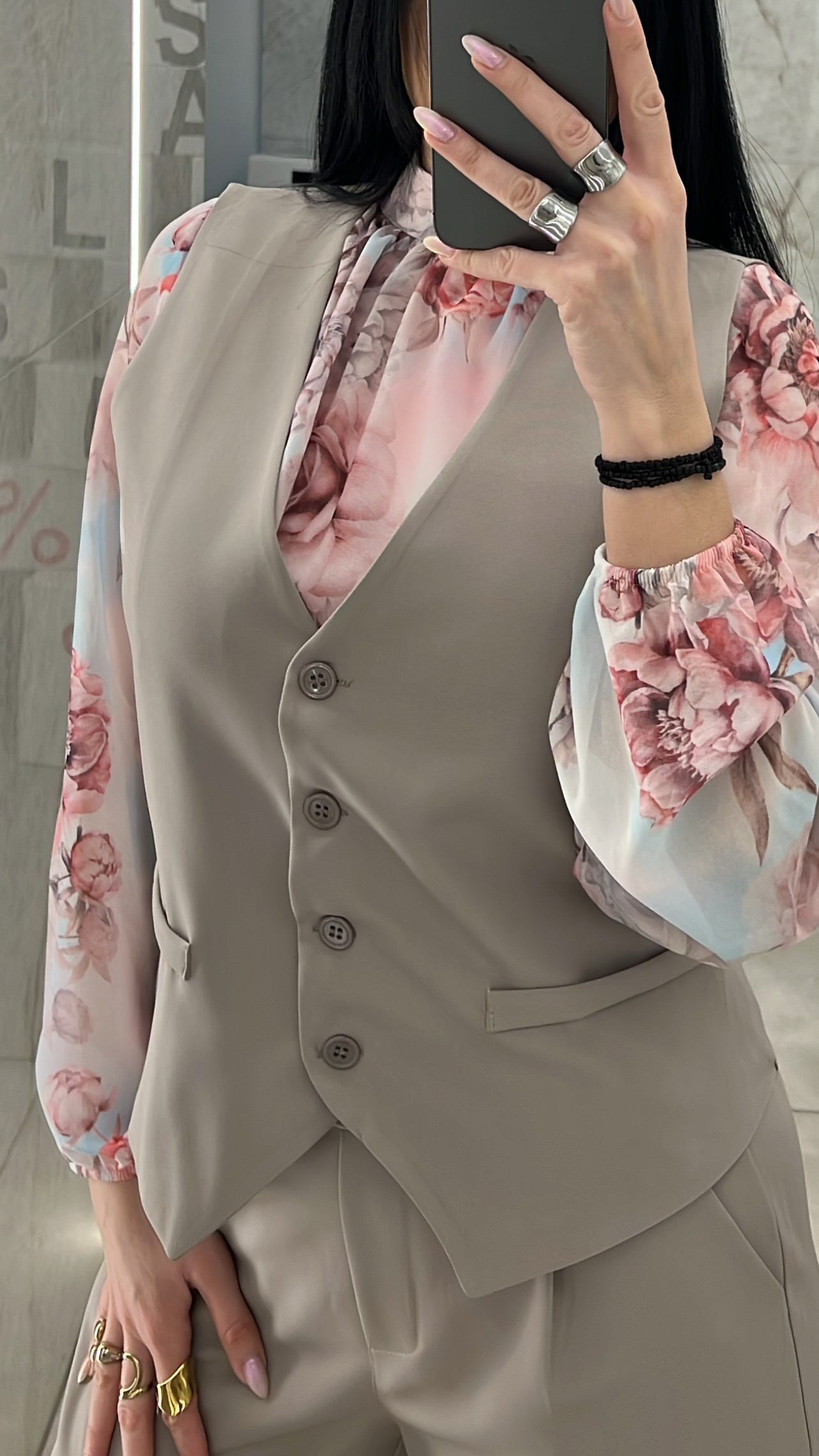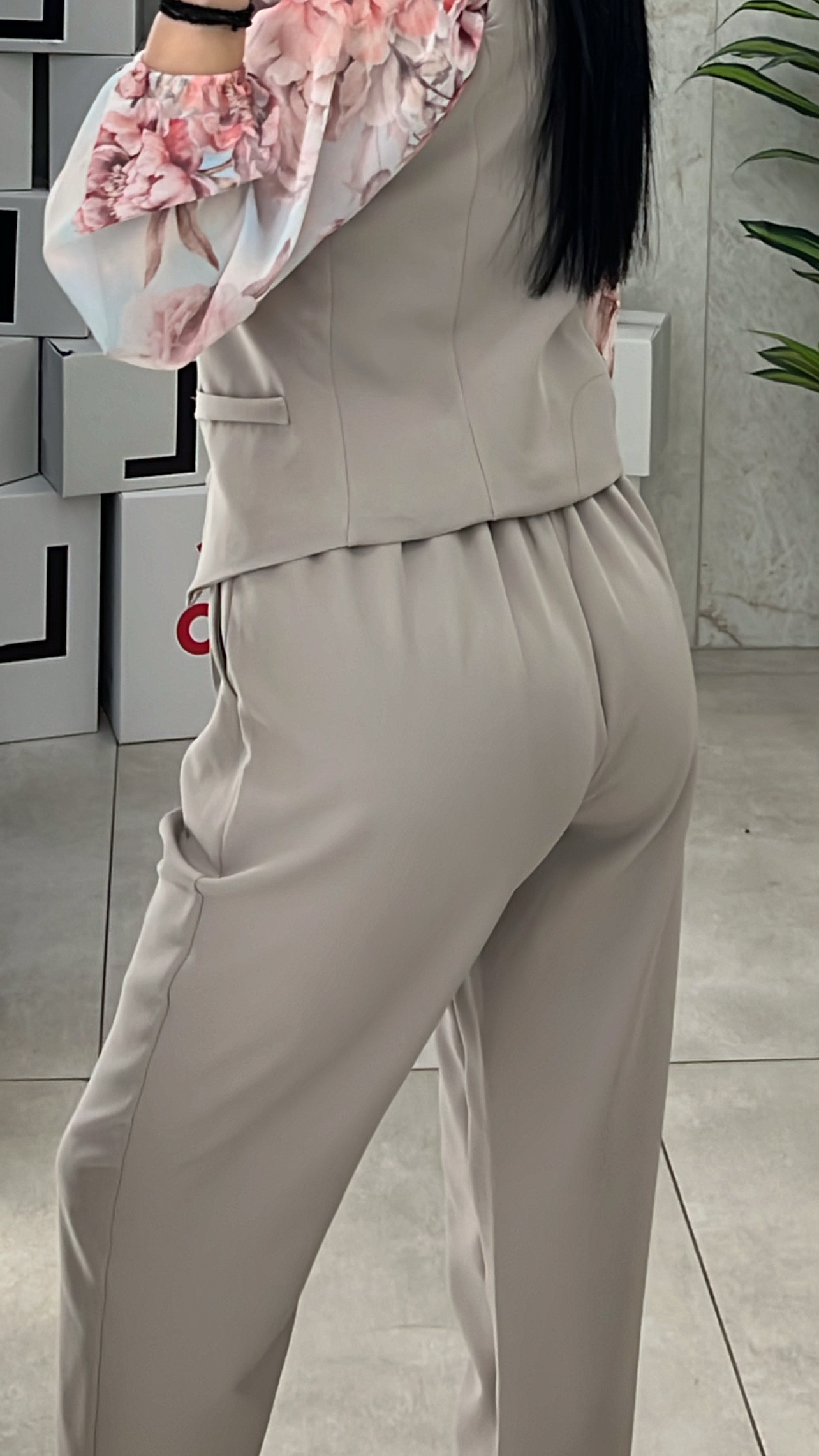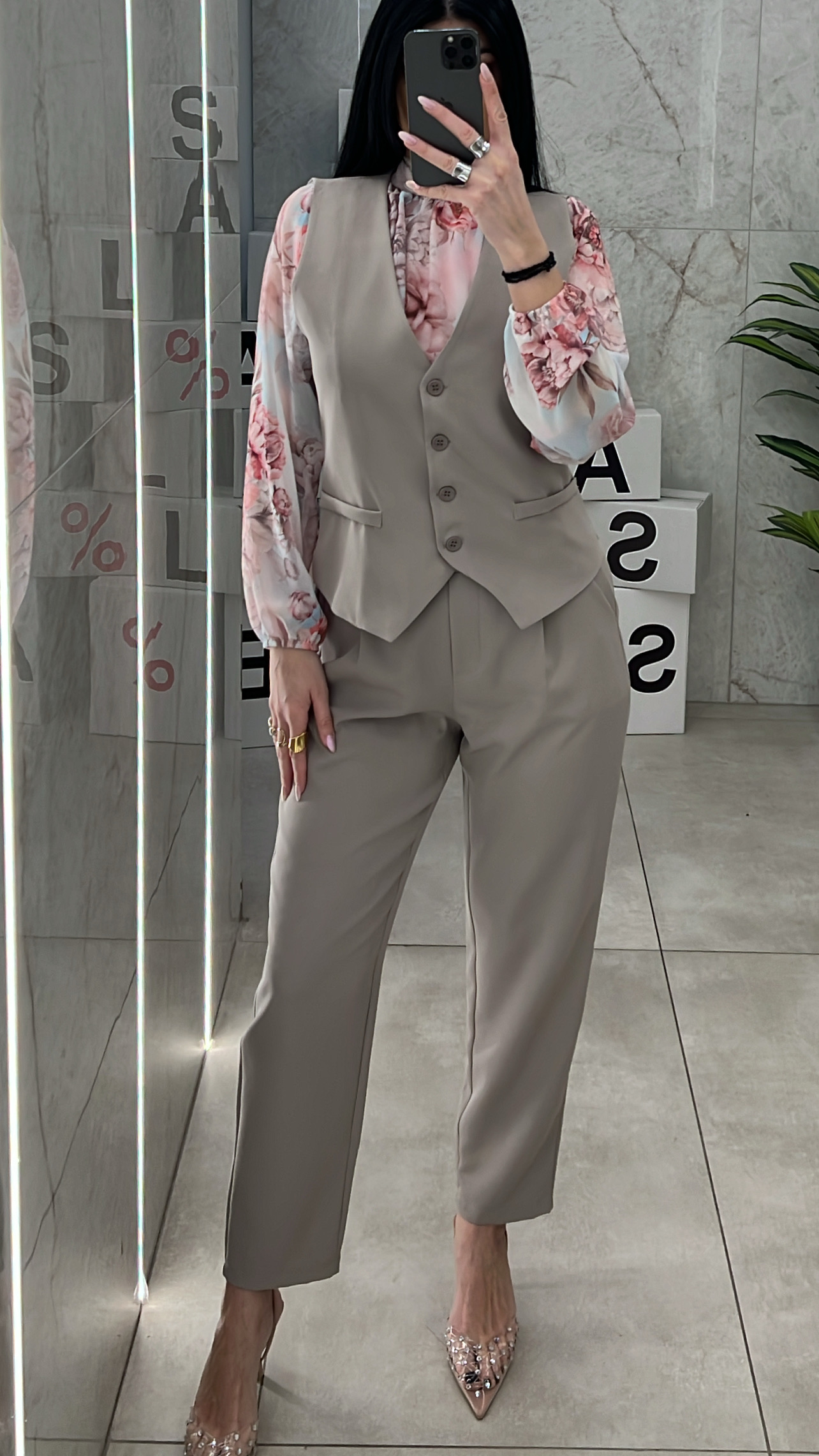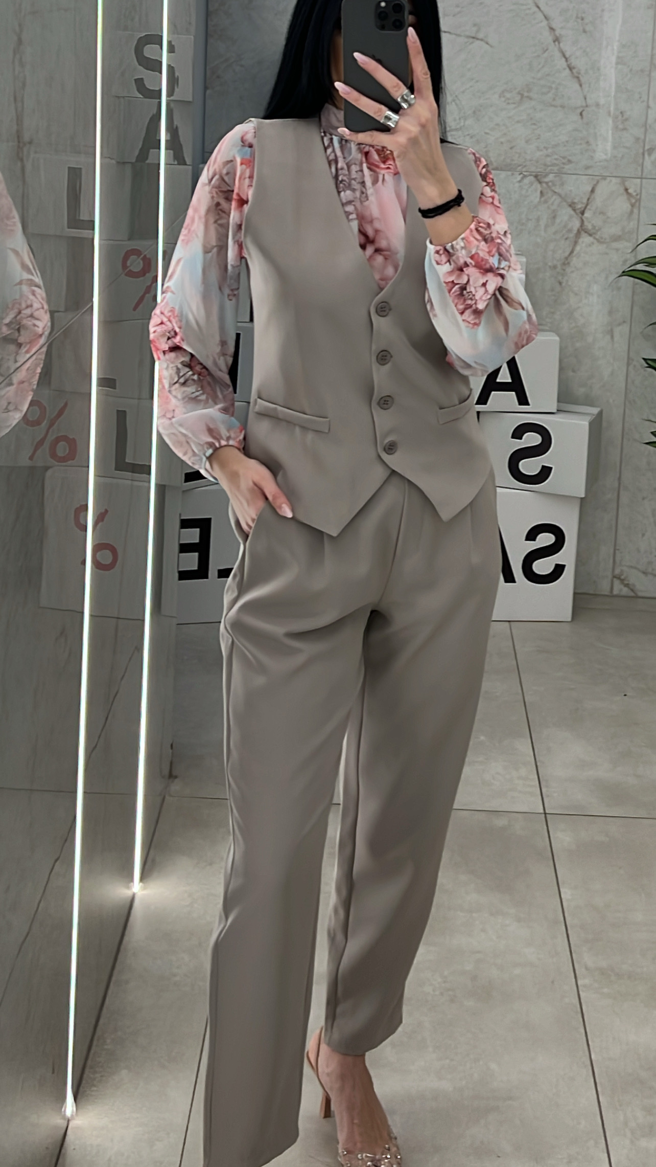Σετ που αποτελείται απο αμάνικο γιλέκο ,με εσωτερική φόδρα που κλείνει με κουμπιά και παντελόνι με λάστιχο στην  μέση και τσέπες .