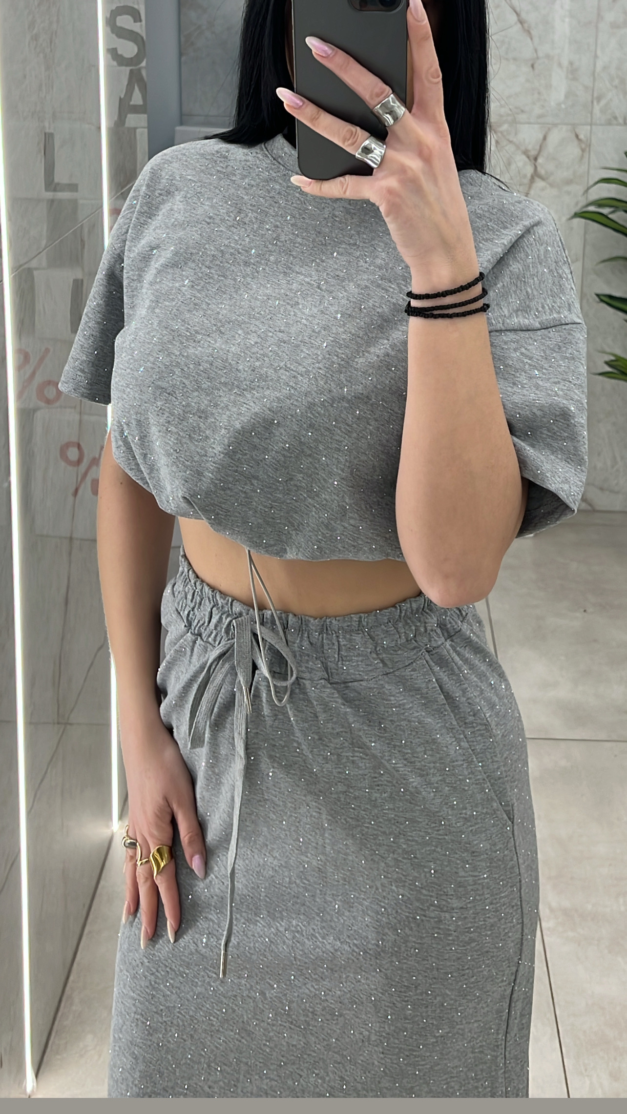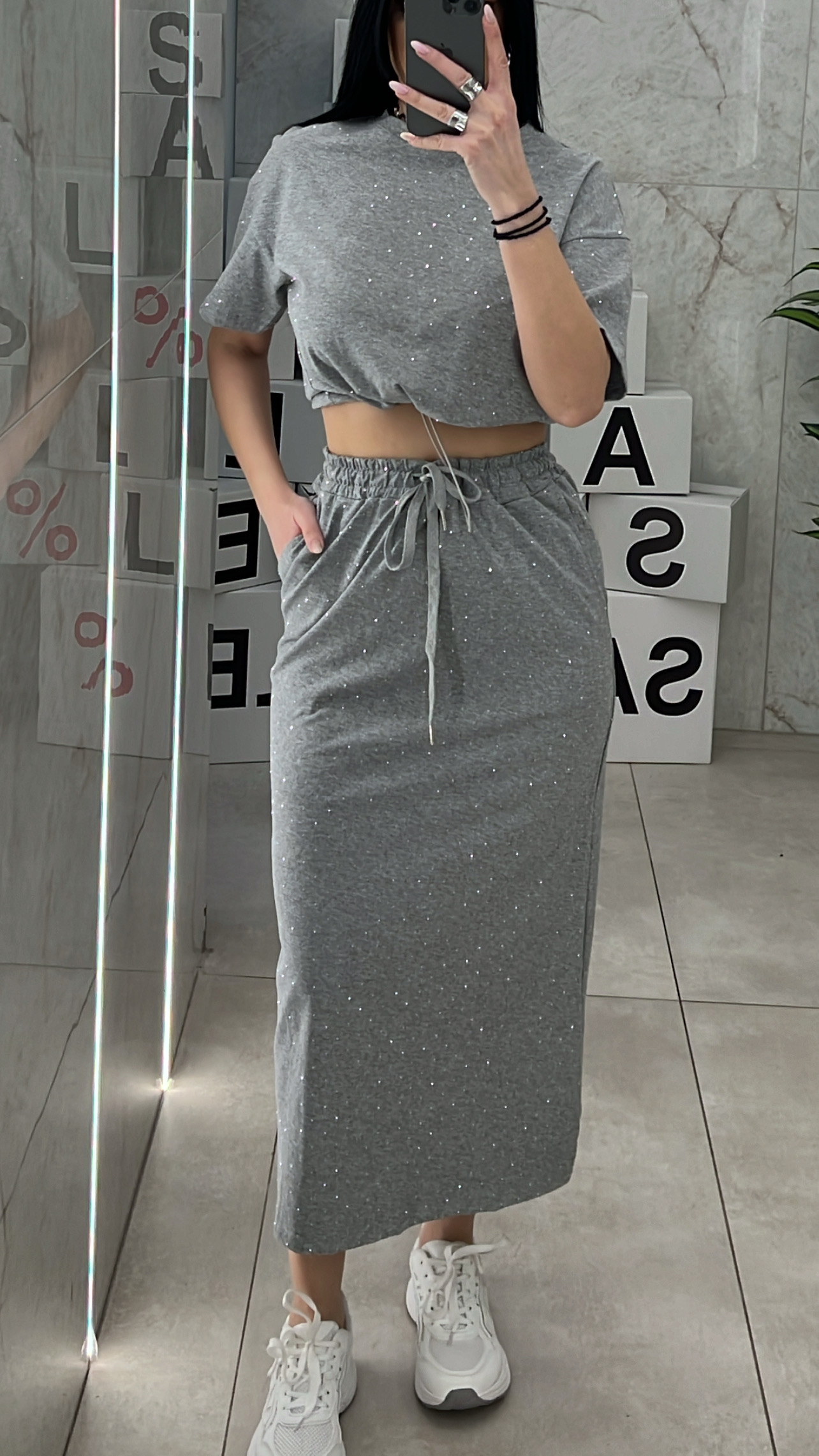 Σετ με στράς , φούστα μακριά με λάστιχο στην μέση και κορδόνι και μπλούζα κοντομάνικι με λάστιχο στο τελείωμα .