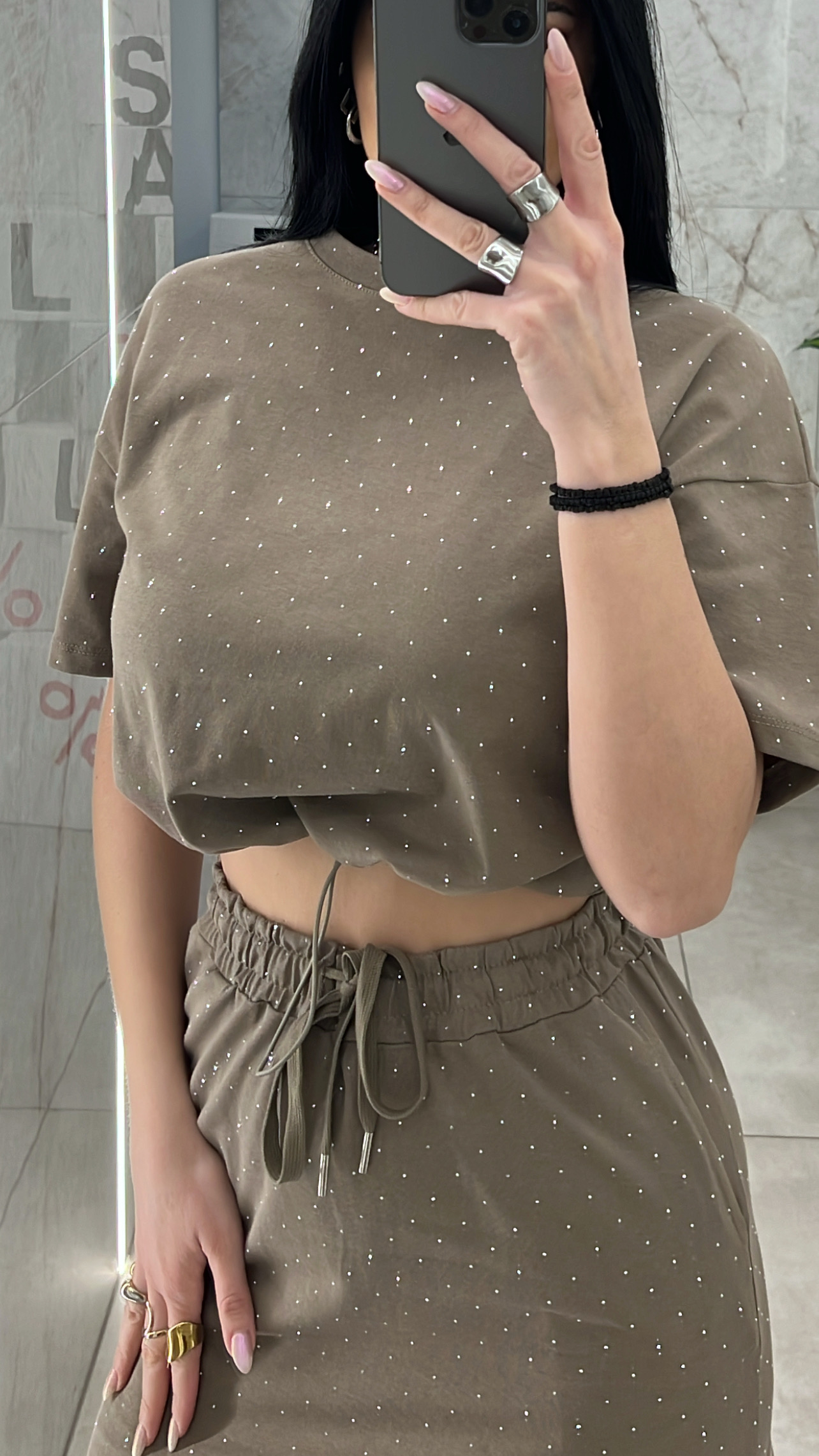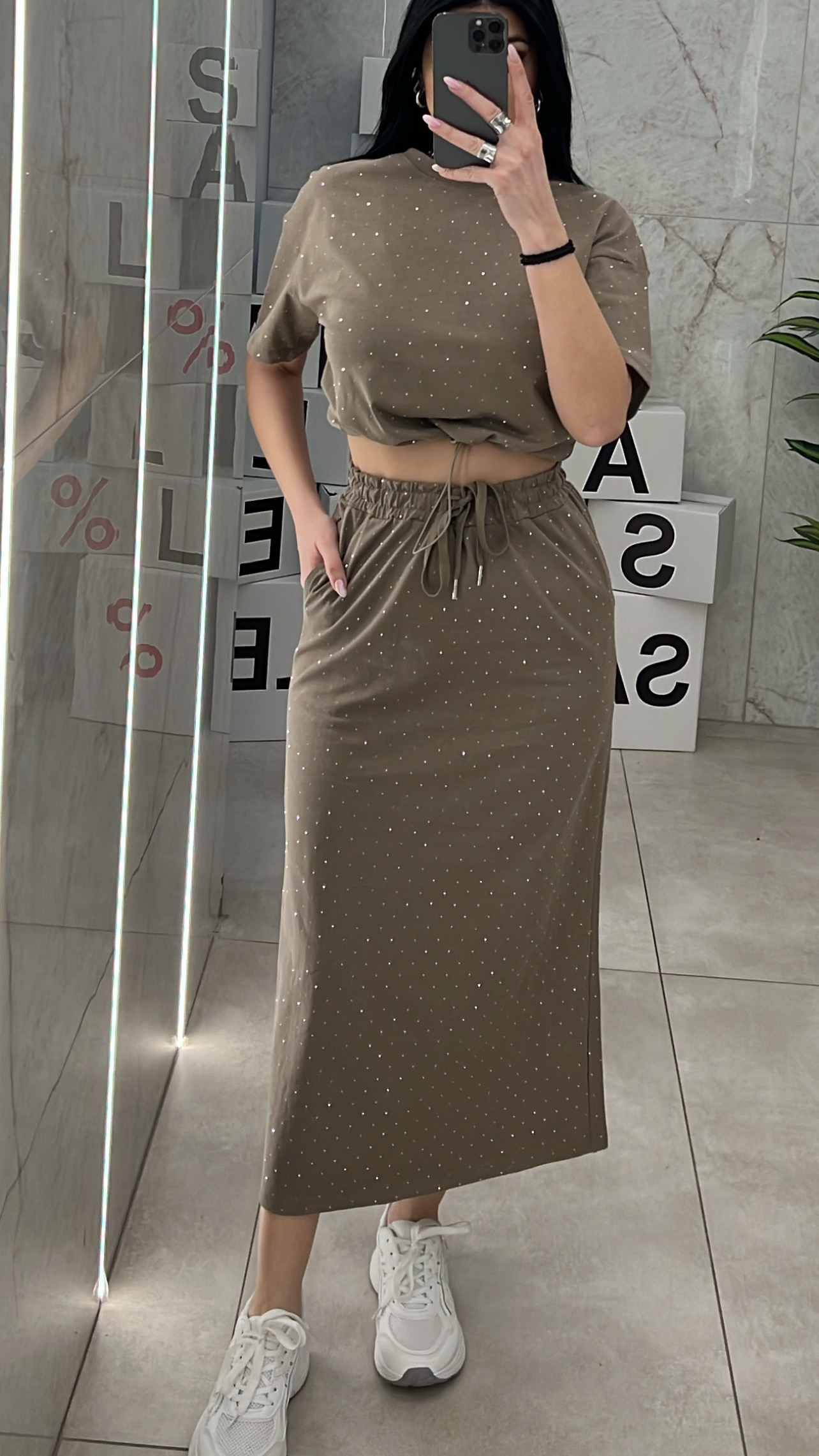Σετ με στράς , φούστα μακριά με λάστιχο στην μέση και κορδόνι και μπλούζα κοντομάνικι με λάστιχο στο τελείωμα .