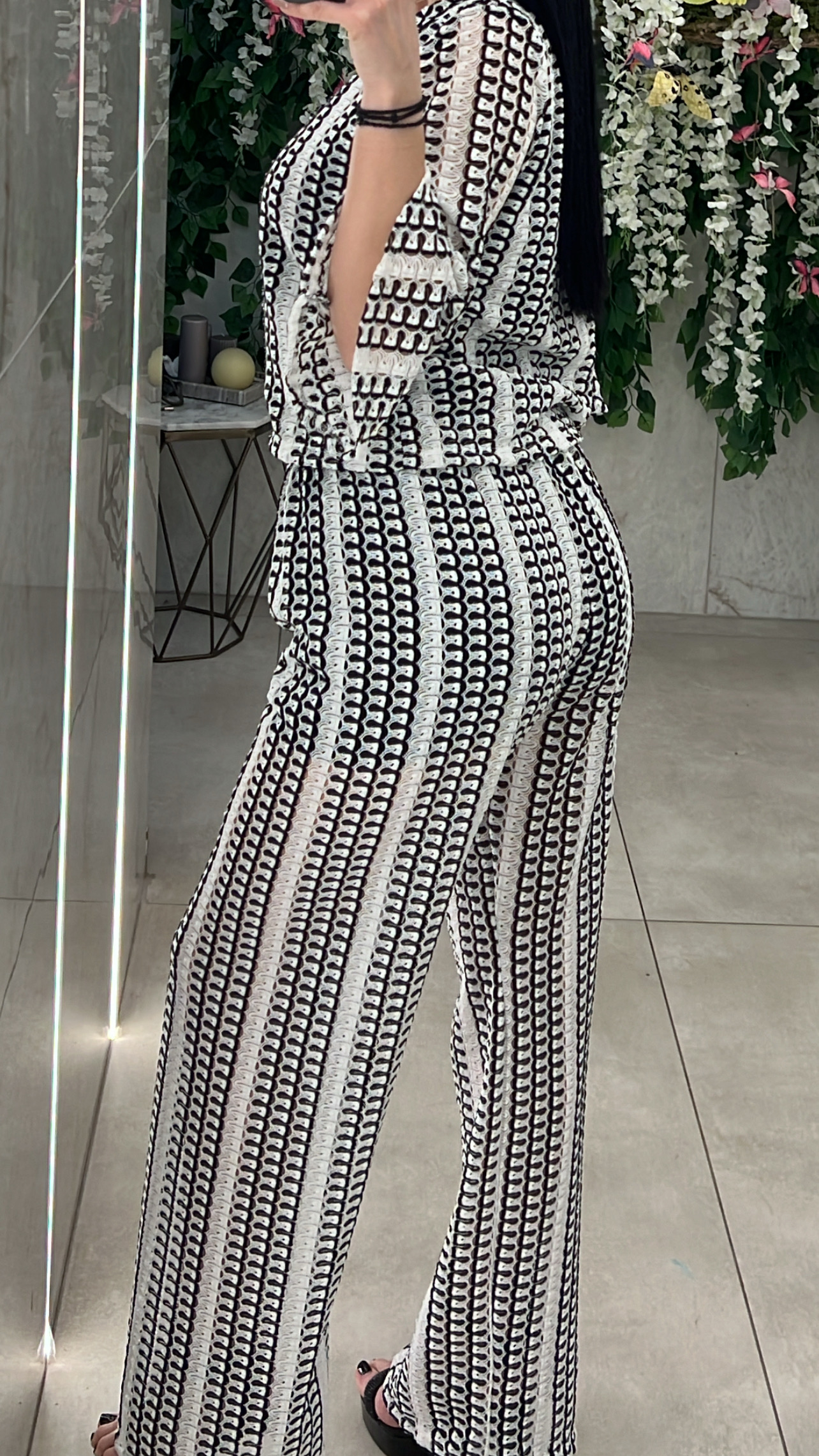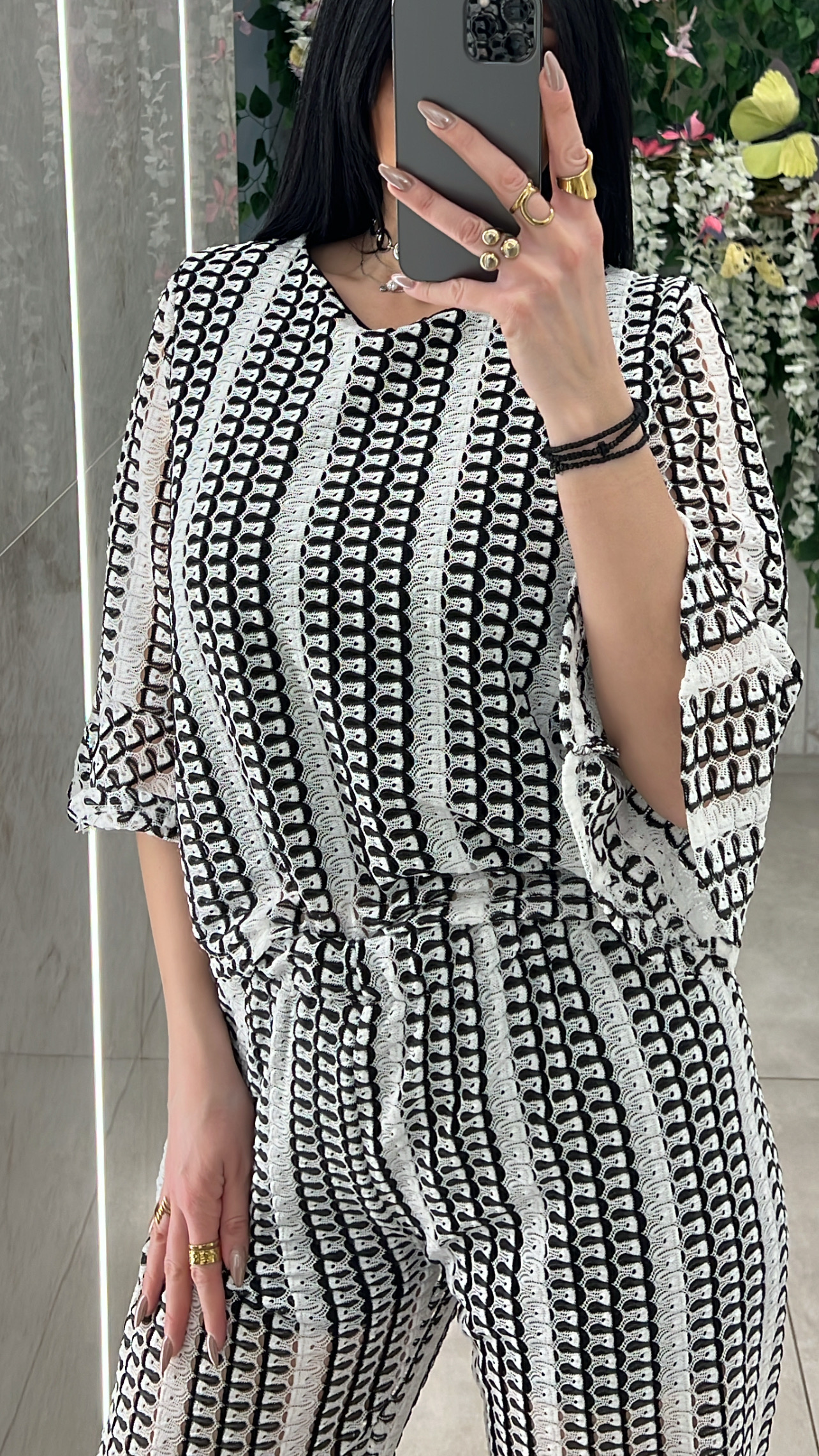 Σετ μισονι ,μπλουζα με λαιμοκοψη ,κανει καμπανα στο τελειωμα των μανικιων και ειναι εσωτερικα φοδραρισμενο και παντελόνα με ενσωματομένο σορτσ και λάστιχο στη μέση .