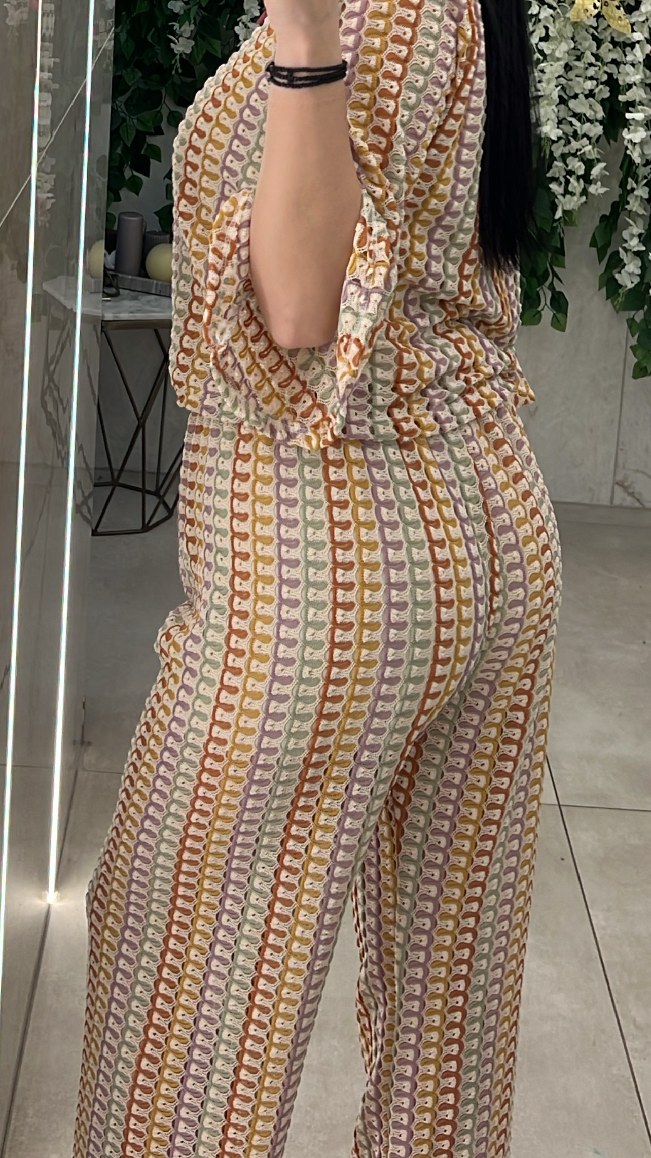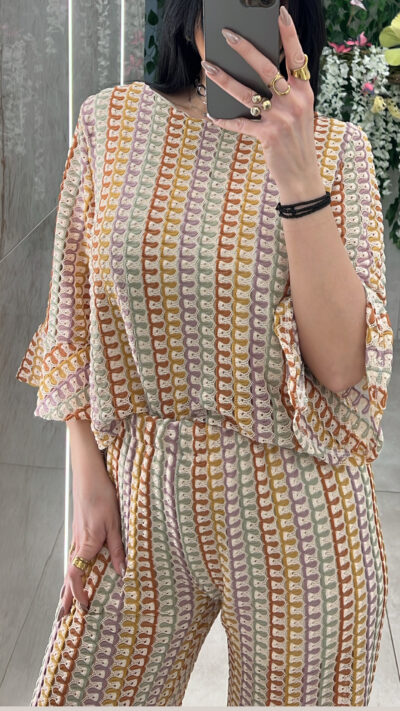 Σετ μισονι ,μπλουζα με λαιμοκοψη ,κανει καμπανα στο τελειωμα των μανικιων και ειναι εσωτερικα φοδραρισμενο και παντελόνα με ενσωματομένο σορτσ και λάστιχο στη μέση .