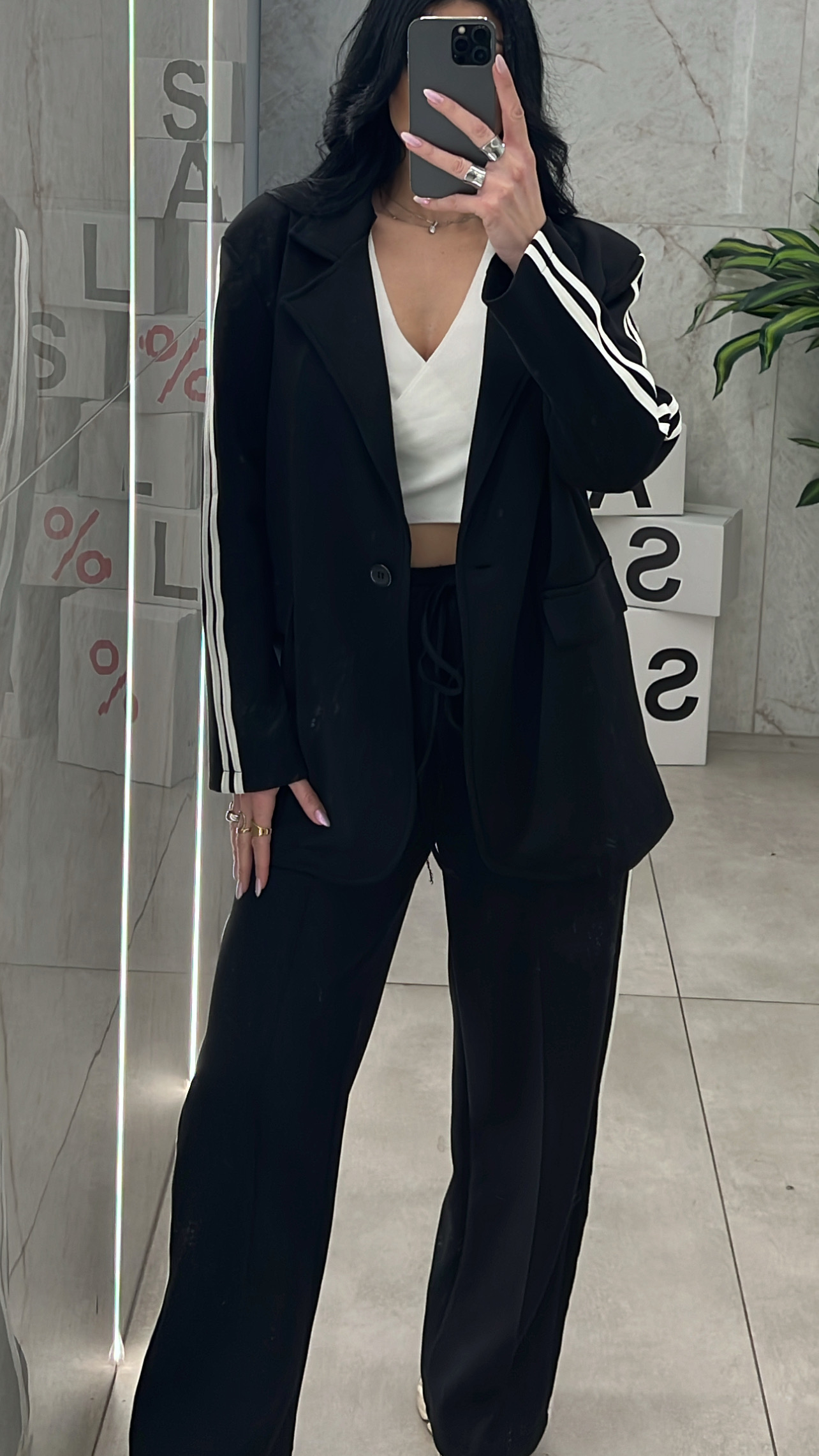 Σετ Παντελόνα Σακάκι Με Ρίγες , το παντελόνι διαθέτει λάστιχο ,κορδόνι στην μεση και τσέπες και το σακάκι κλείνει με κουμπί.