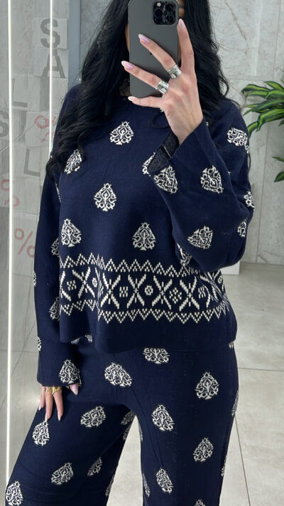 Σετ πλεκτό με σχέδιο  ,η παντελόνα διαθέτει λάστιχο στην μεση και η μπλούζα είναι με λαιμόκοψη.