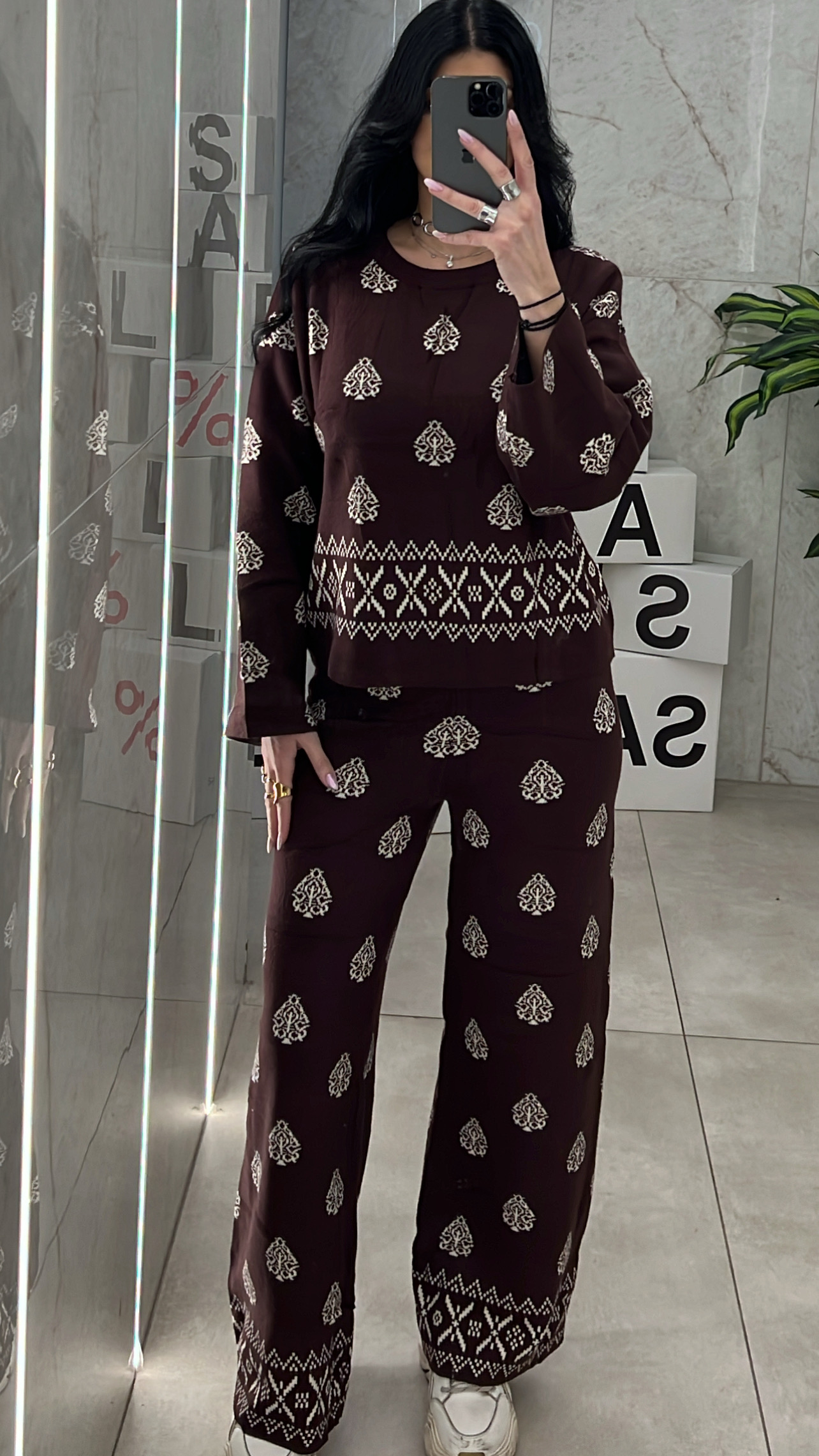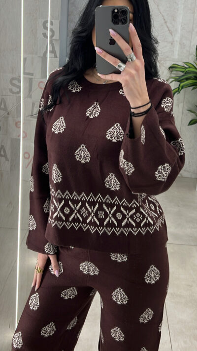 Σετ πλεκτό με σχέδιο  ,η παντελόνα διαθέτει λάστιχο στην μεση και η μπλούζα είναι με λαιμόκοψη.