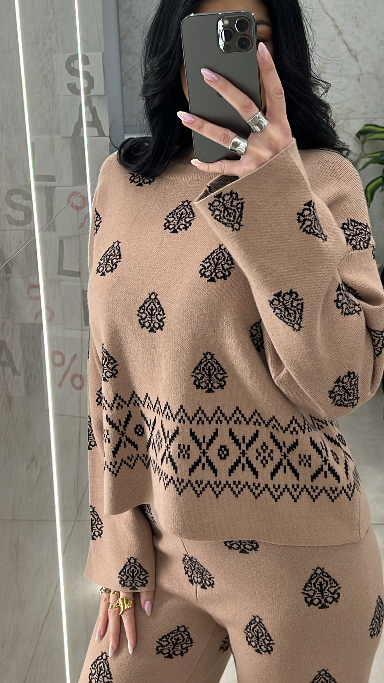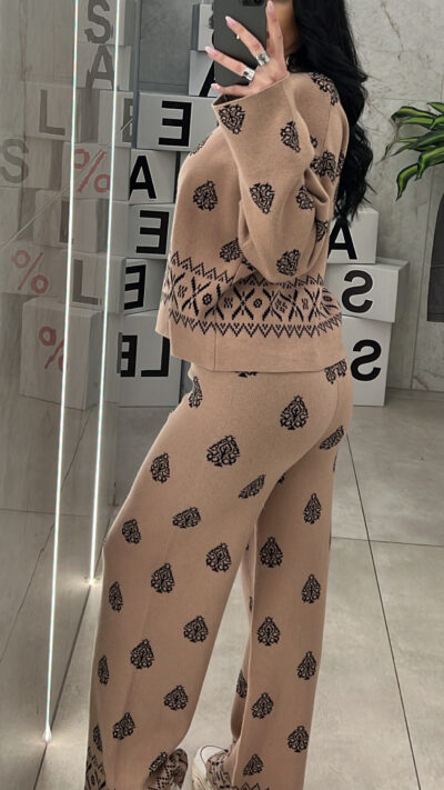 Σετ πλεκτό με σχέδιο  ,η παντελόνα διαθέτει λάστιχο στην μεση και η μπλούζα είναι με λαιμόκοψη.