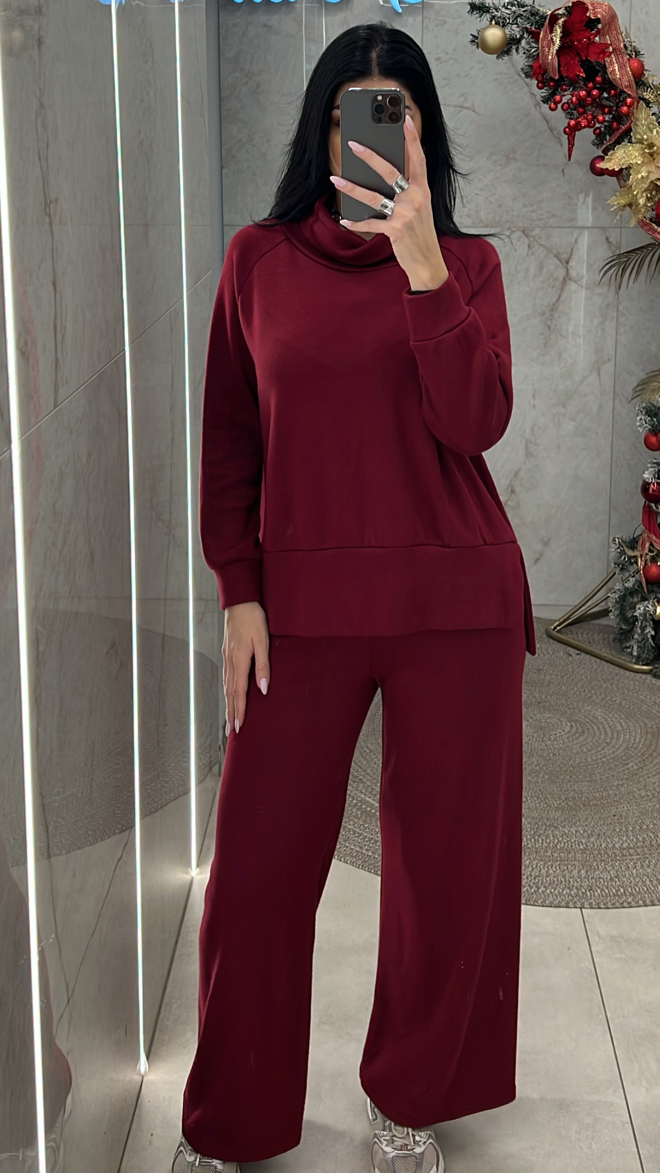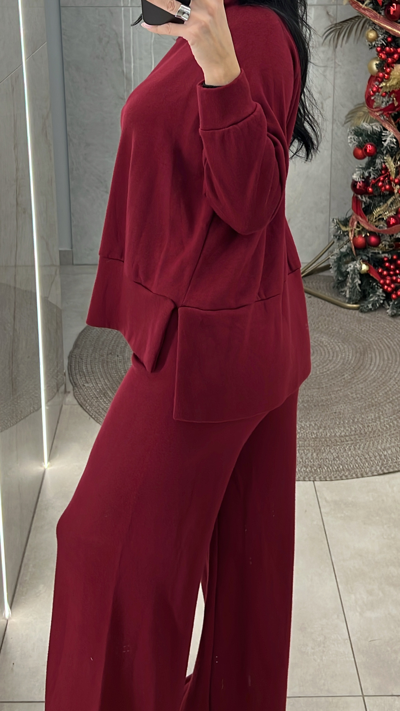 Σετ πλεκτό με μπλούζα με ζιβάγκο που έχει ανοίγματα κάτω στα πλάγια και παντελόνι με λάστιχο στη μέση