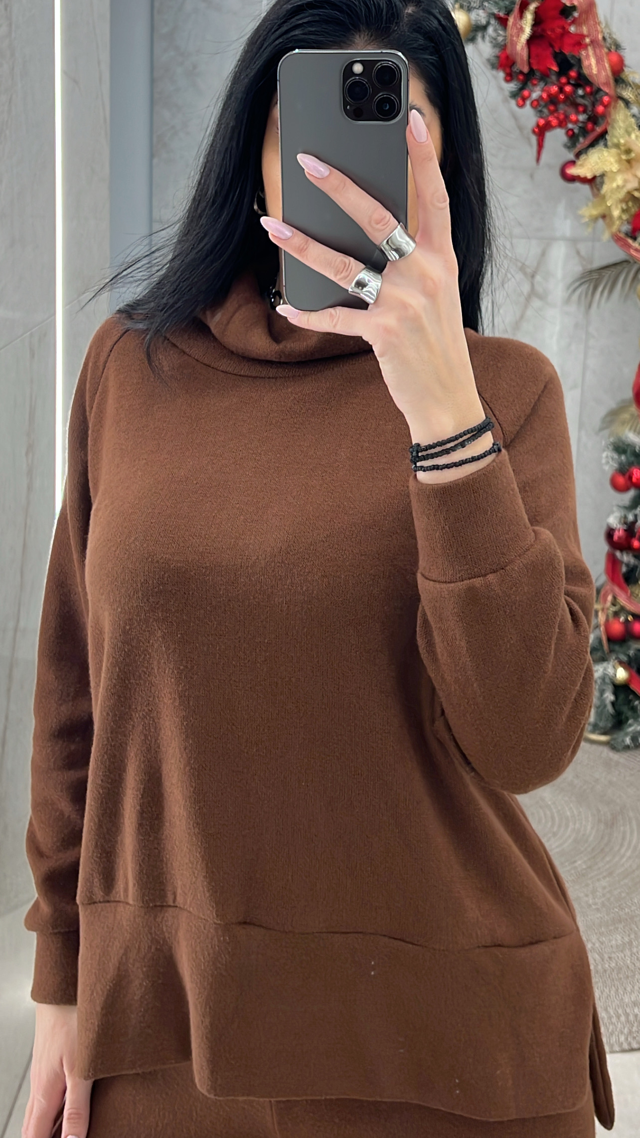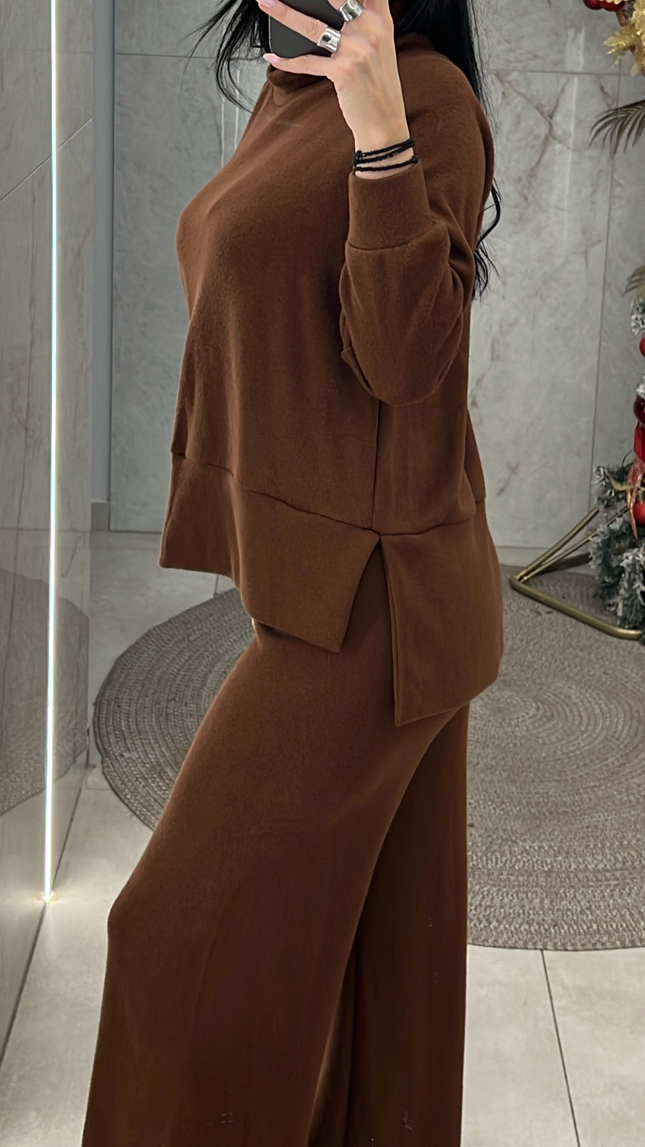Σετ πλεκτό με μπλούζα με ζιβάγκο που έχει ανοίγματα κάτω στα πλάγια και παντελόνι με λάστιχο στη μέση