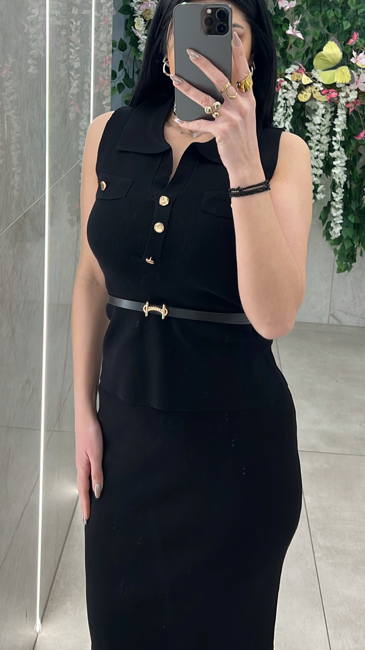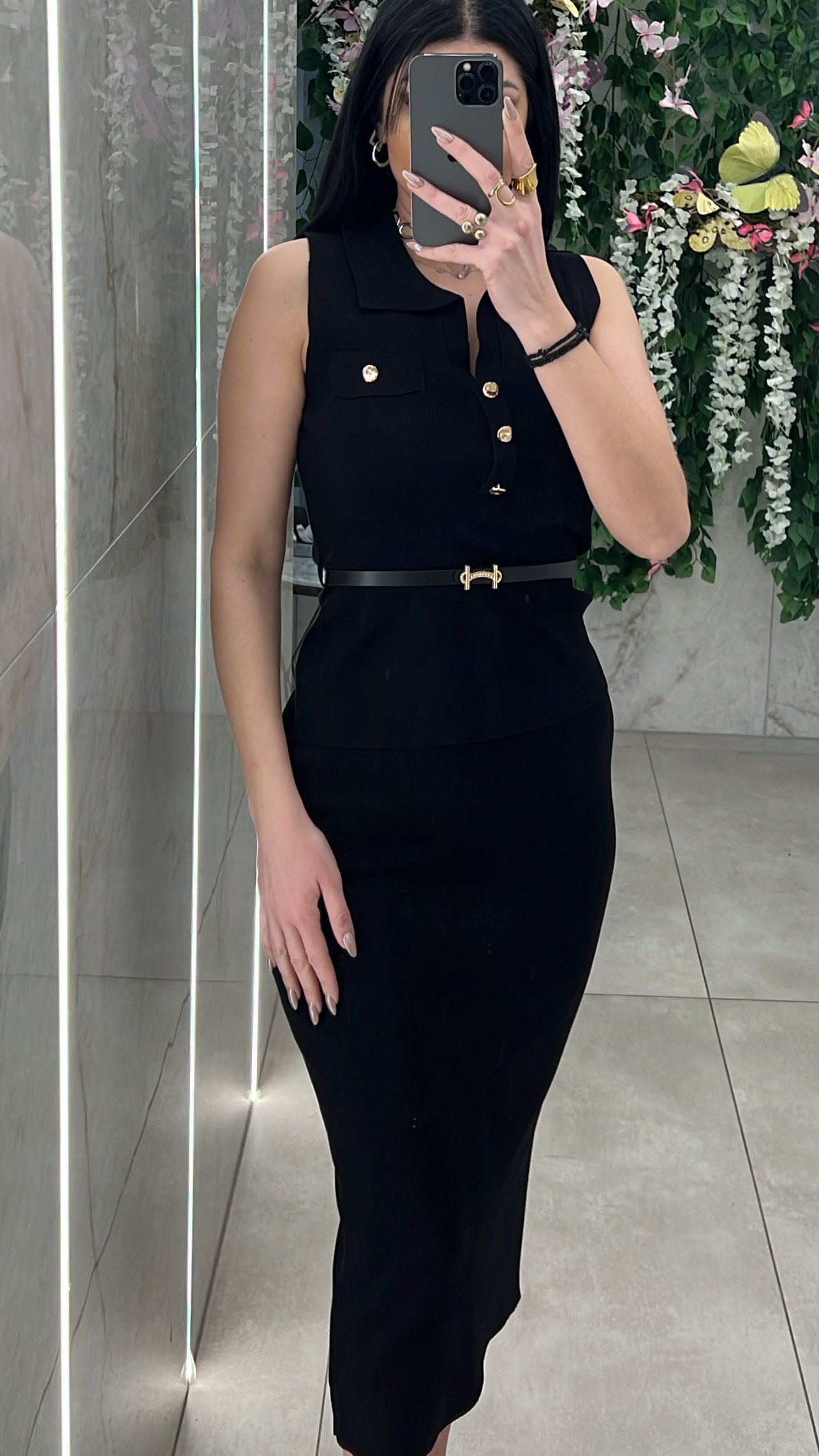 Σετ πλεκτο , μπλουζα αμάνικη με διακοσμητικες τσέπες ,χρυσα κουμπια και δικη της ζώνη και φουστα με λαστιχο στην μέση και σκίσιμο πισω .