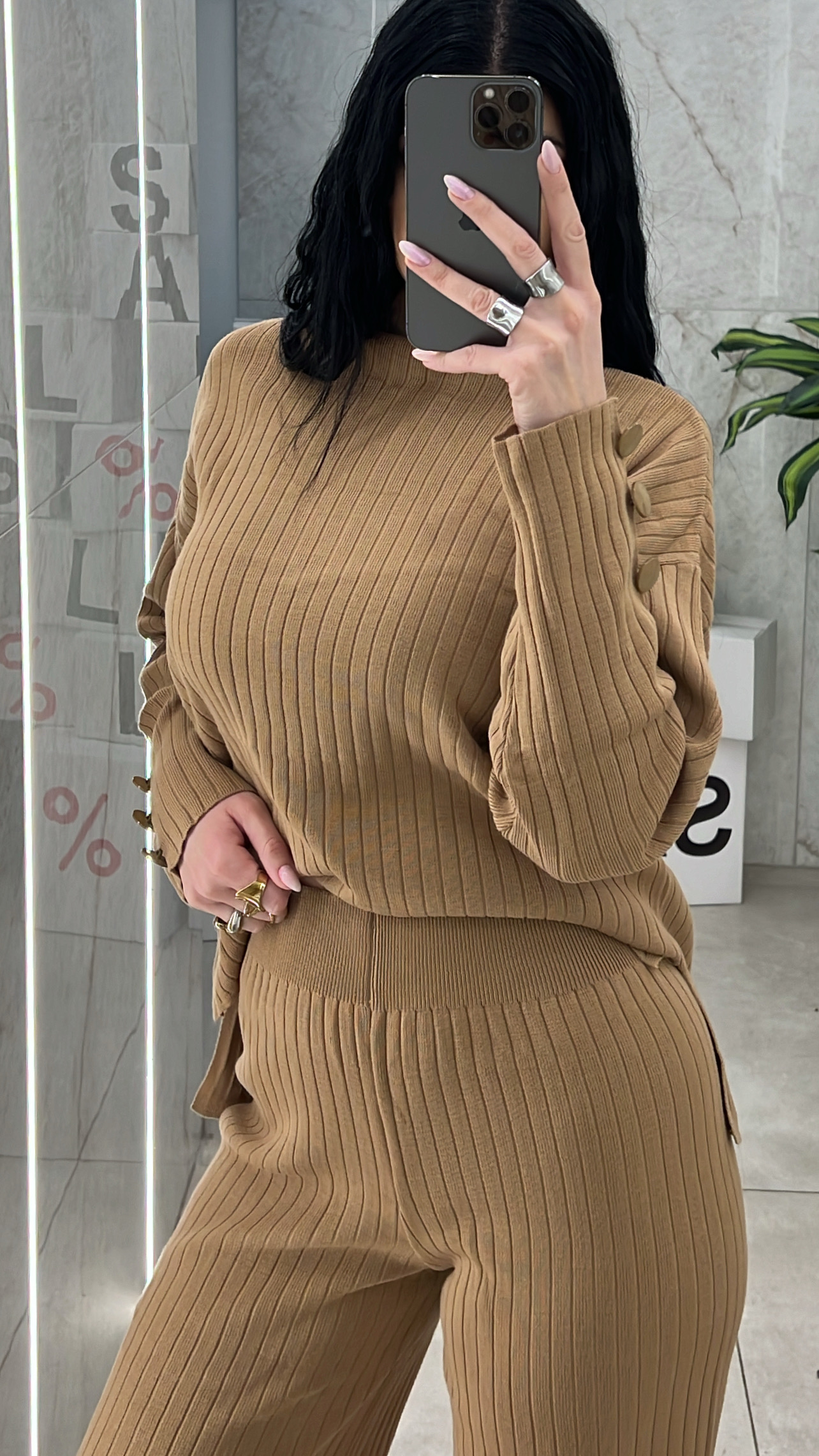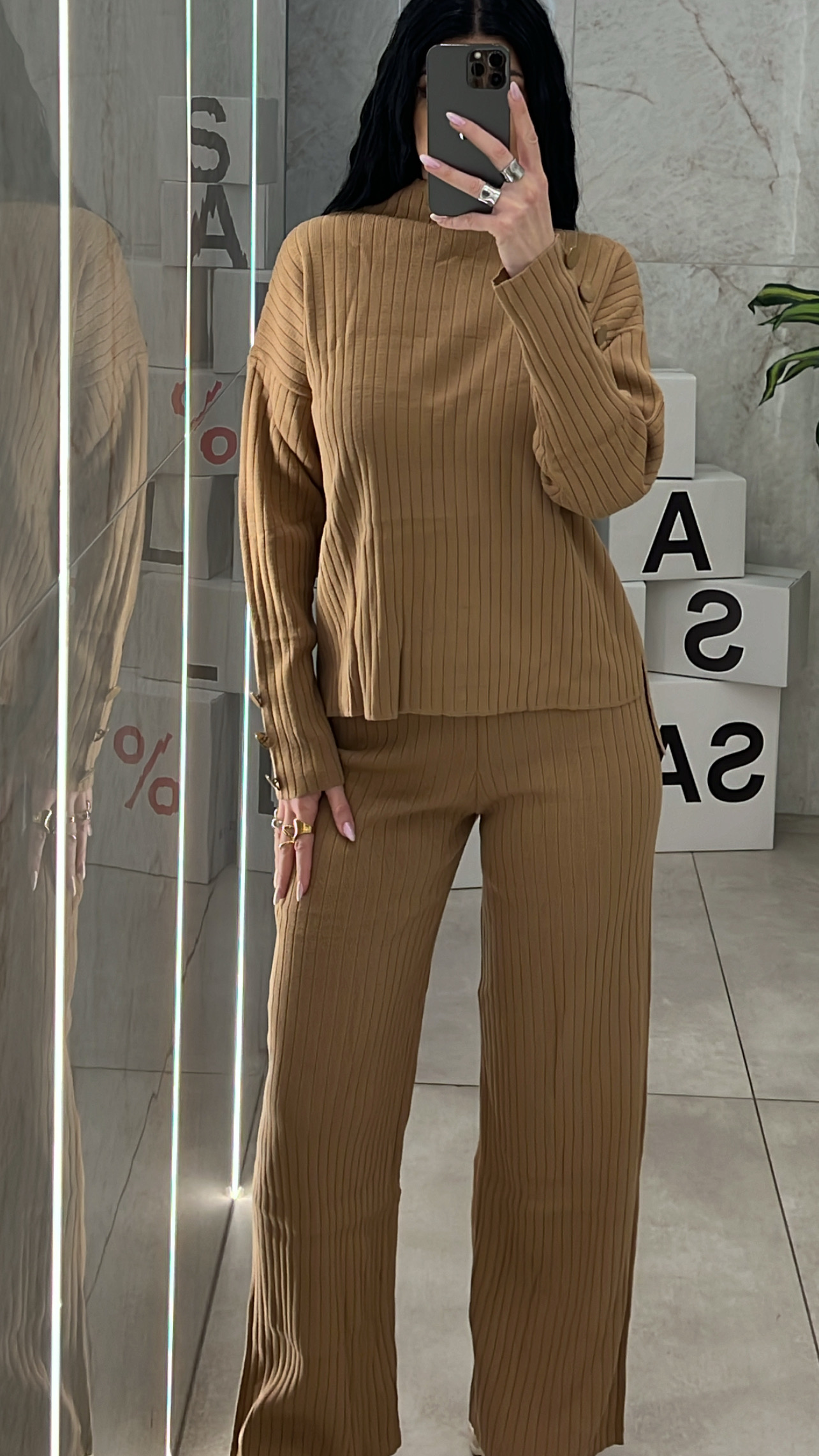 Σετ πλεκτό με ψηλόμεσο παντελόνι και λάστιχο στην μέση και μπλούζα με κουμπιά στα μανίκια .