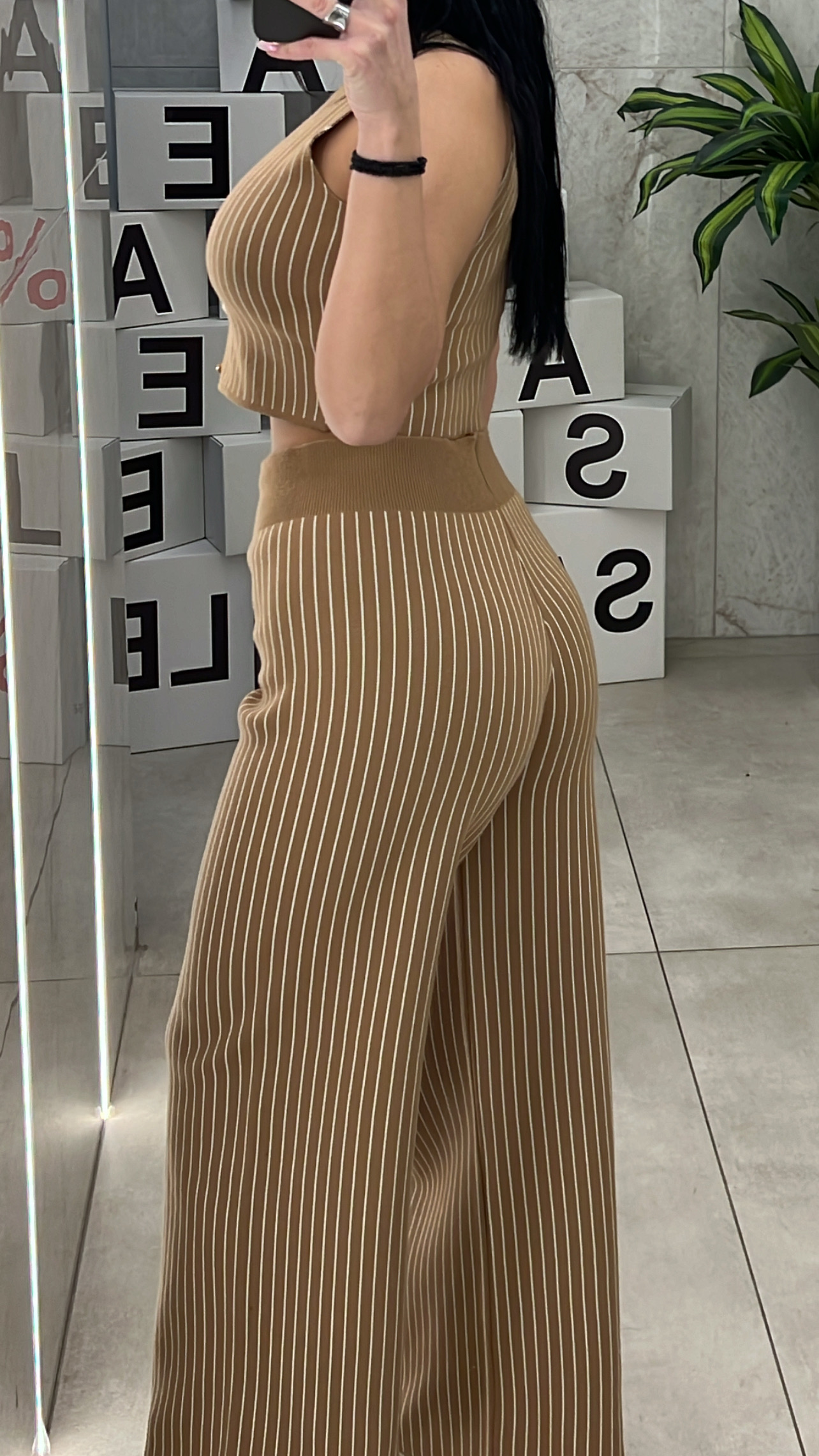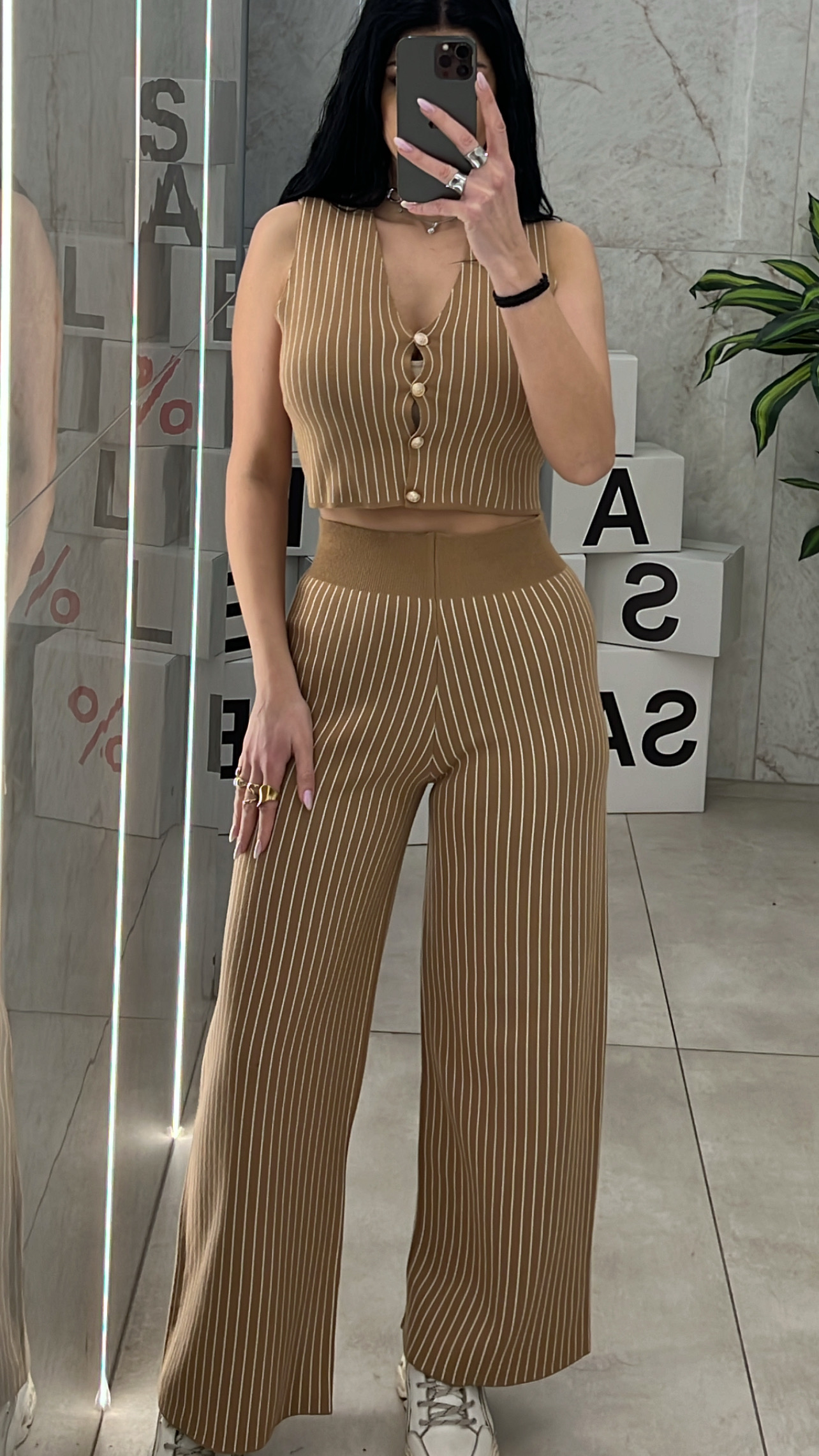 Σετ πλεκτό μαύρο , ψηλόμεση ελαστική παντελόνα με ρίγες και αμάνικο γιλέκο που κλείνει με χρυσά κουμπιά.