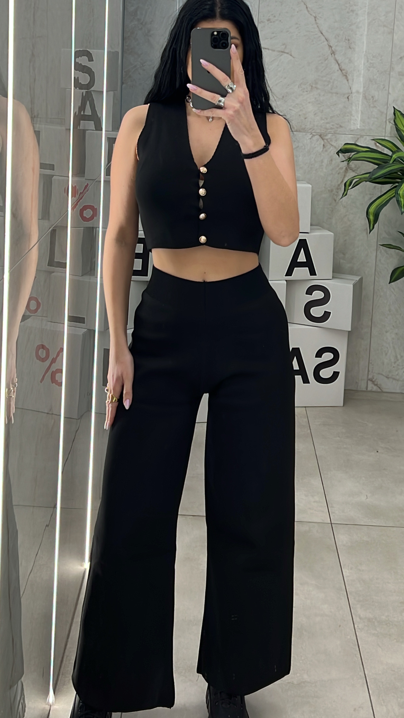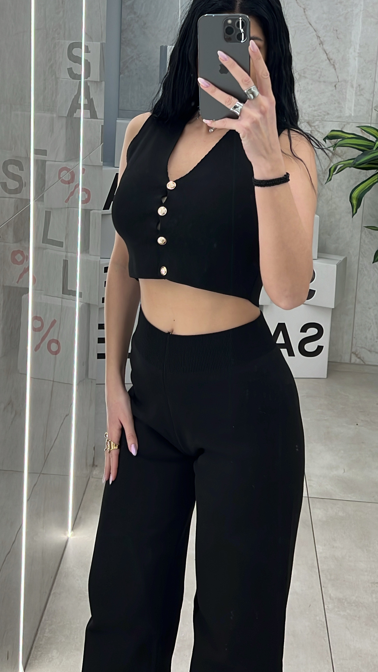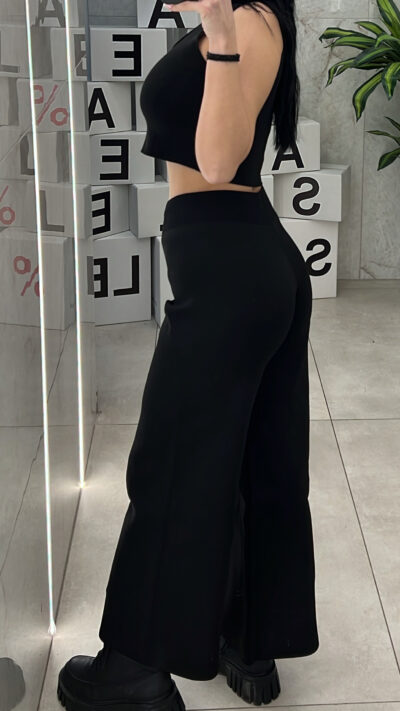 Σετ πλεκτό μαύρο , ψηλόμεση ελαστική παντελόνα και αμάνικο γιλέκο που κλείνει με χρυσά κουμπιά.