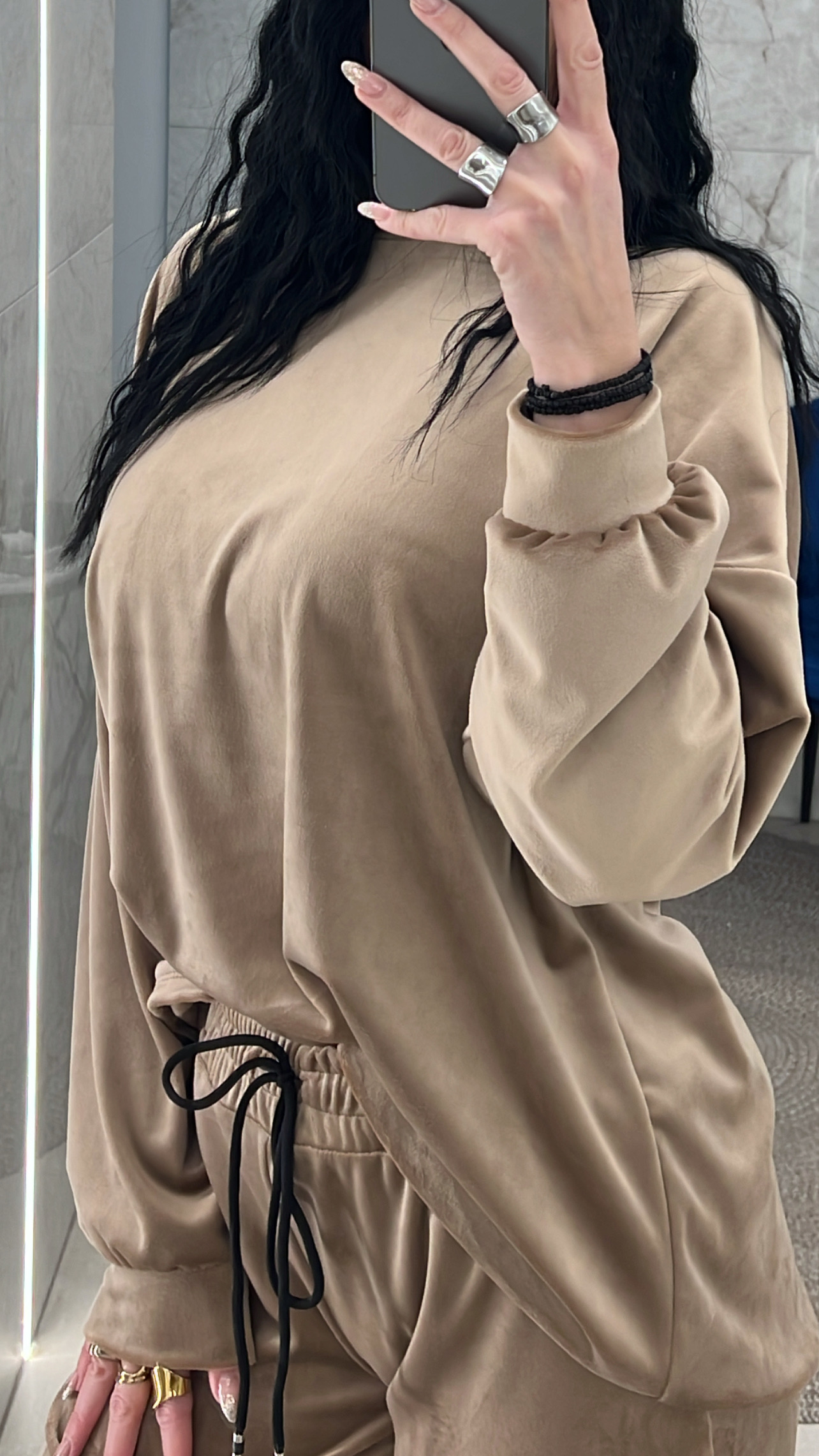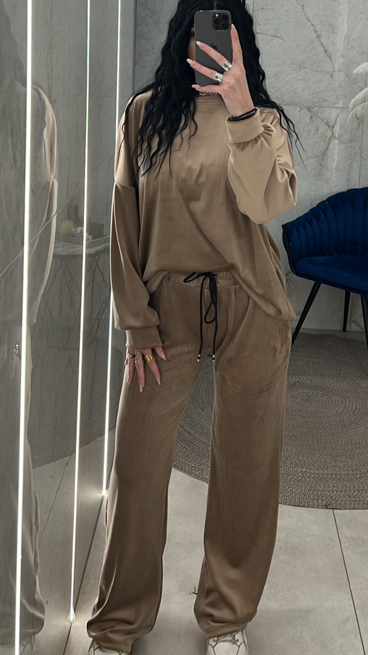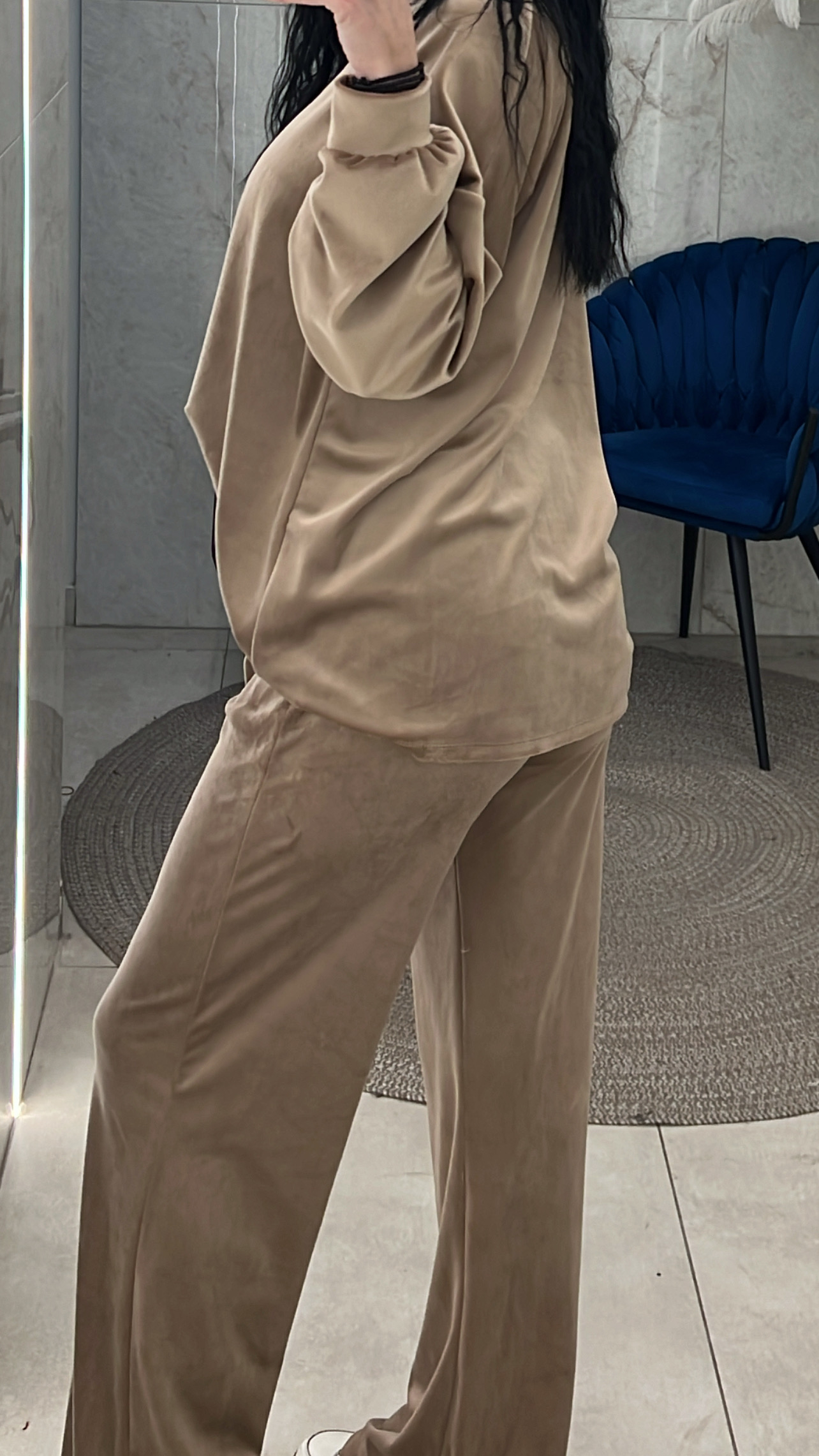 Σετ βελουτέ. Η μπλούζα είναι με λαιμόκοψη και το παντελόνι είναι με λάστιχο και κορδόνι στην μέση
