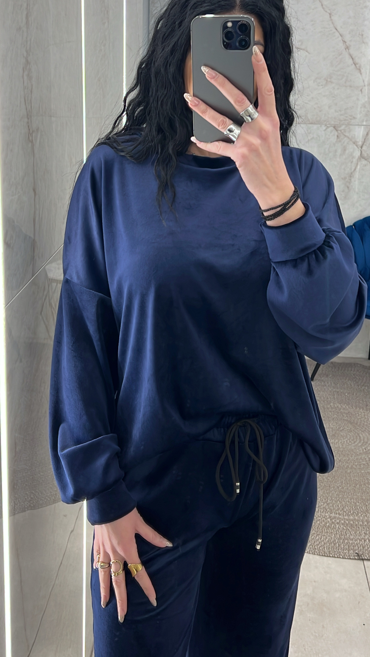 Σετ βελουτέ. Η μπλούζα είναι με λαιμόκοψη και το παντελόνι είναι με λάστιχο και κορδόνι στην μέση