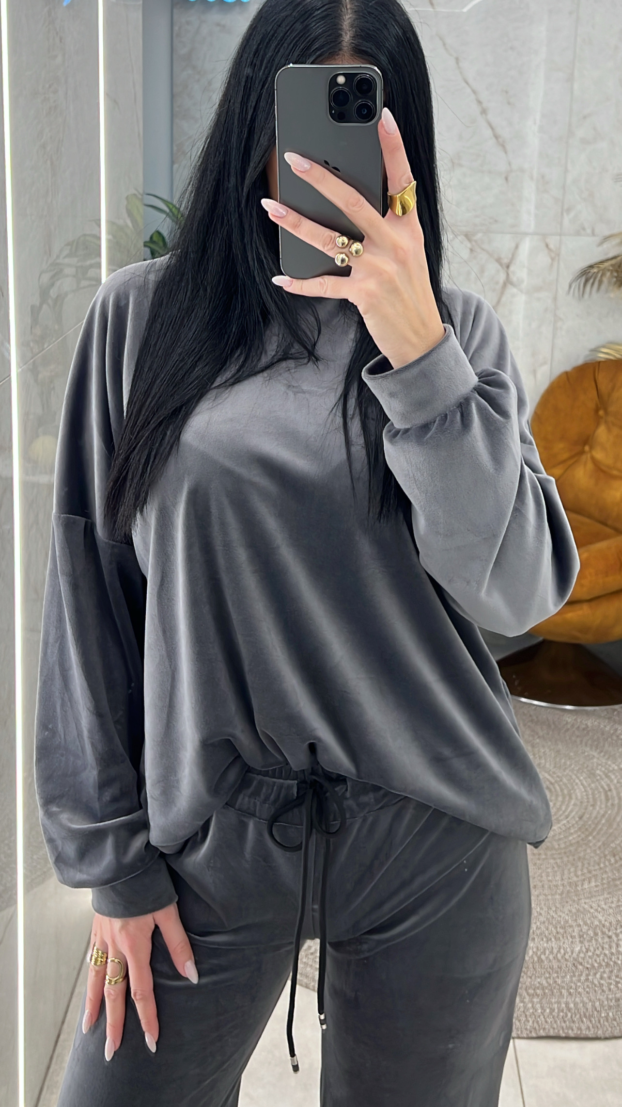 Σετ βελουτέ. Η μπλούζα είναι με λαιμόκοψη και το παντελόνι είναι με λάστιχο και κορδόνι στην μέση